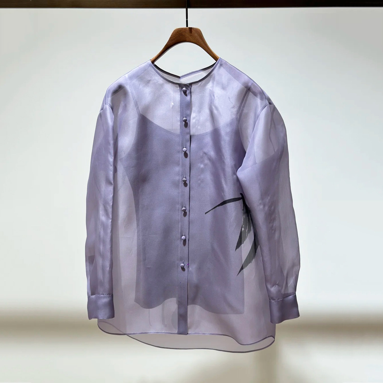 深圳南油高端女装2026春季新款中式真丝欧根纱长袖圆领印花衬衫女
