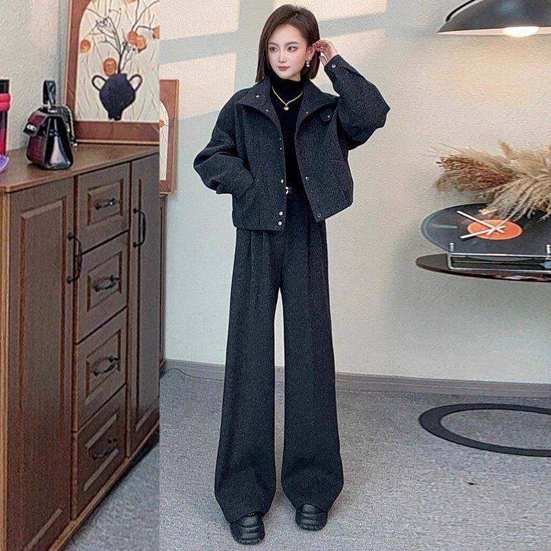 香港代购高级感套装女冬季新款洋气显瘦夹棉保暖外套阔腿裤两件套