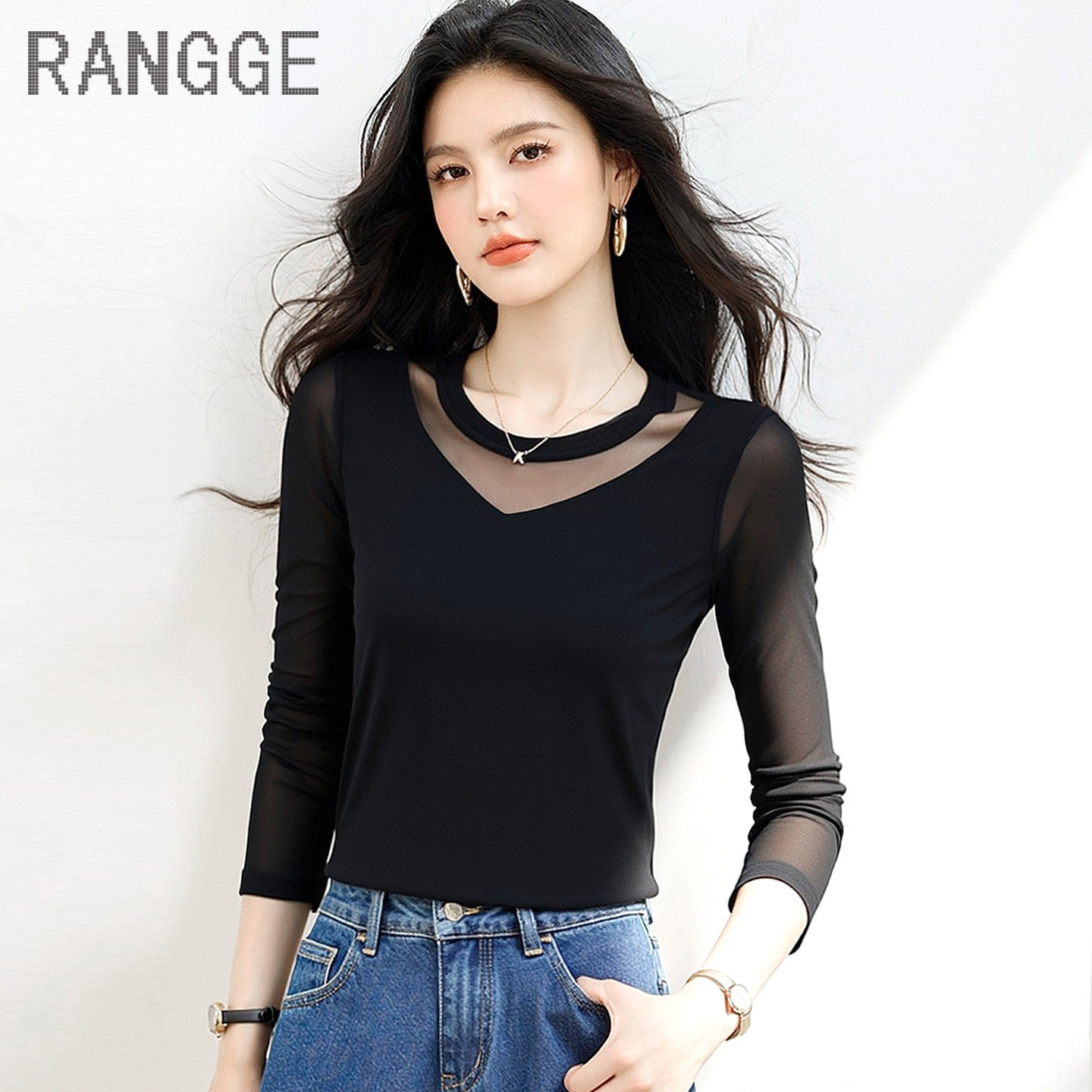 首页> 女装> RANGGE黑色网纱长袖T恤女洋气薄款透视显瘦打底衫高弹瑜伽上衣