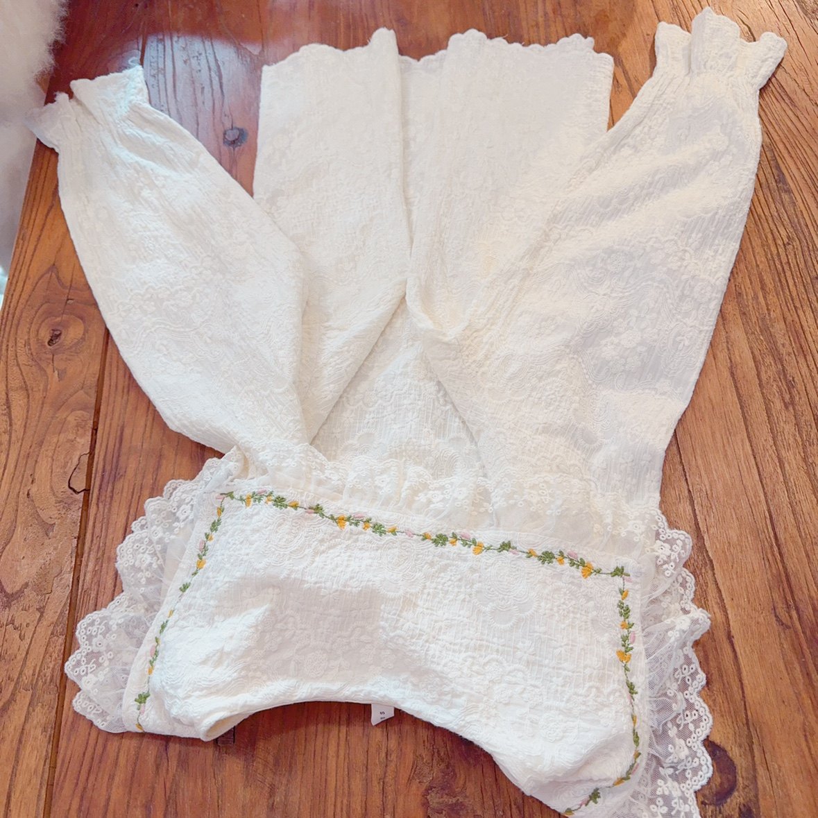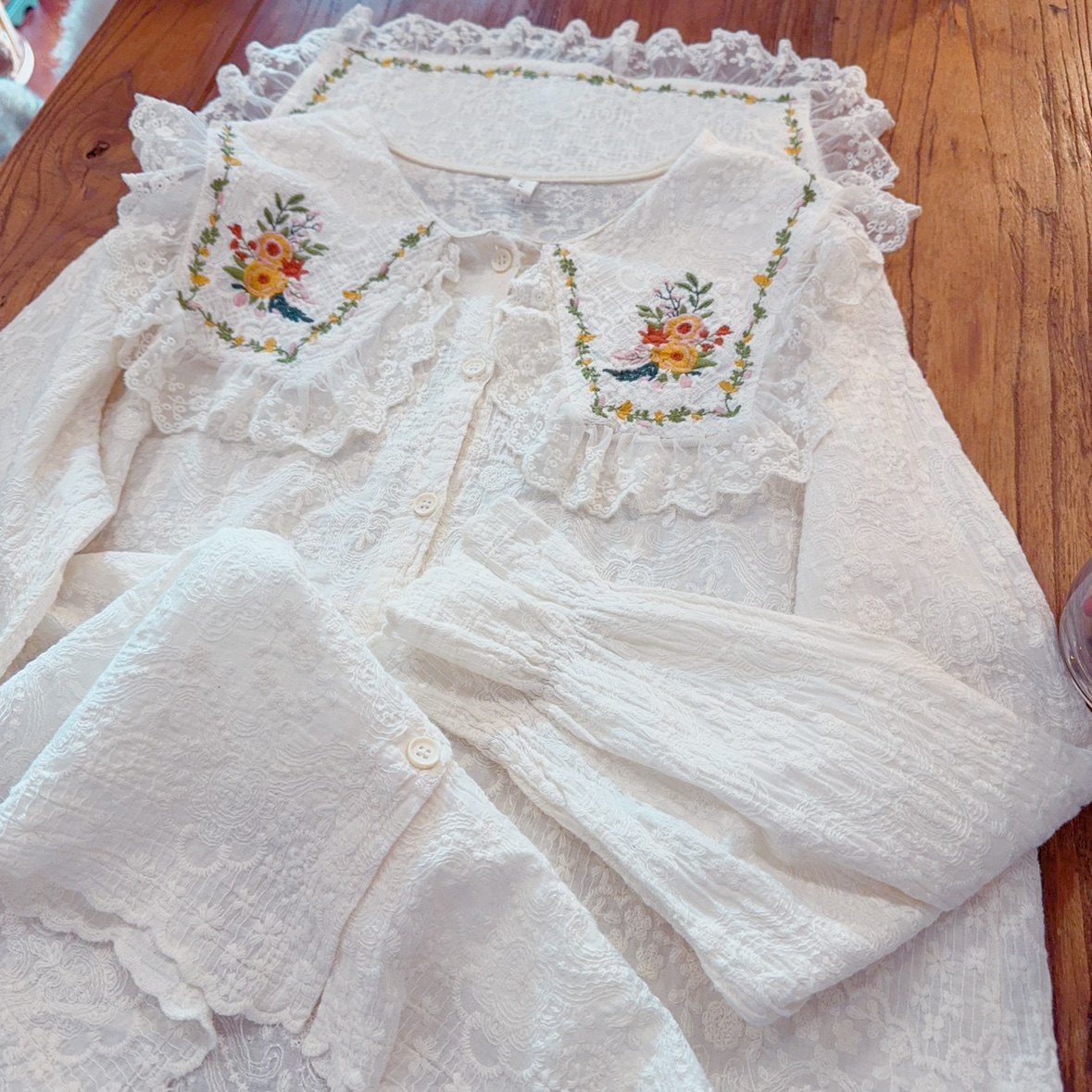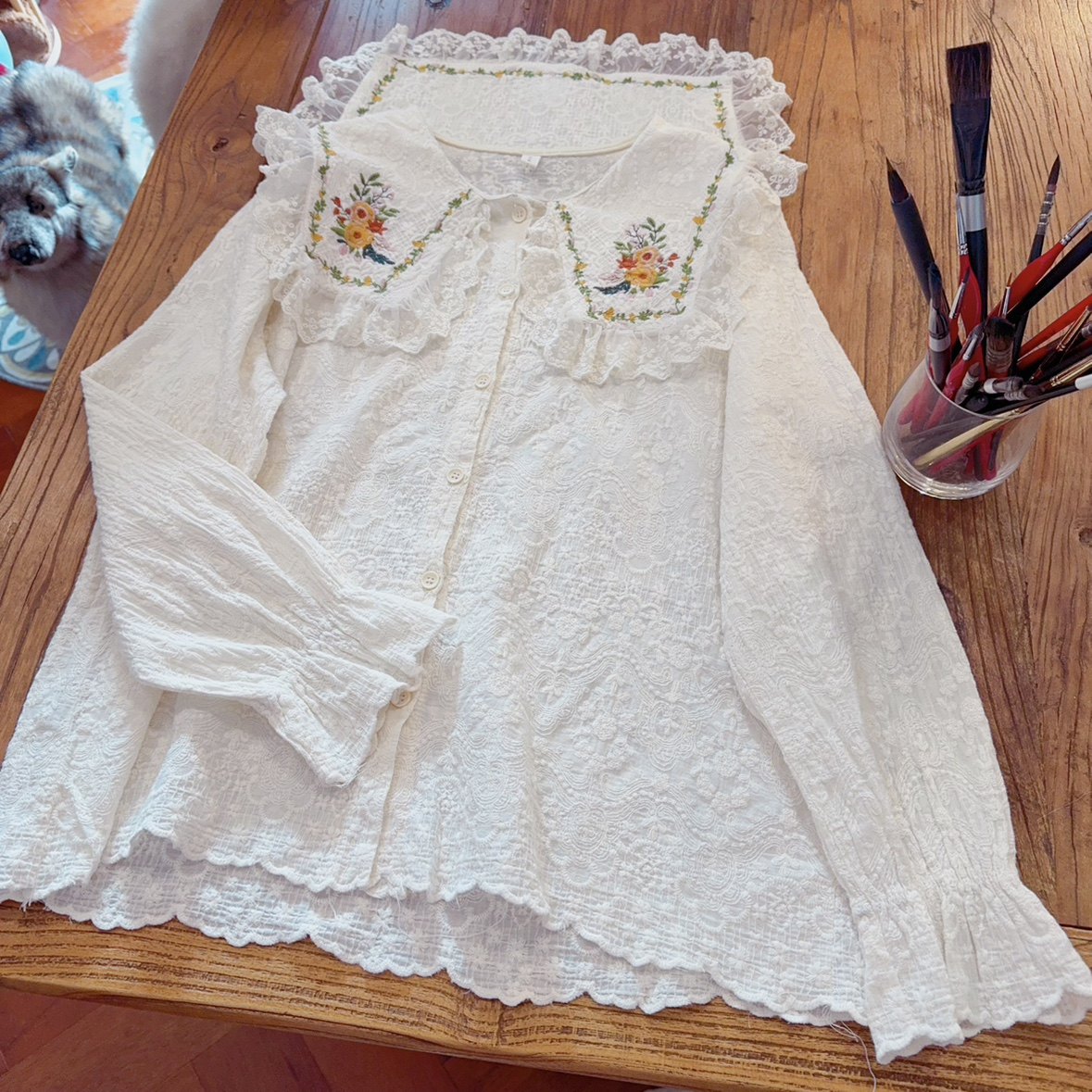 打底好物 刺绣提花 娃娃领 荷叶边甜美奶杏色 温柔蕾丝衫长袖衬衫