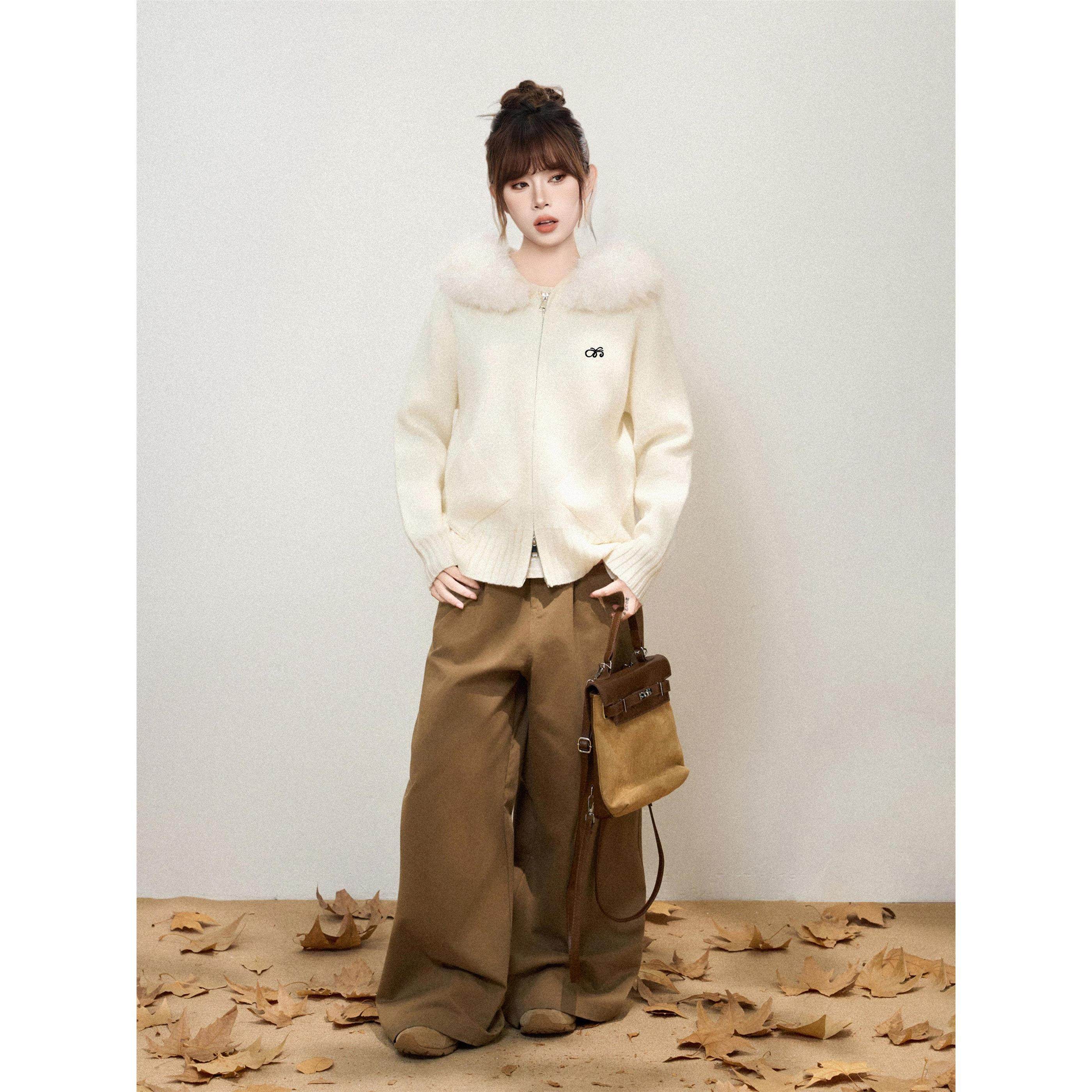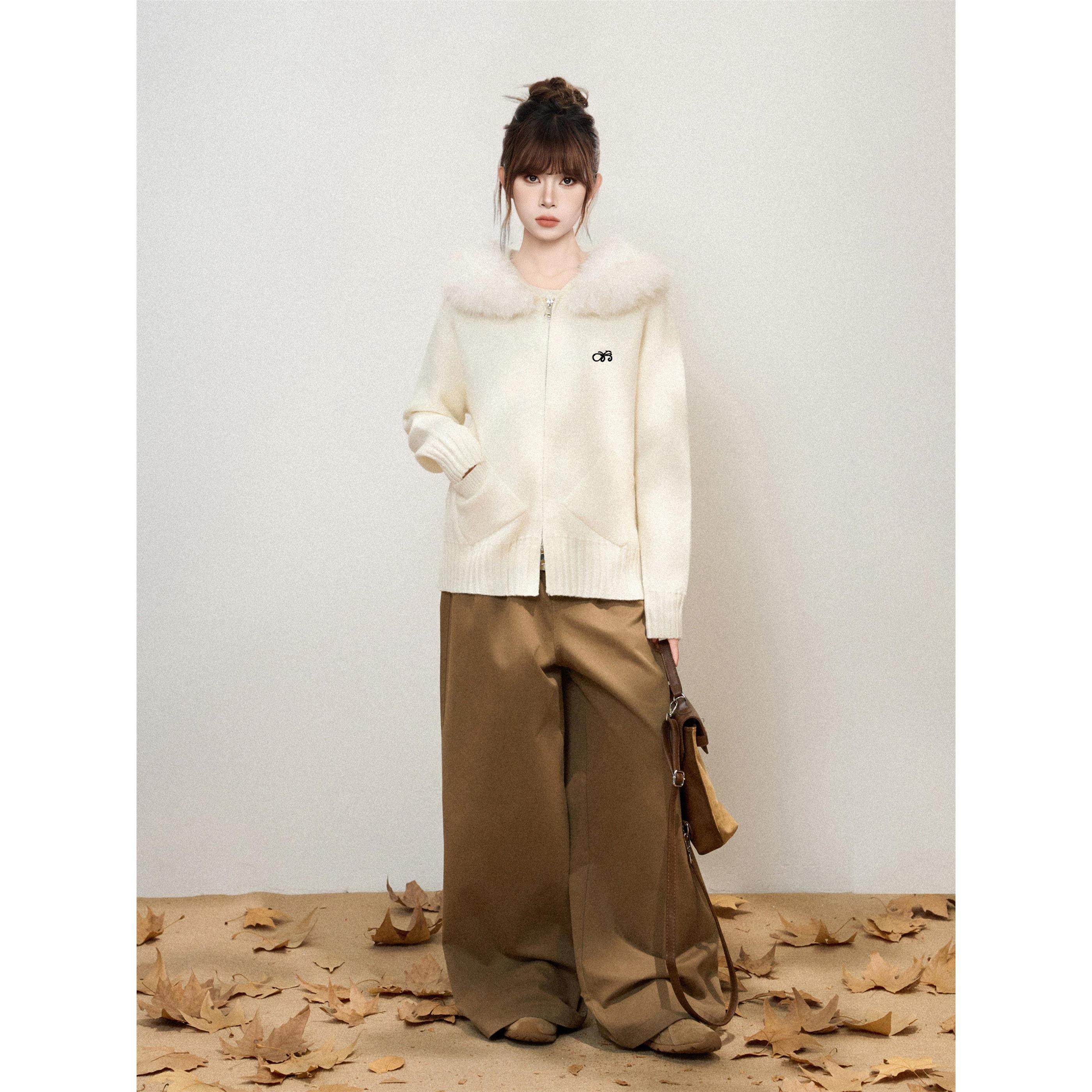 白色毛领连帽双拉炼针织毛衣外套女秋季秋冬宽松外搭开衫卫衣上衣