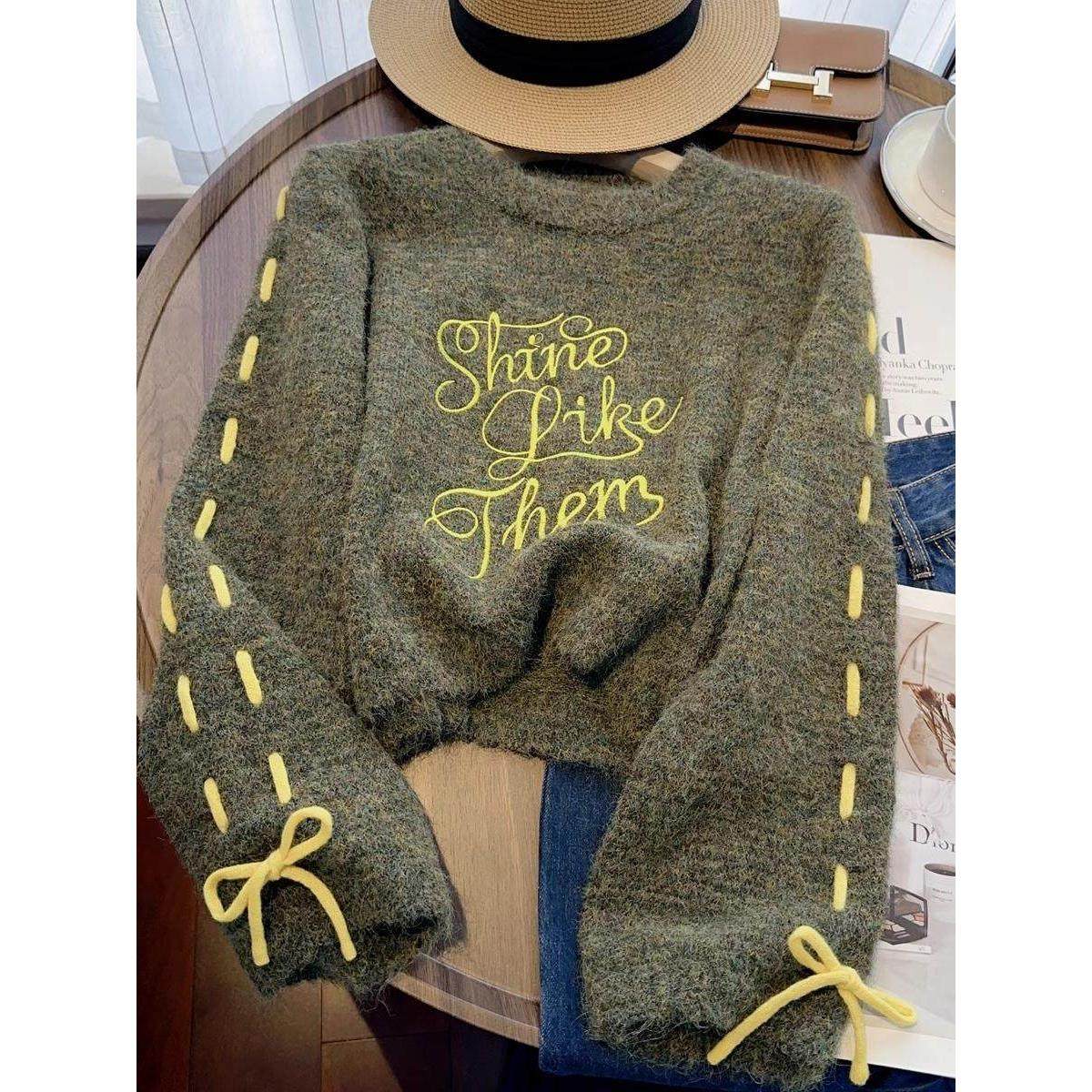 毛衣女春季2025年新款宽松慵懒风短款抽绳字母刺绣圆领针织衫上衣