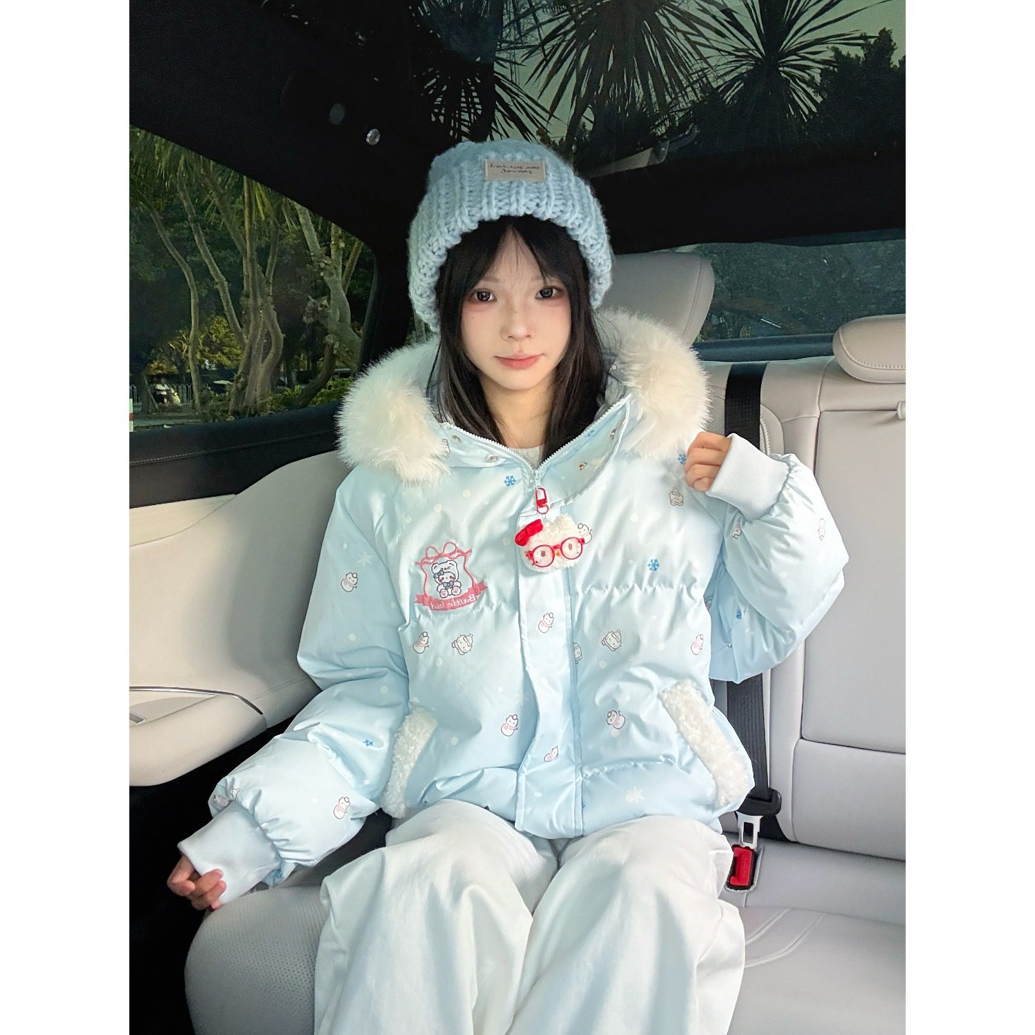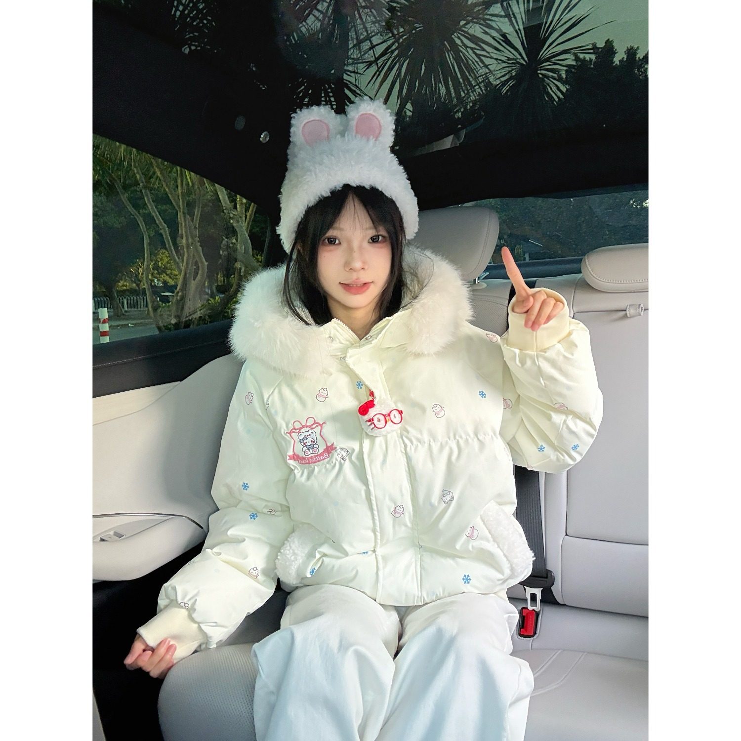 奶呼呼满印刺绣毛领棉服女冬季加厚保暖宽松甜美学院宽松连帽外套