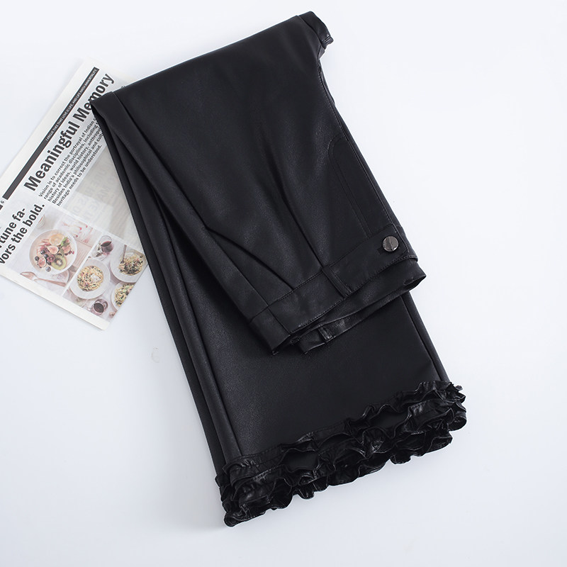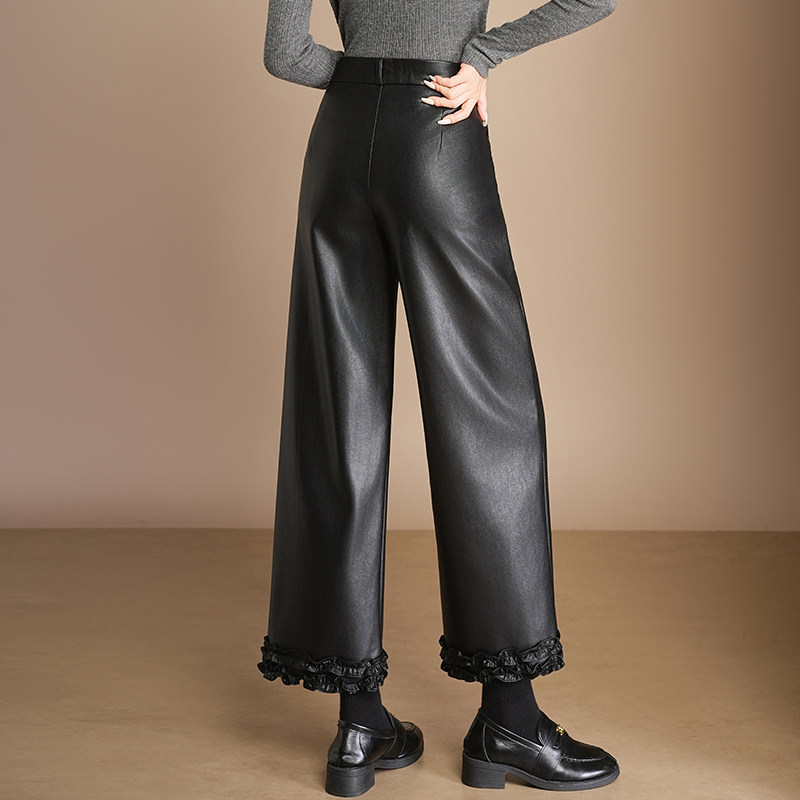 木耳花边PU皮裤九分阔腿裤女2025新款秋冬高腰宽松韩版通勤休闲裤