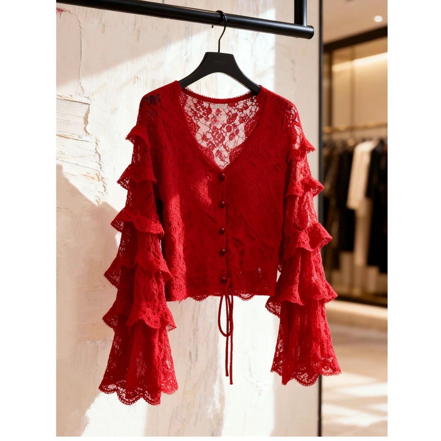 首页> 女装> 法式高级感蕾丝花边袖V领衬衫2026新款独特减龄气质镂空长袖上衣