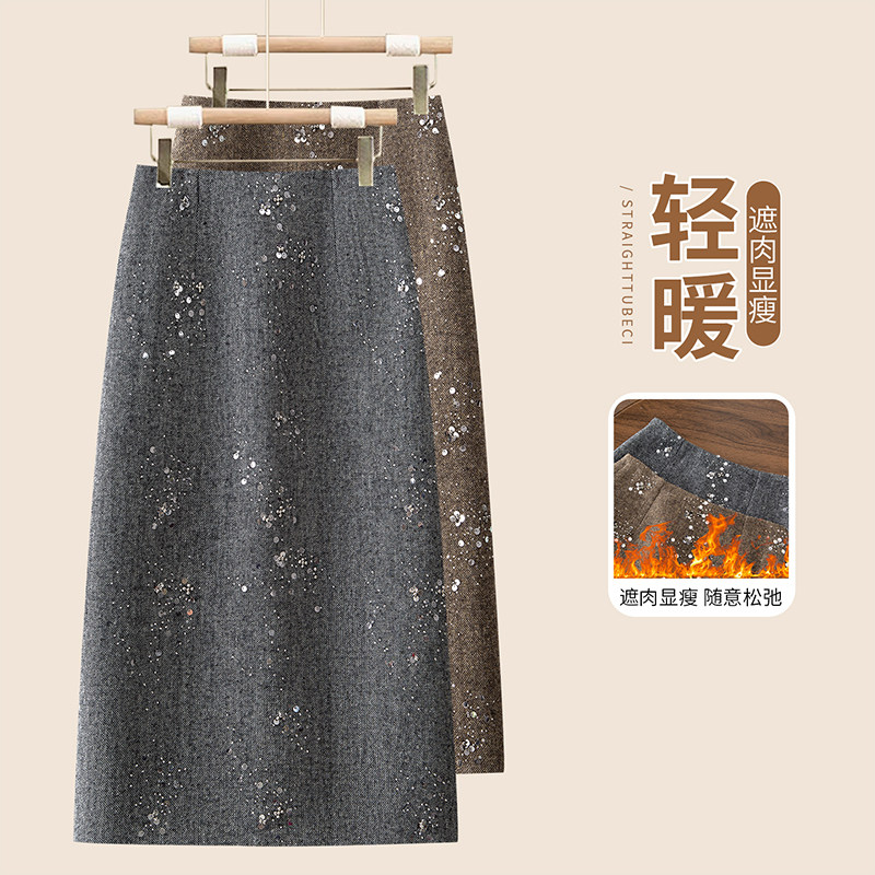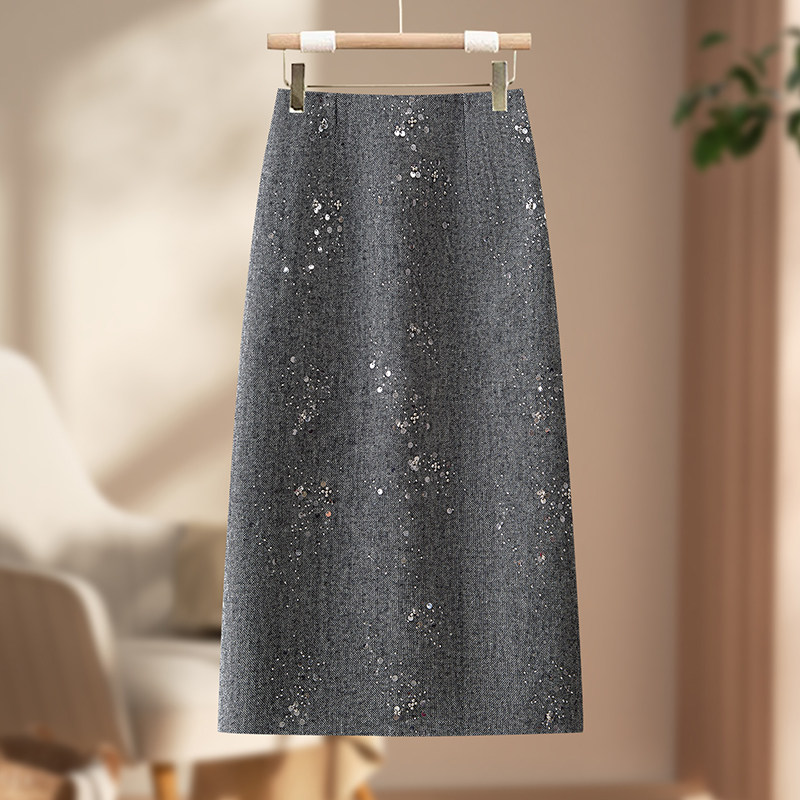 啄木鸟毛呢直筒裙气质半身裙高腰女显瘦拉链亮片轻奢女裙