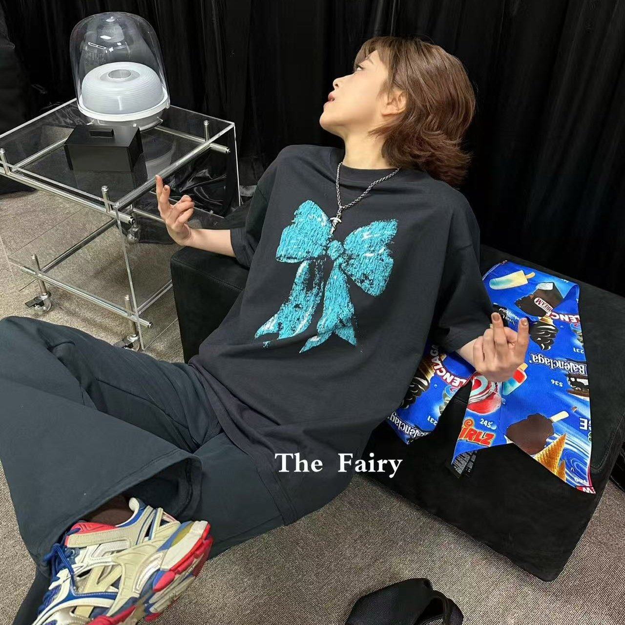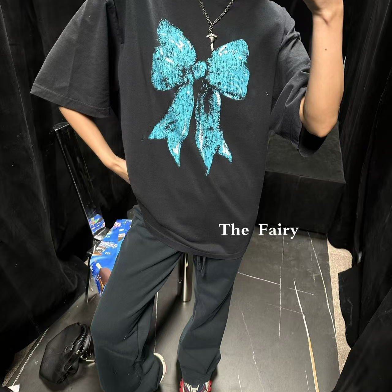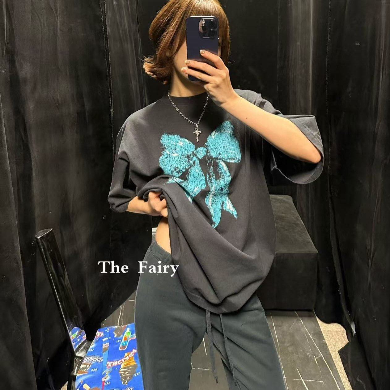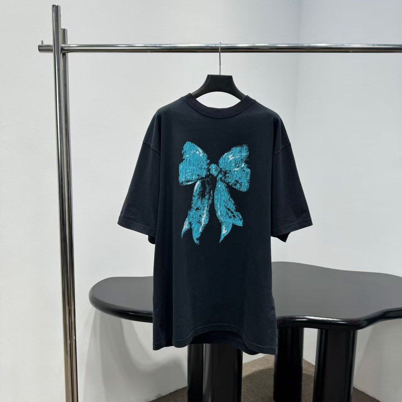 好漂亮蓝色蝴蝶结黑色半袖T恤女2026年早春新款短上衣宽松肥大潮