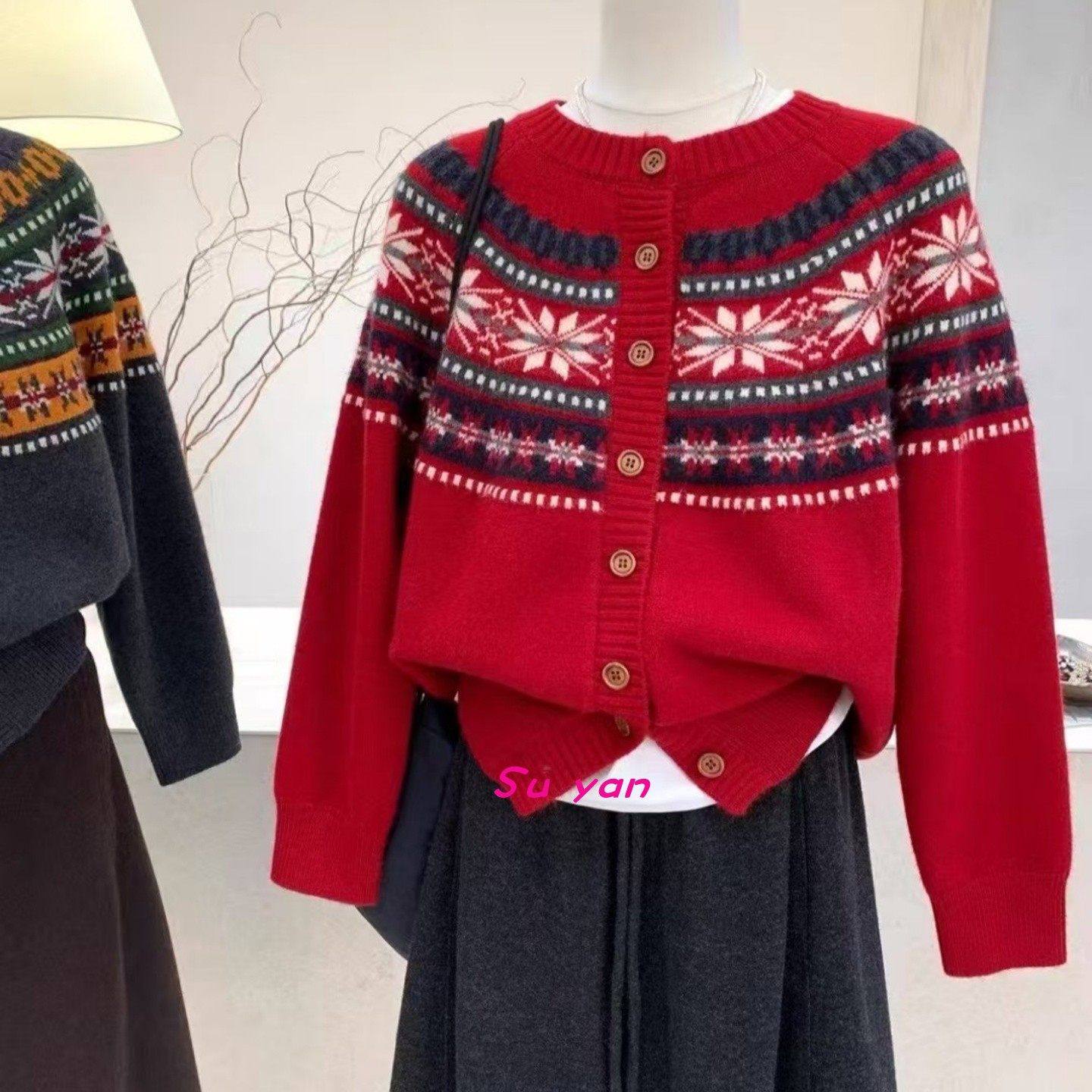 撞色雪花提花甜美减龄学院风针织开衫秋冬新款韩系复古休闲毛衣女