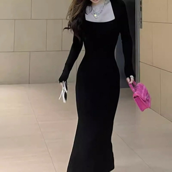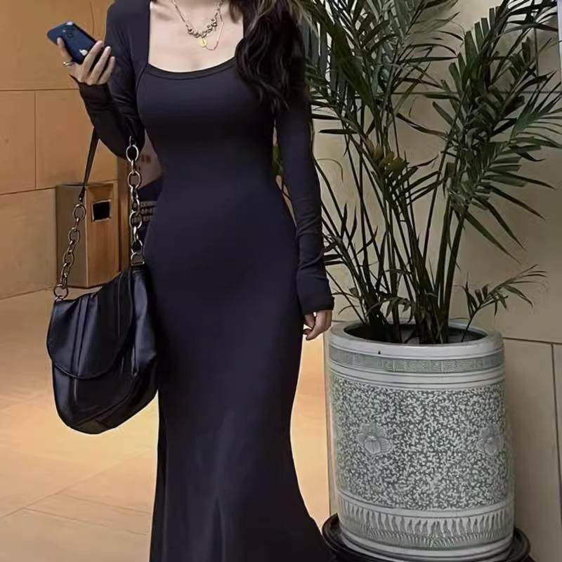 纯欲风紧身包臀长袖鱼尾连衣裙女年春装新款修身打底长款裙子