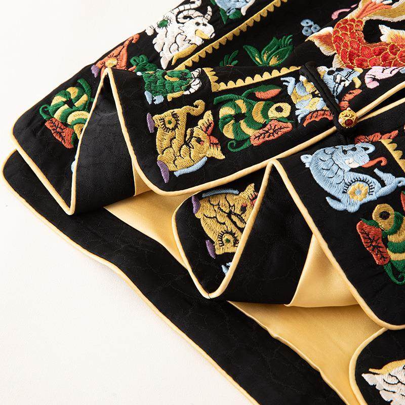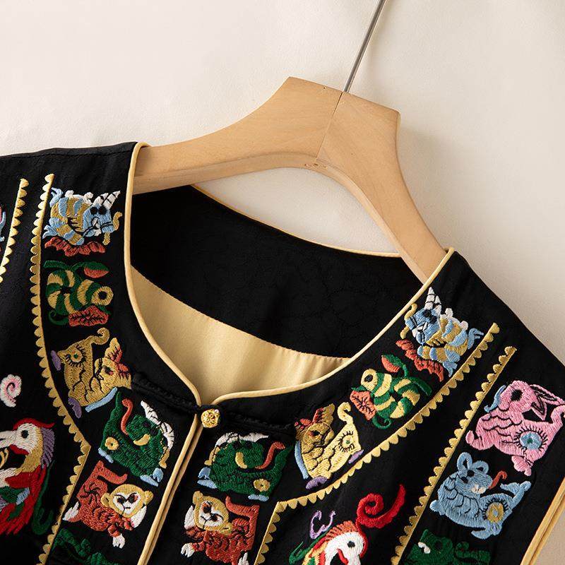 女装设计醋酸龟裂纹生肖刺绣一字盘扣马甲新中式黑色坎肩