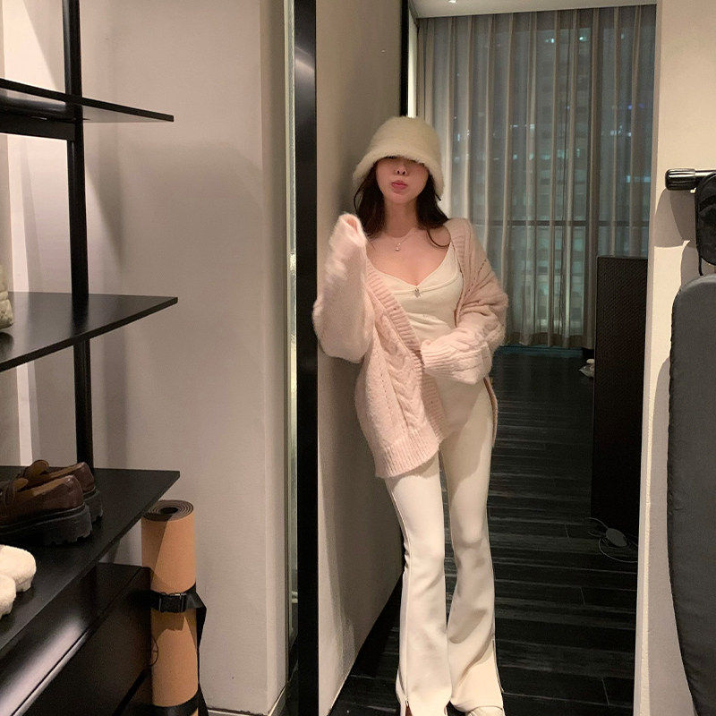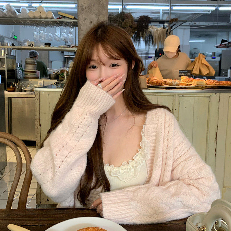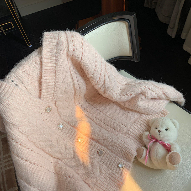 Lukira【柔柔心动】粉色麻花毛衣开衫外套女秋冬宽松慵懒针织上衣