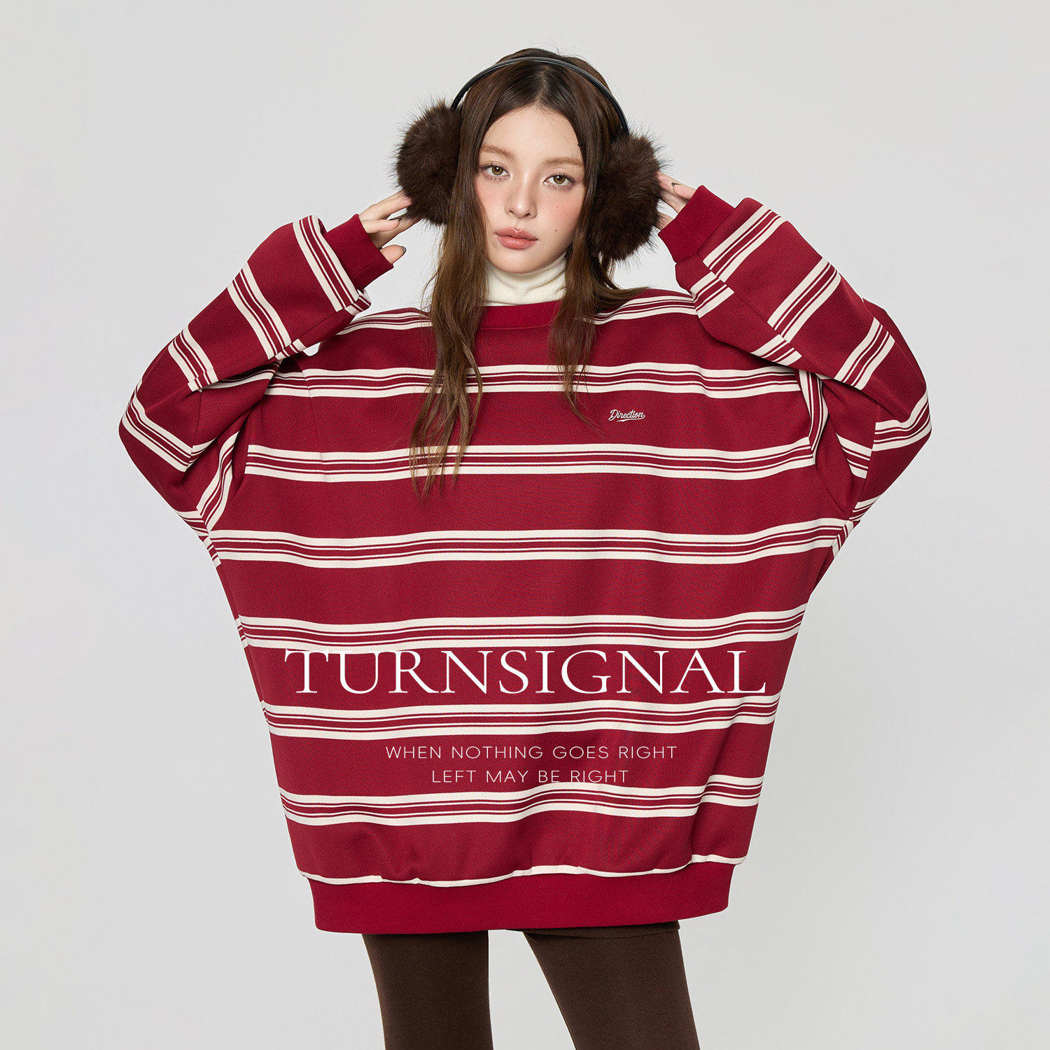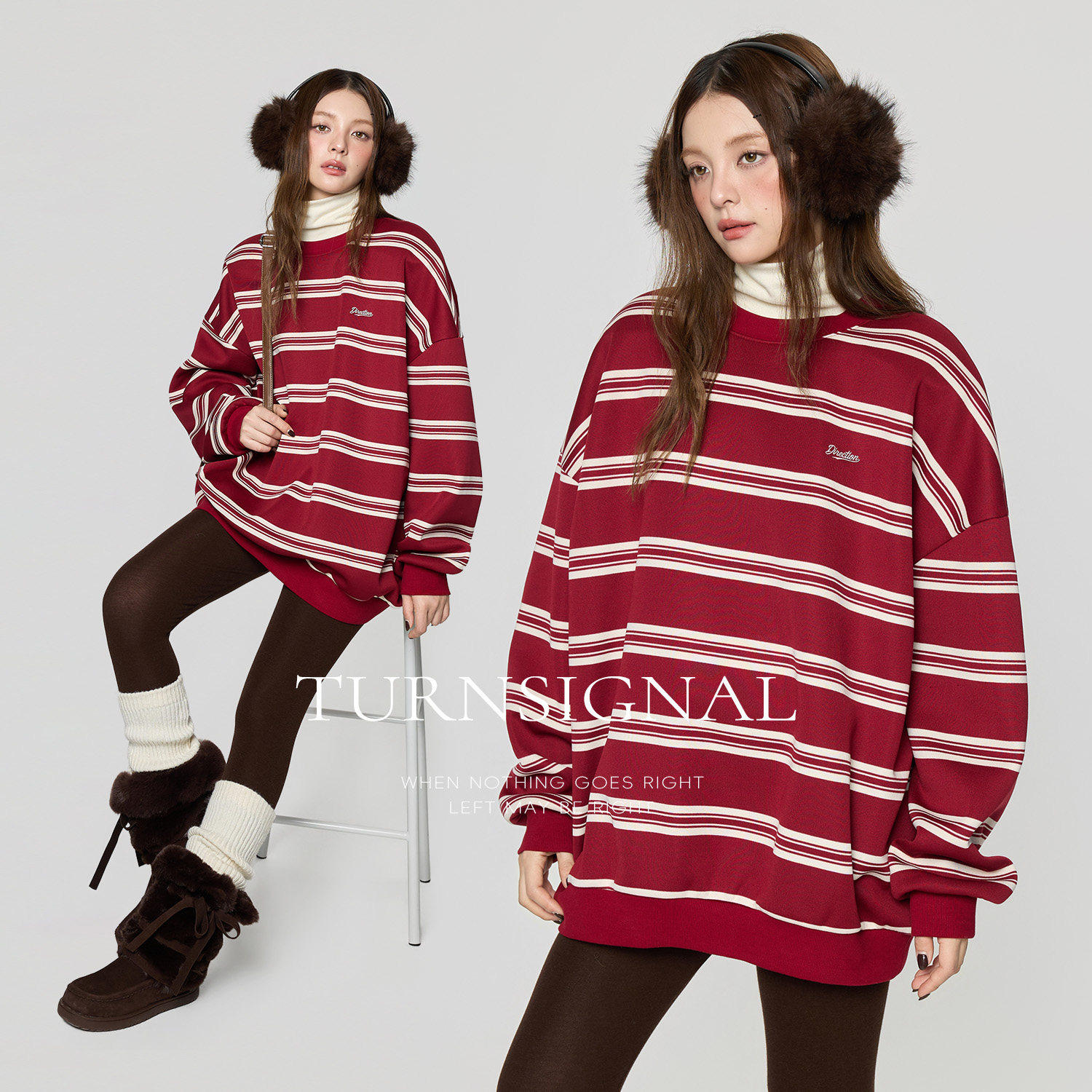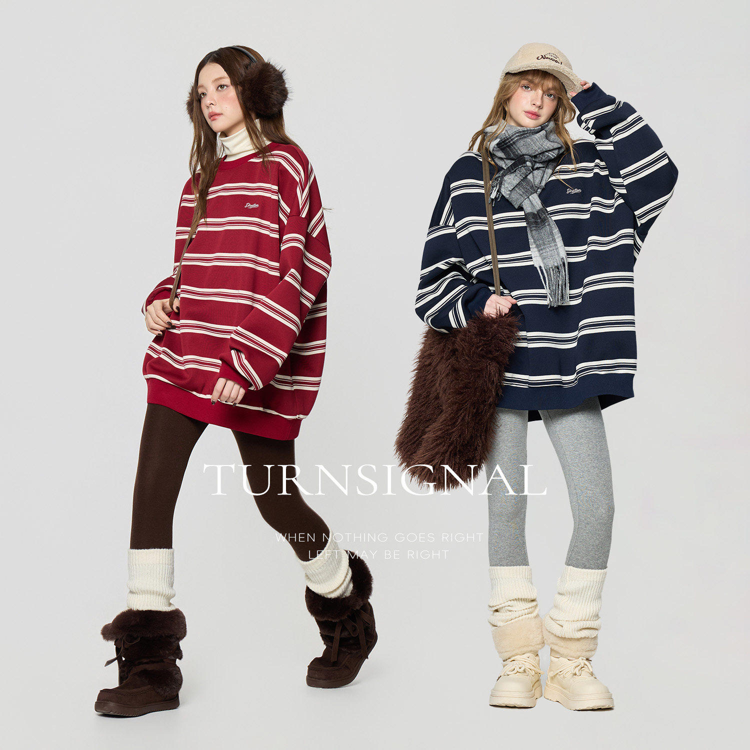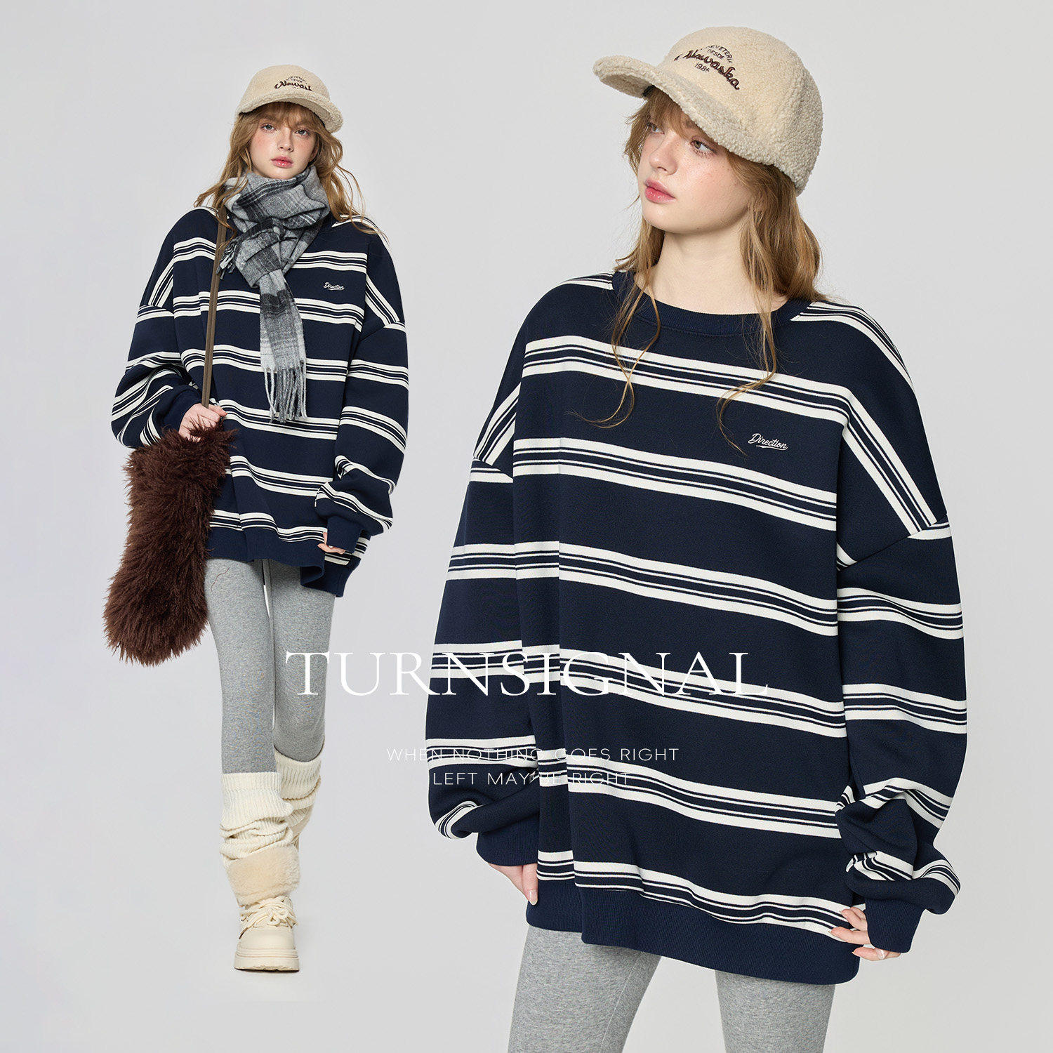 TurnSignal潮牌时尚条纹卫衣女加绒加厚冬季休闲宽松百搭套头上衣