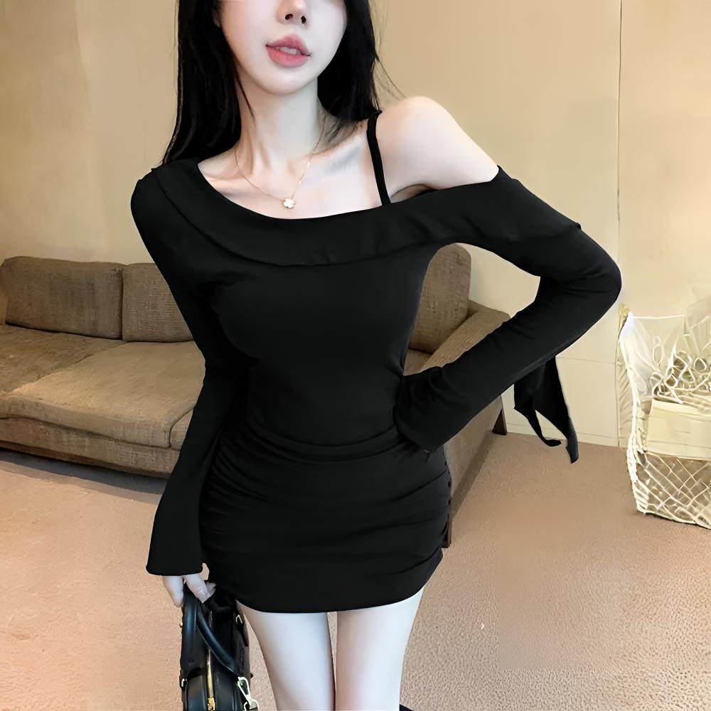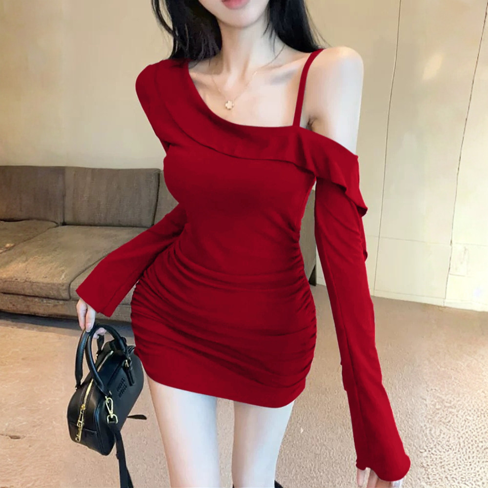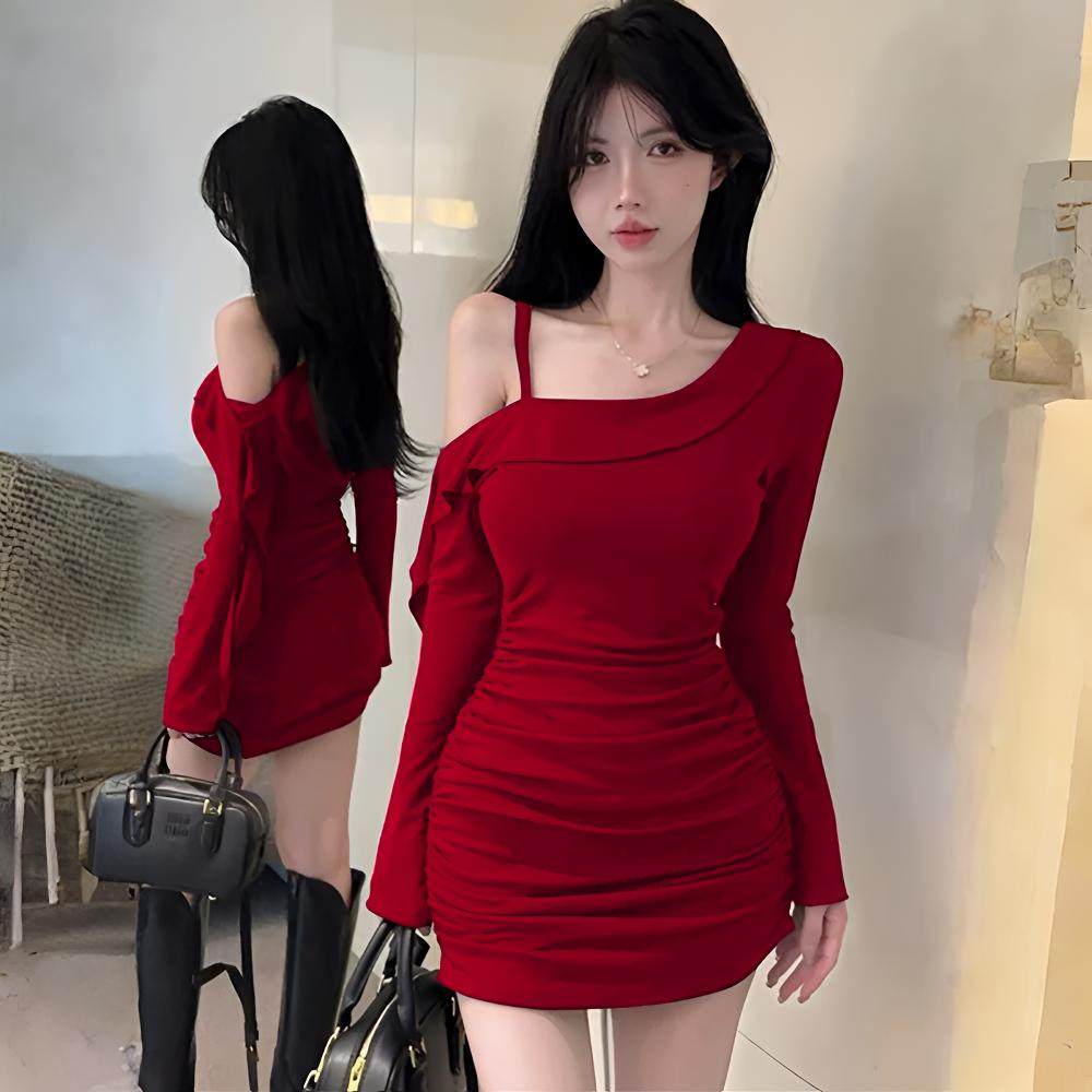 纯欲风性感一字肩荷叶边吊带连衣裙女长袖御姐包臀小妈裙斜肩裙子