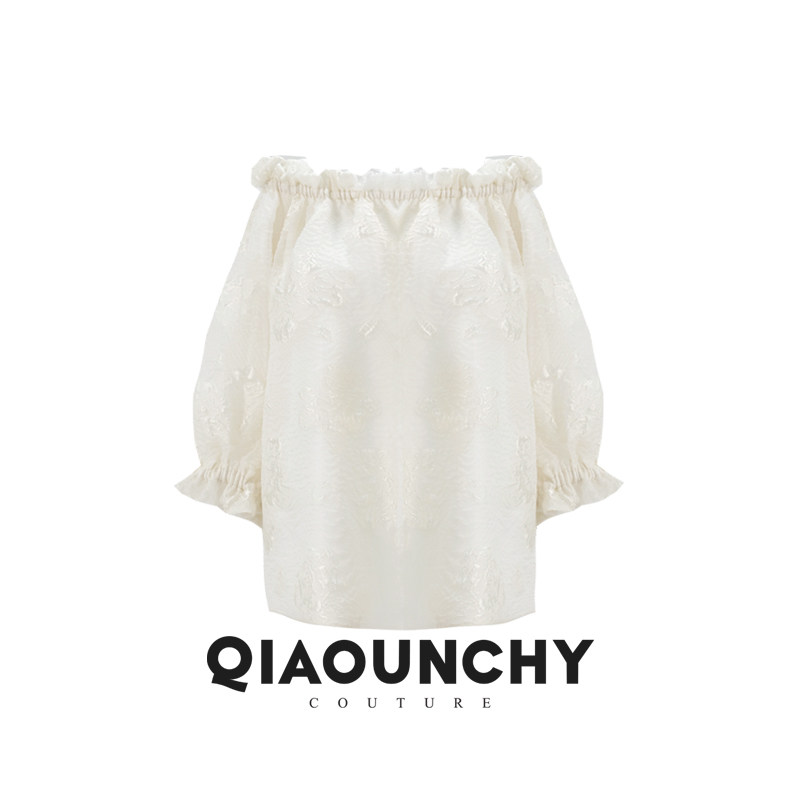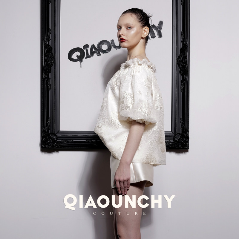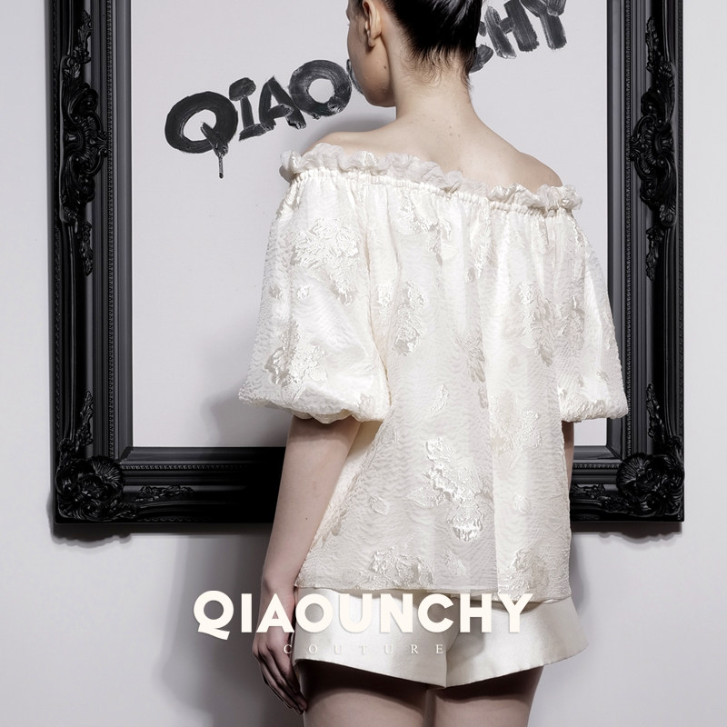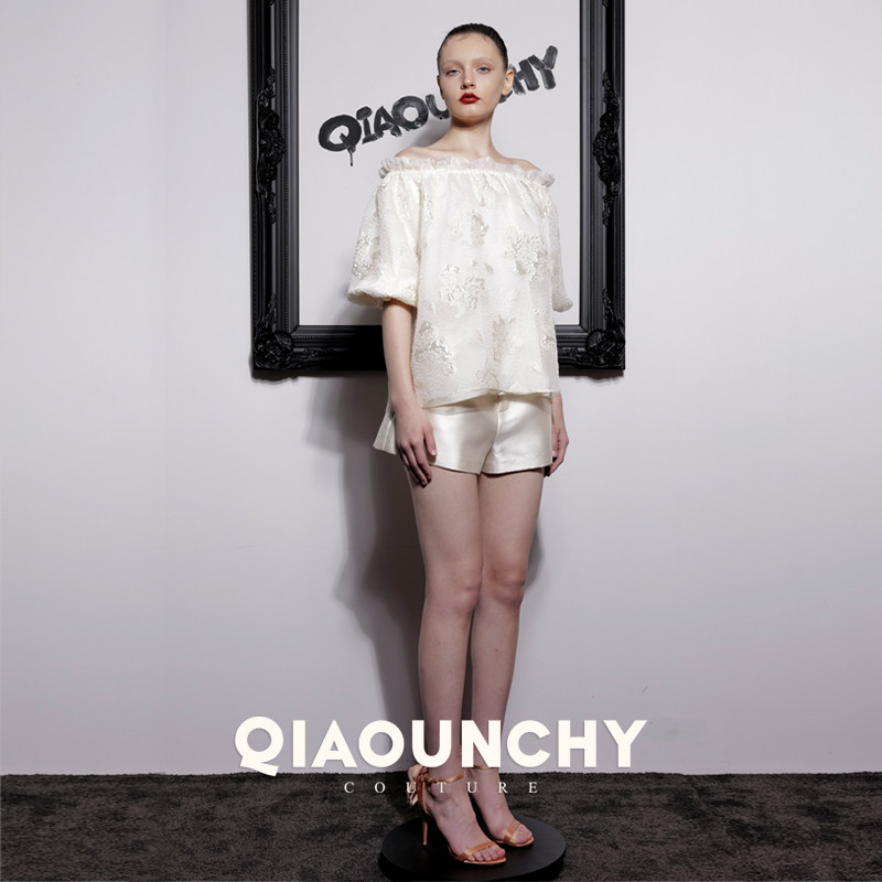 浮雕真丝提花 QIAOUNCHY俏云曦|杏色真丝提花一字领短上衣