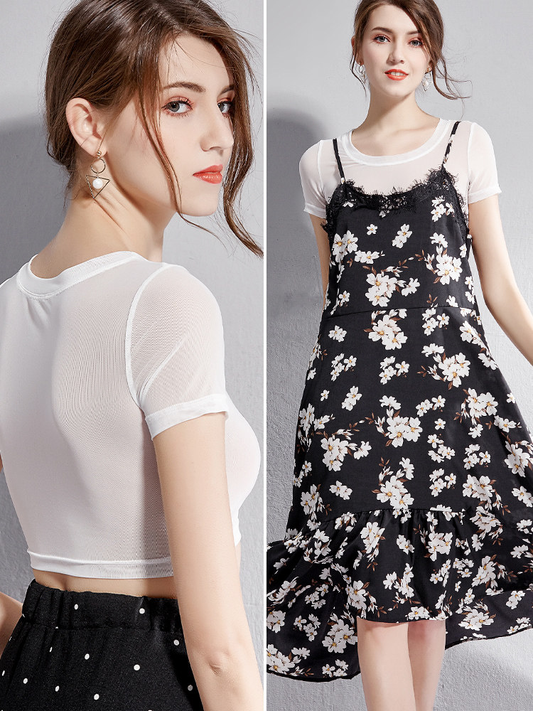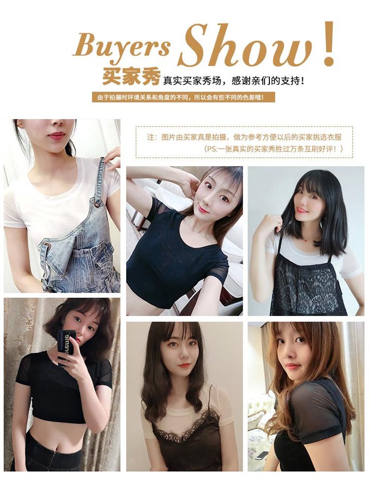 透视黑色内搭冰丝网纱打底衫女短袖夏薄款性感半截纱衣T恤网纱衫