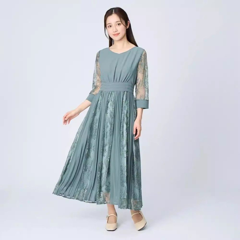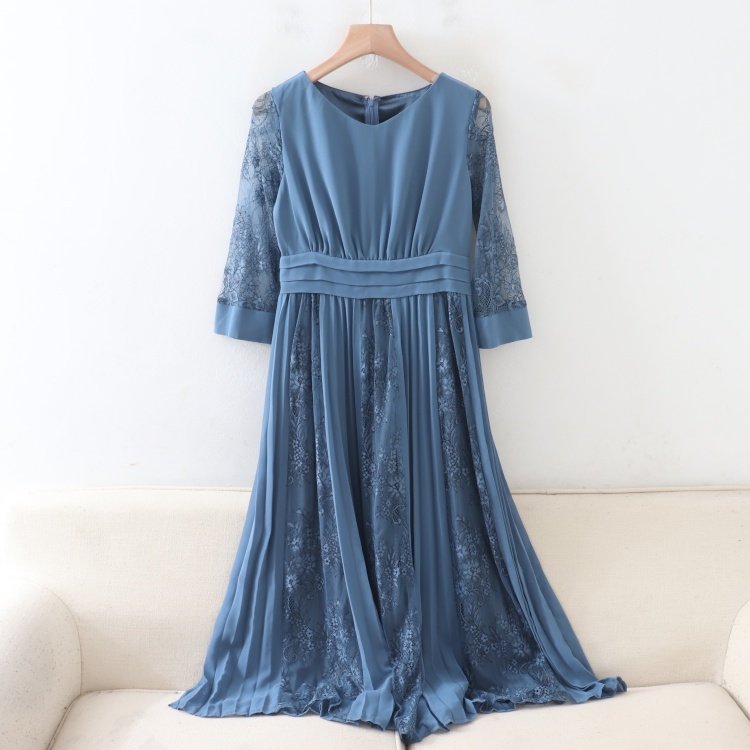 首页> 女装> C07085日单新款贵牌客供料拉链V领显瘦女气质拼蕾丝七分袖连衣裙
