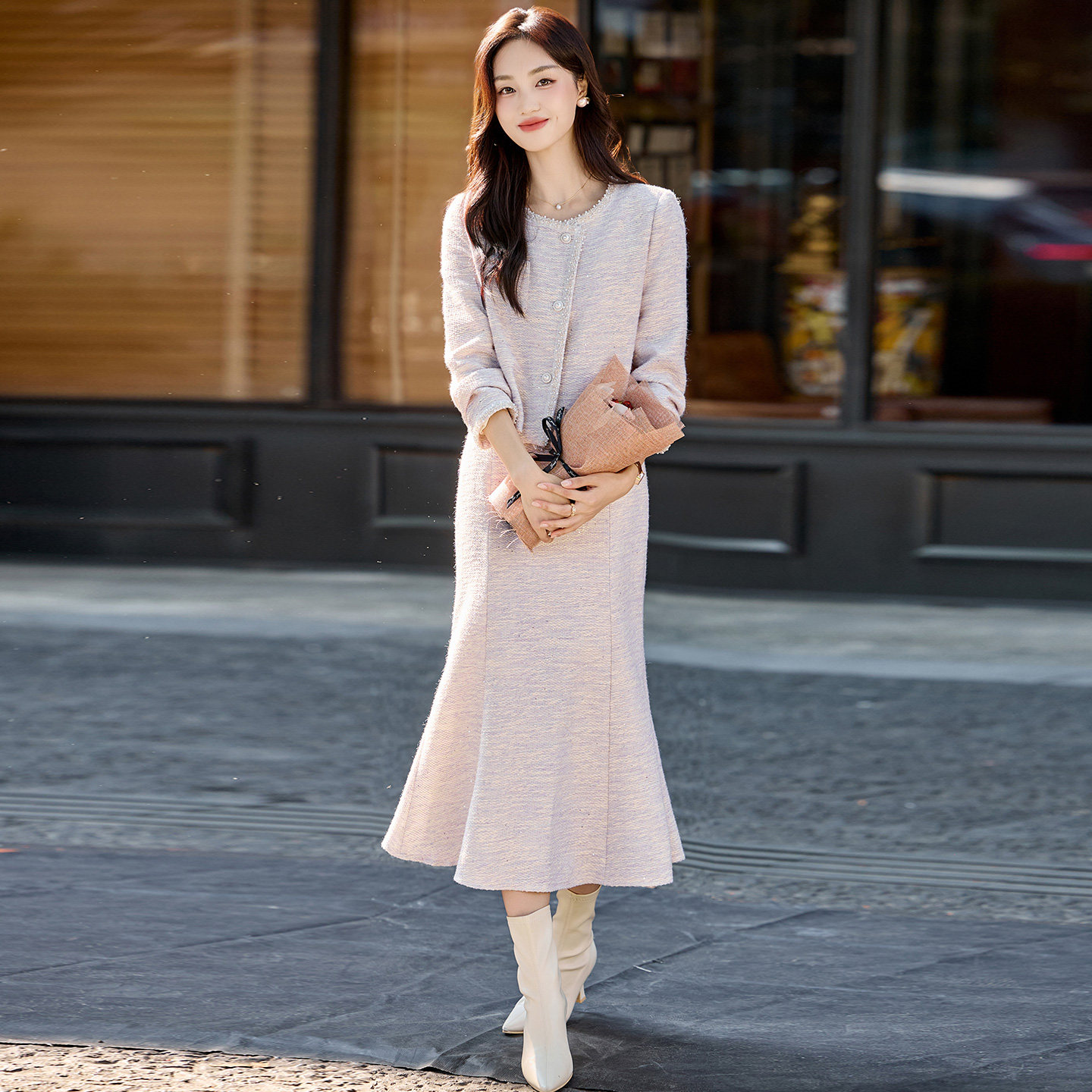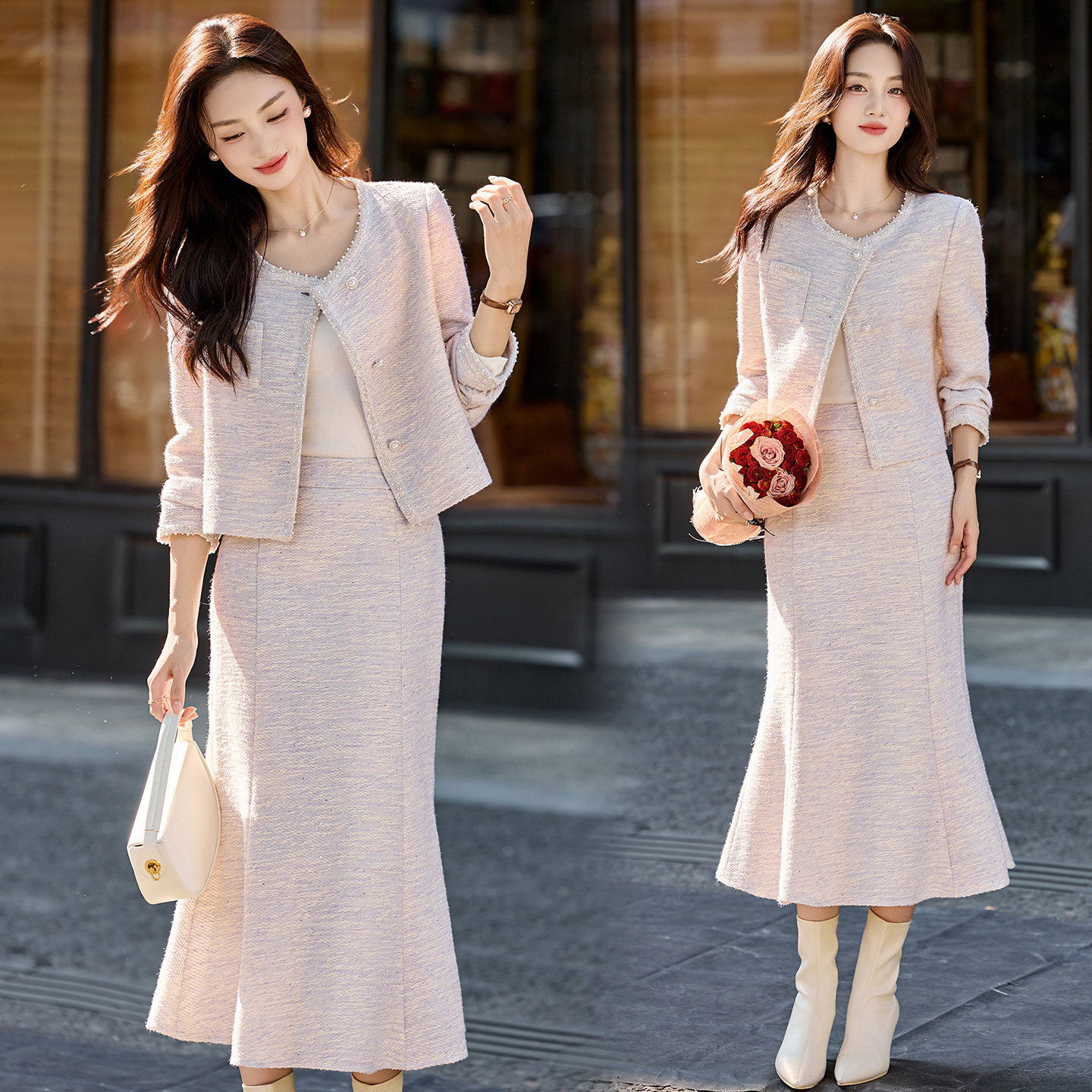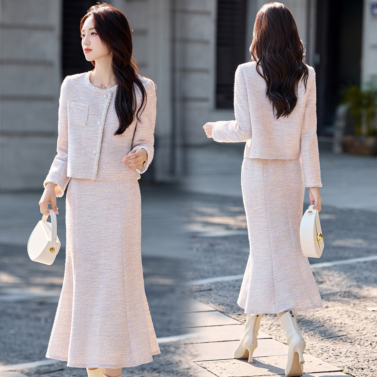 现货浅紫色鱼尾裙套装女时髦小香名媛风两件套