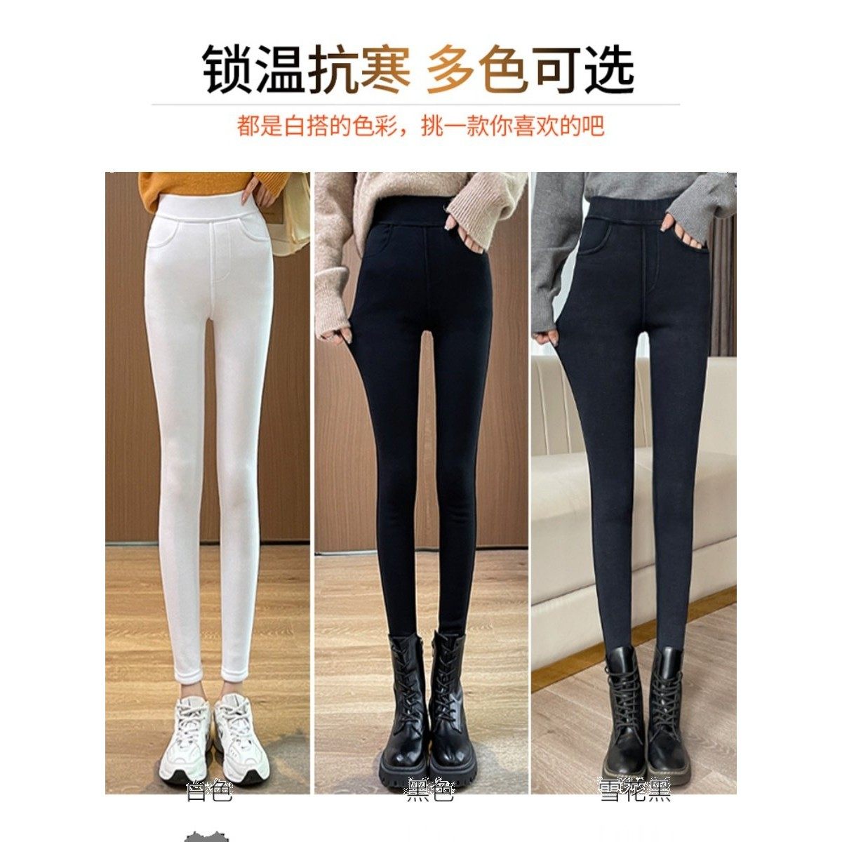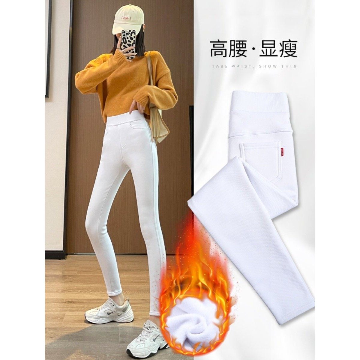潮牌秋冬新款白色打底裤女加绒加厚保暖高腰松紧腰小脚铅笔裤外穿
