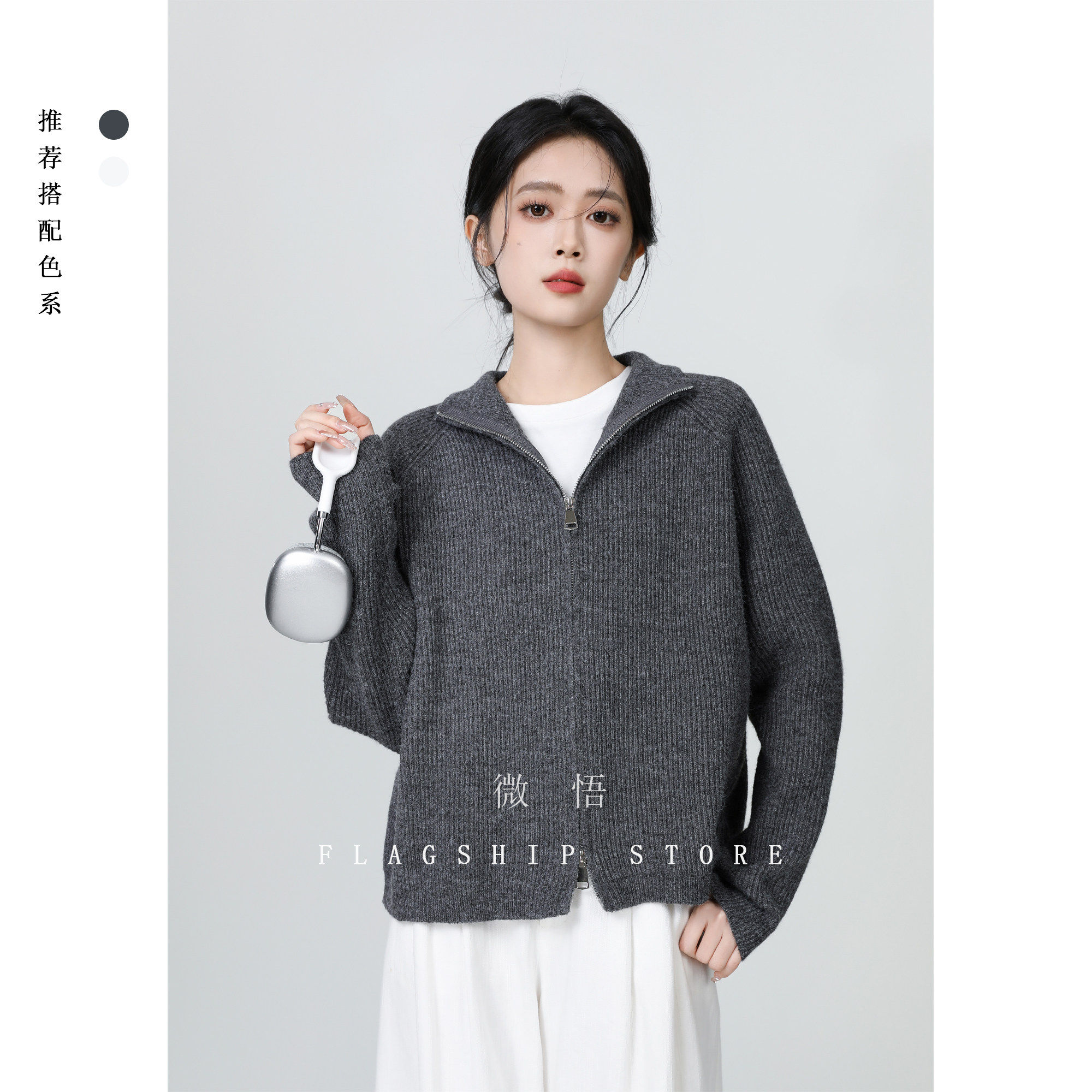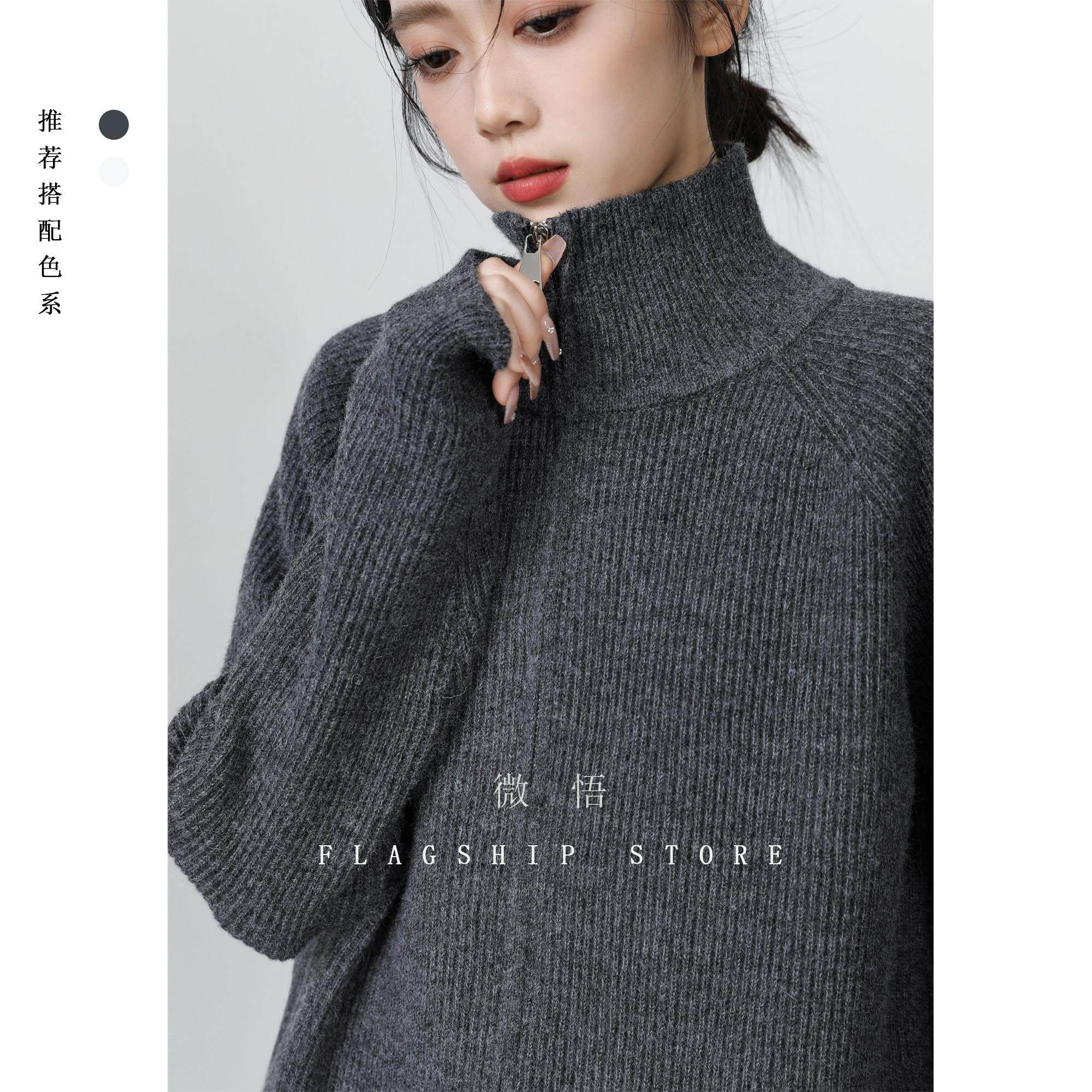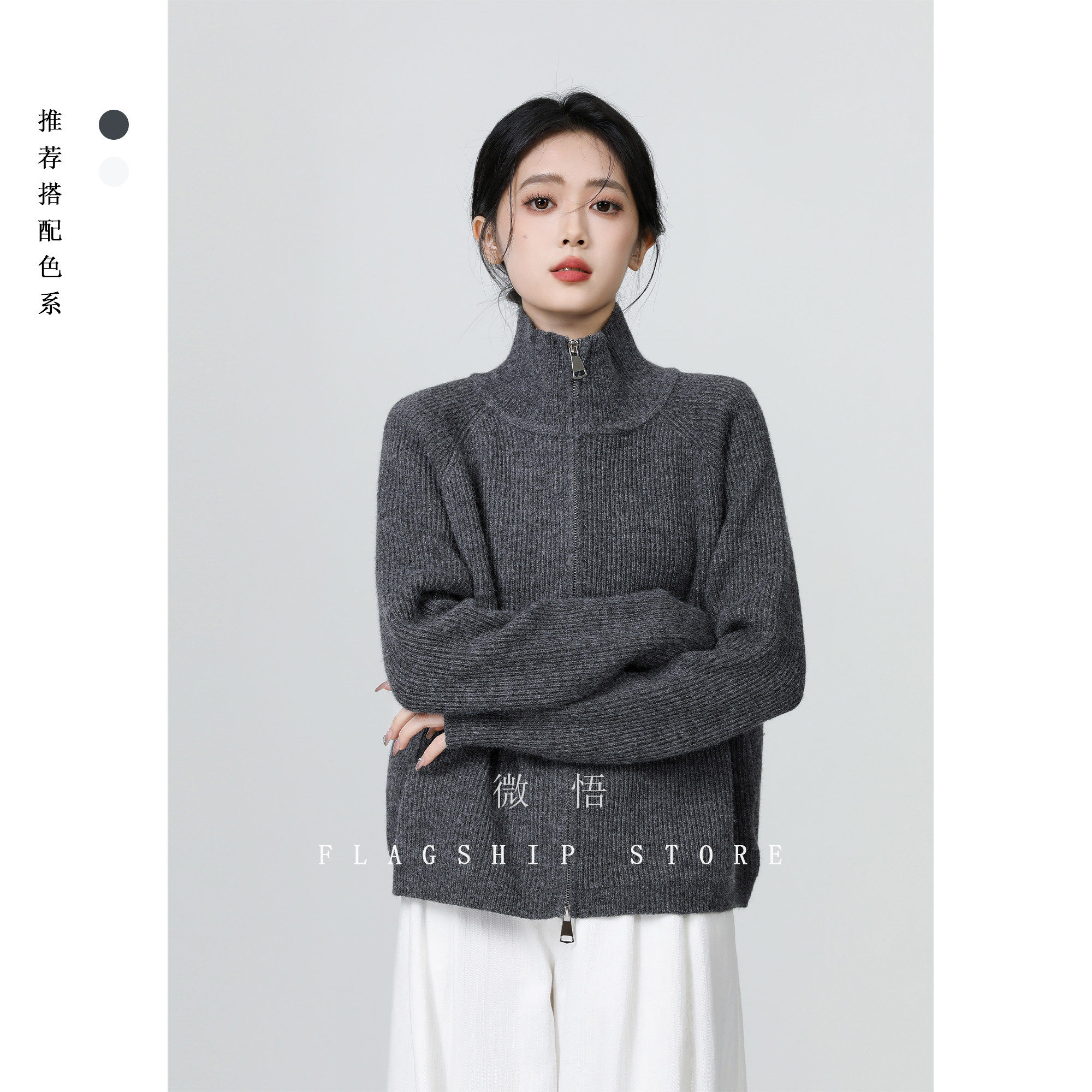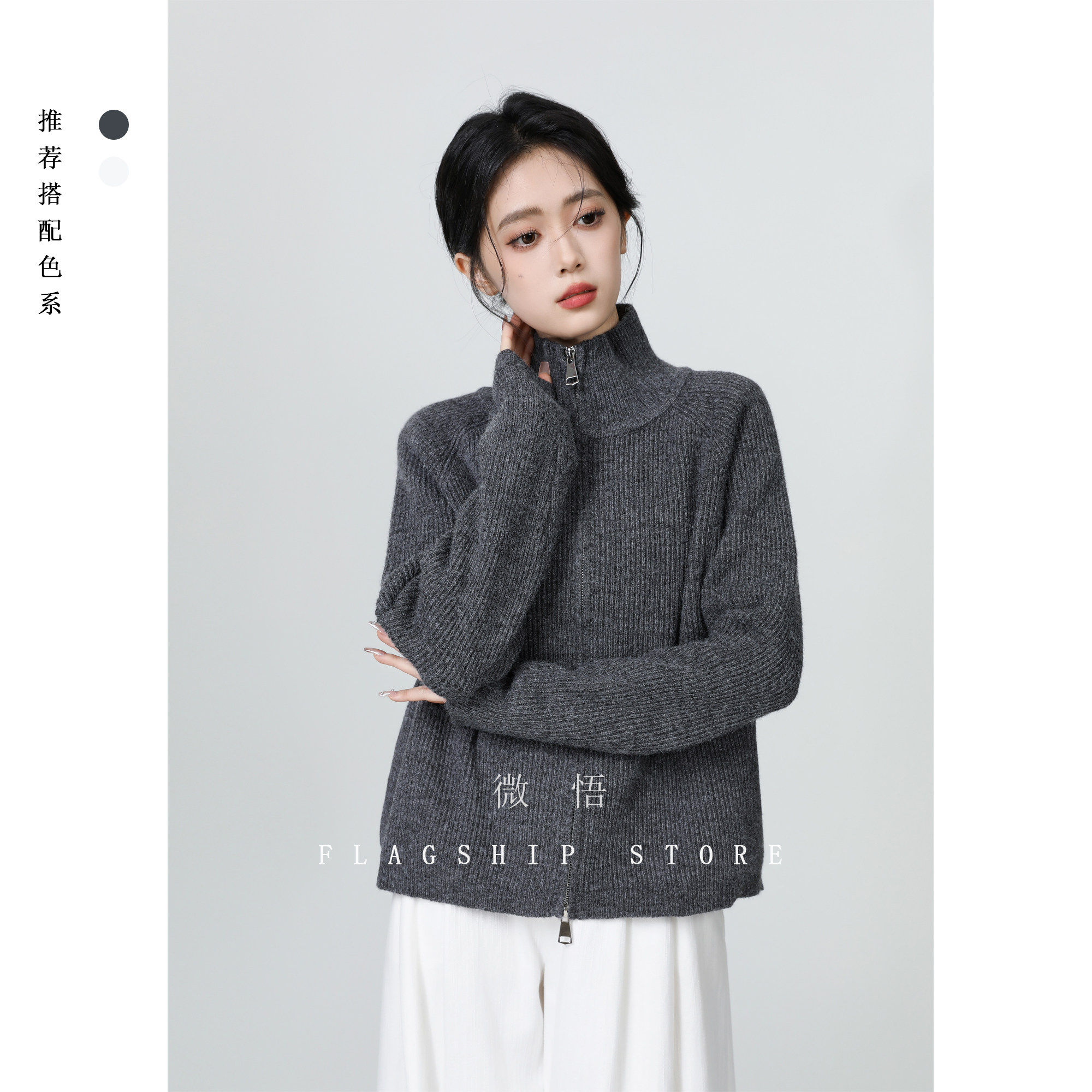 灰色高领加厚毛衣女秋冬2025新款复古宽松双拉链针织开衫外套上衣