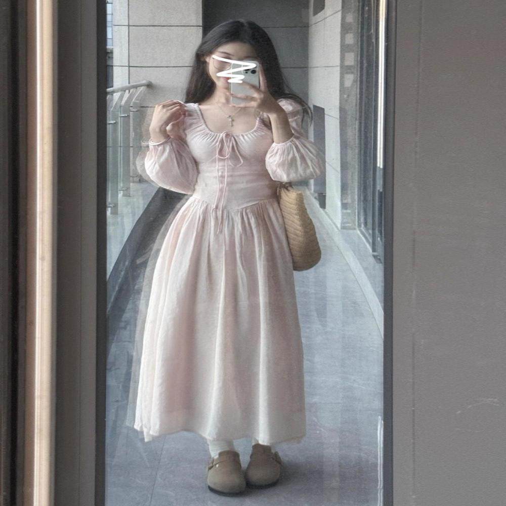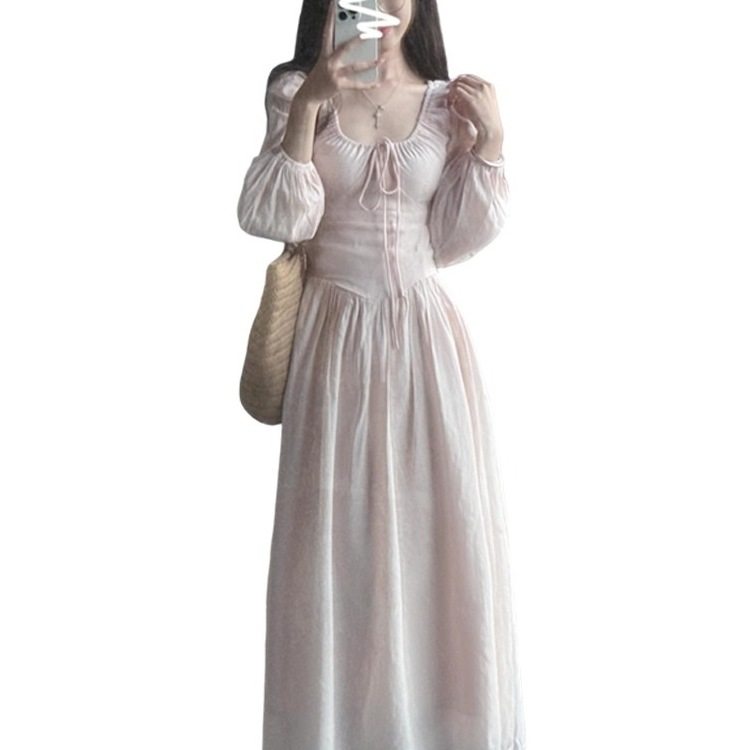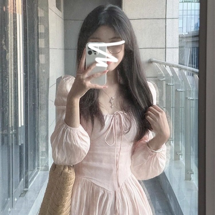 早秋法式粉色长袖连衣裙子女装入早秋季新款收腰显瘦气质长裙