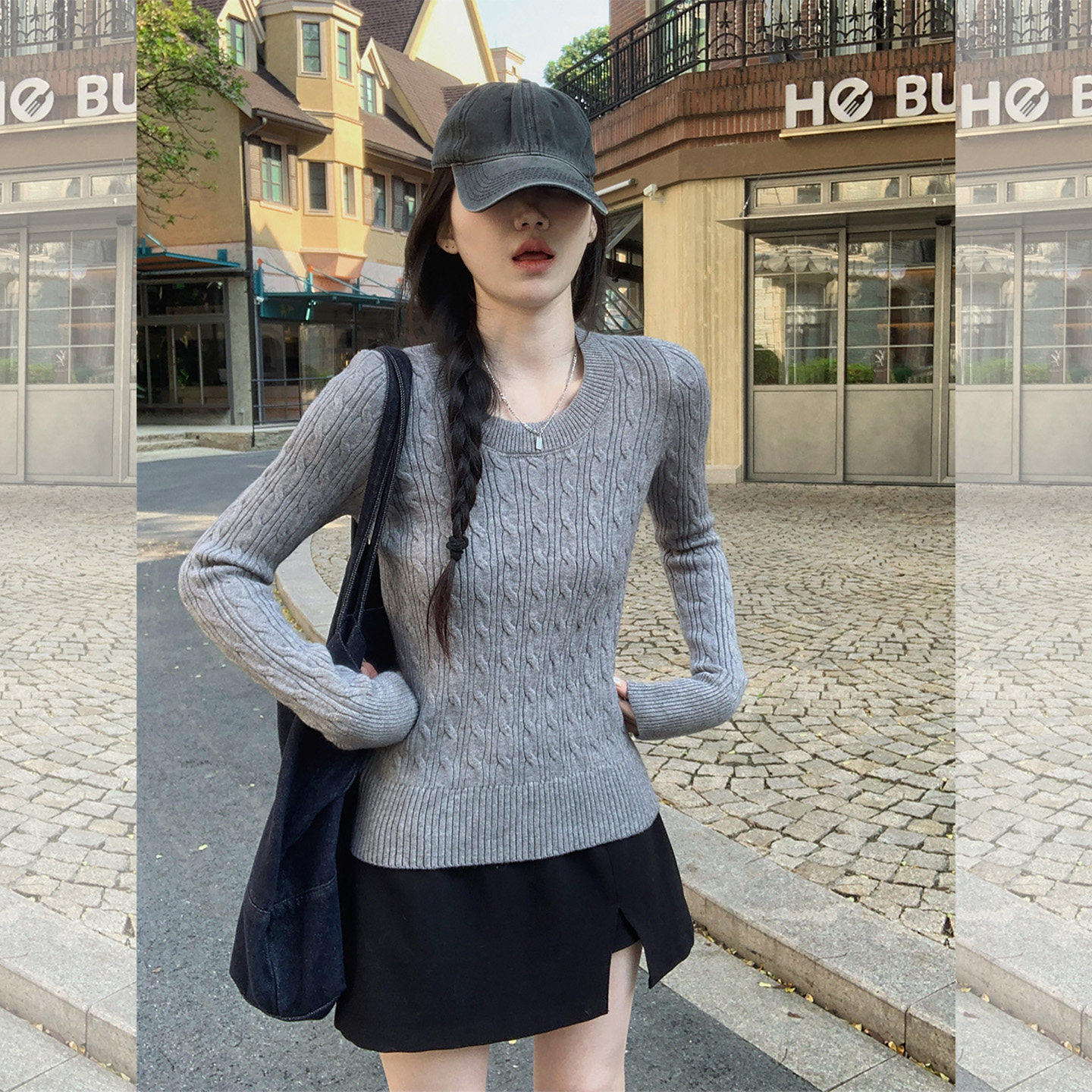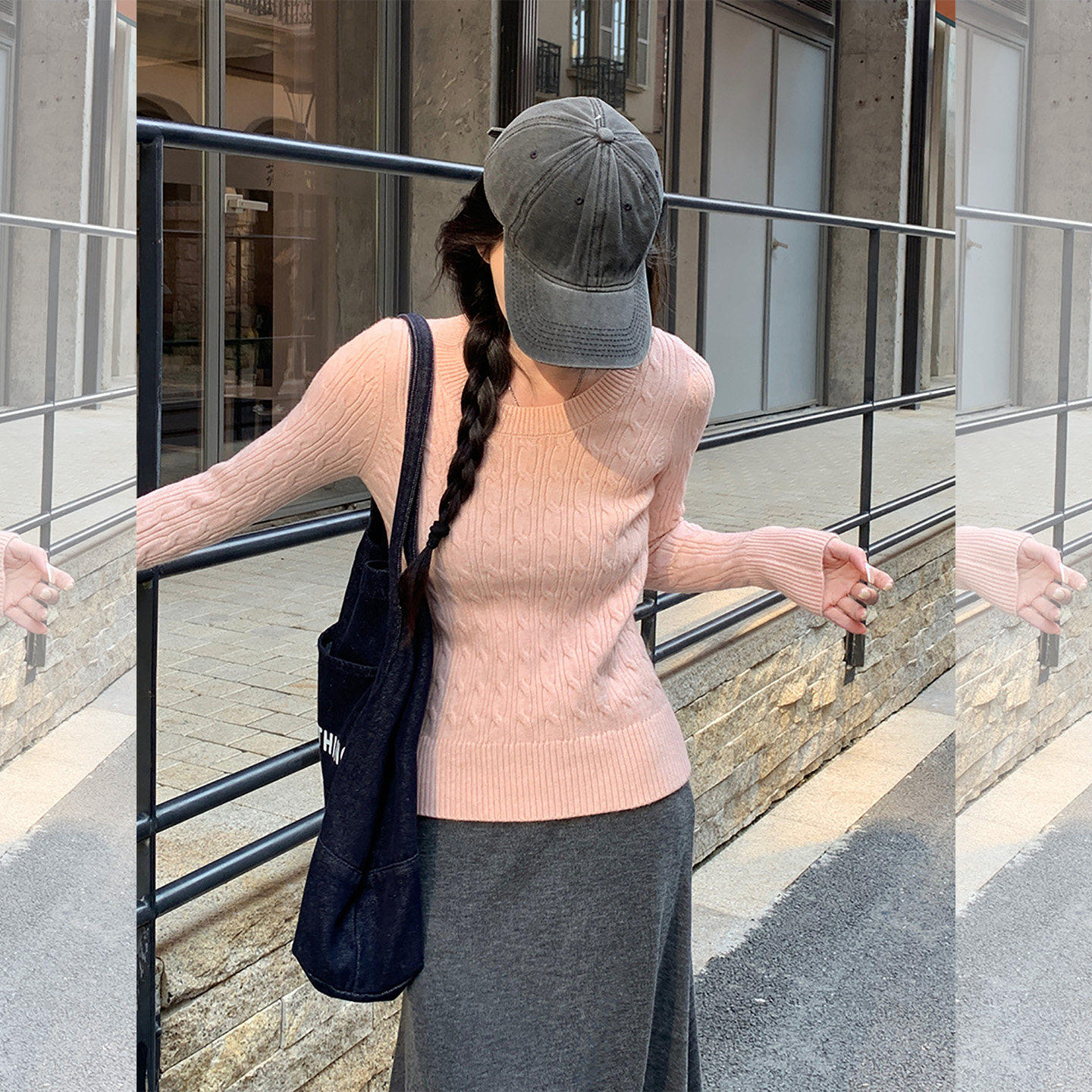 老钱风麻花毛衣针织打底衫女秋冬内搭修身高级设计感正肩圆领上衣