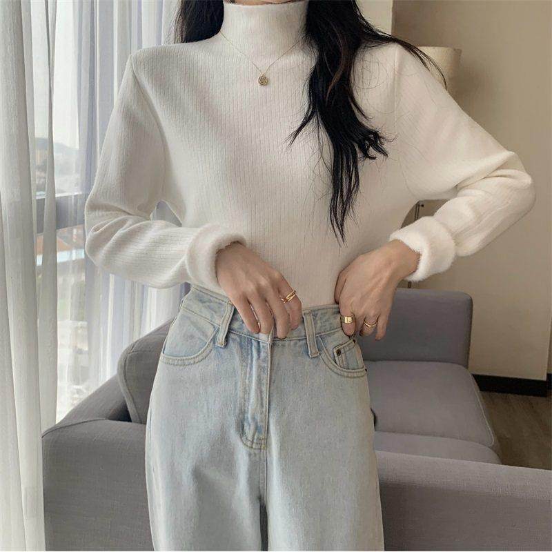 半高领毛衣加厚打底衫女秋冬内搭一体加绒坑条保暖针织衫法式上衣