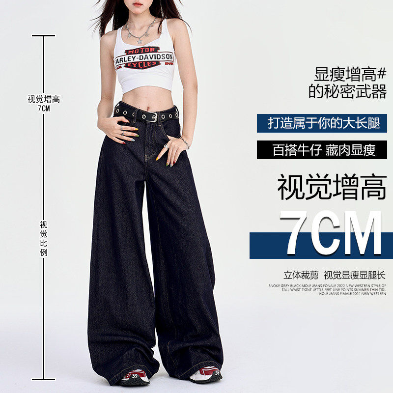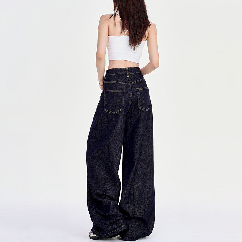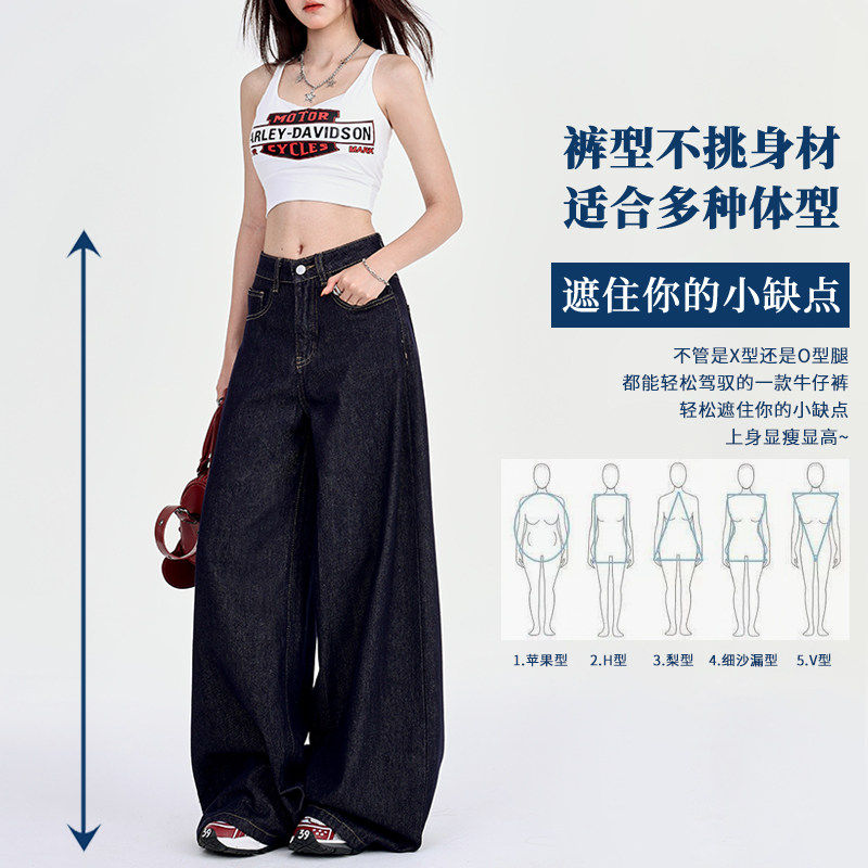 深蓝美式宽松阔腿牛仔裤女2025年夏季冰丝垂感慵懒休闲 拖地直筒