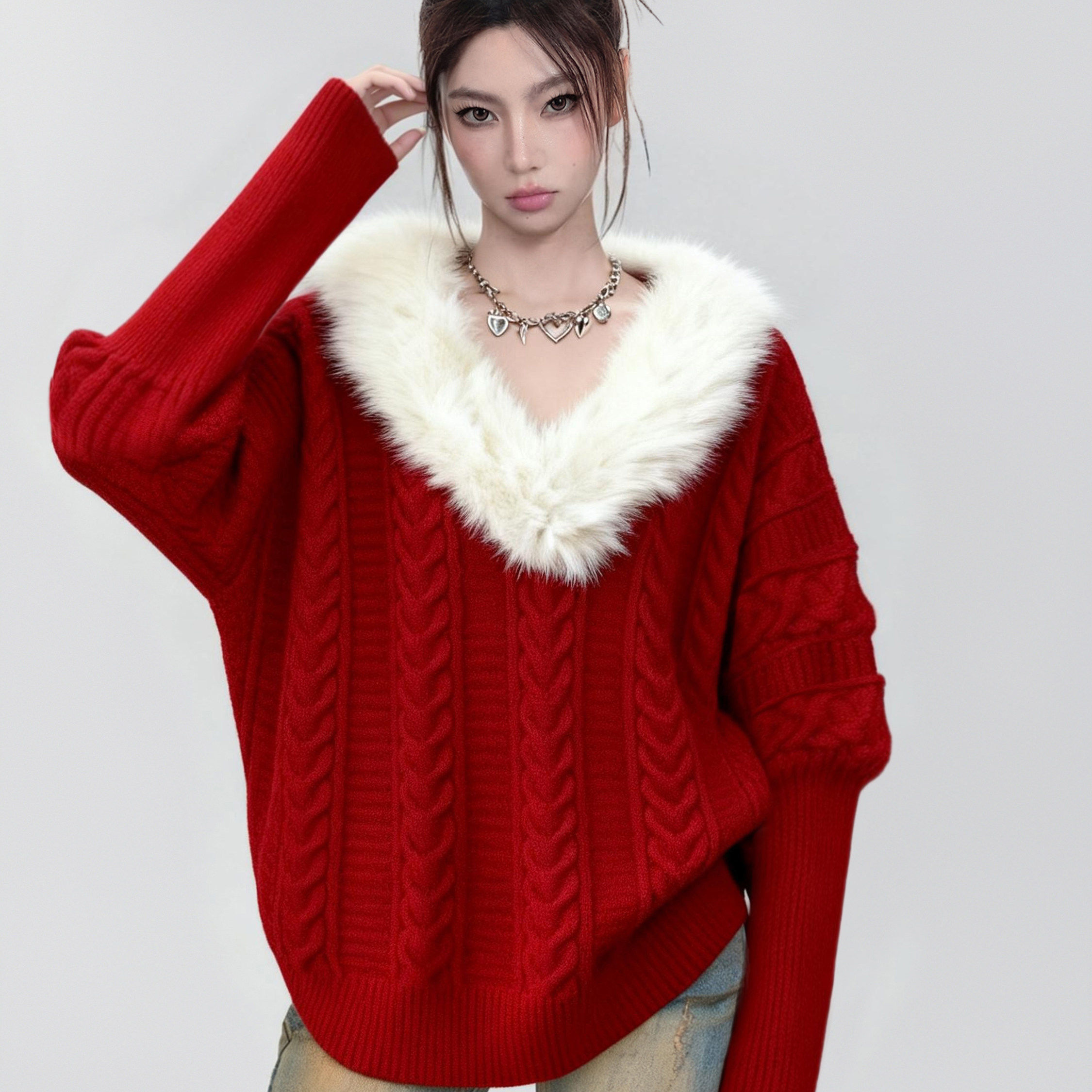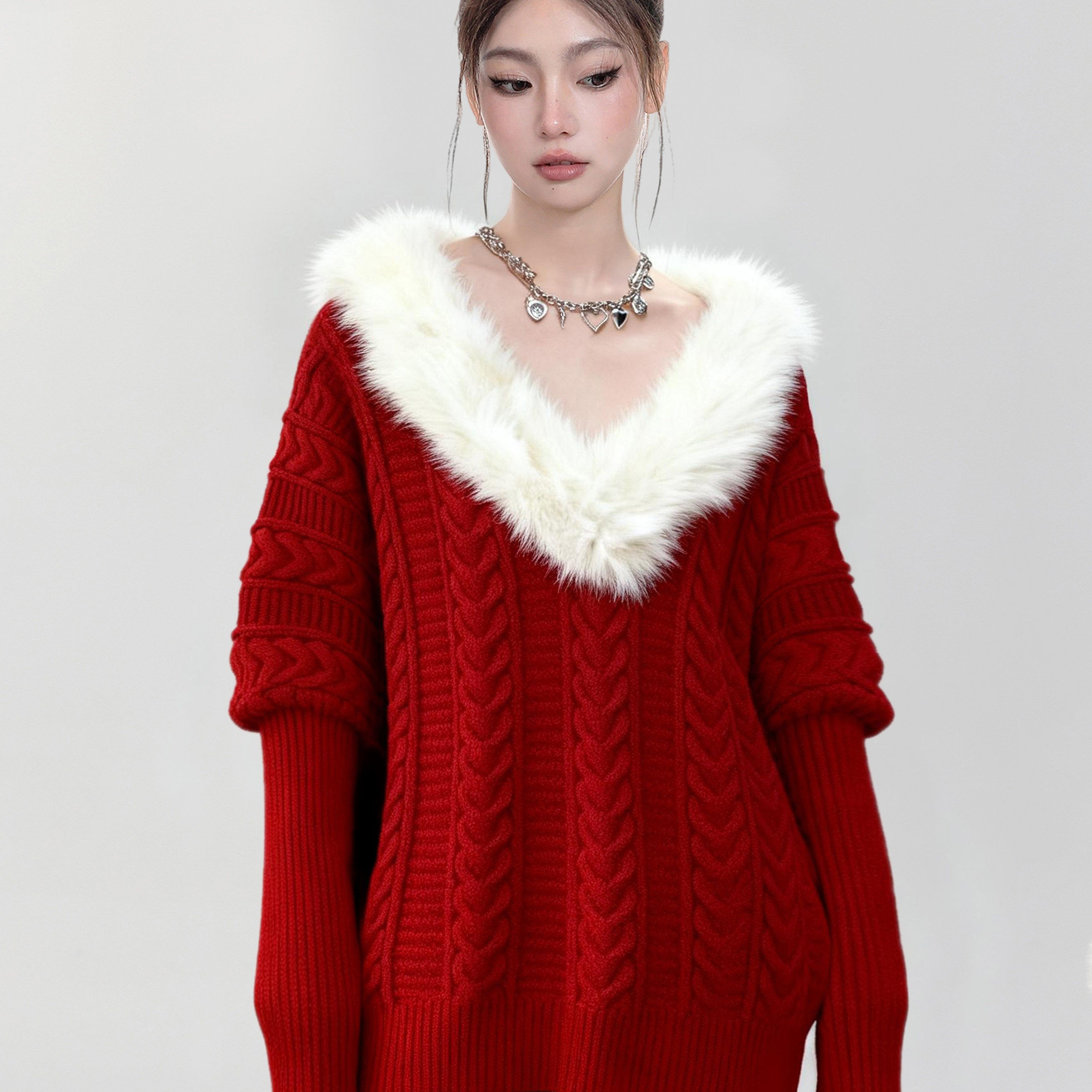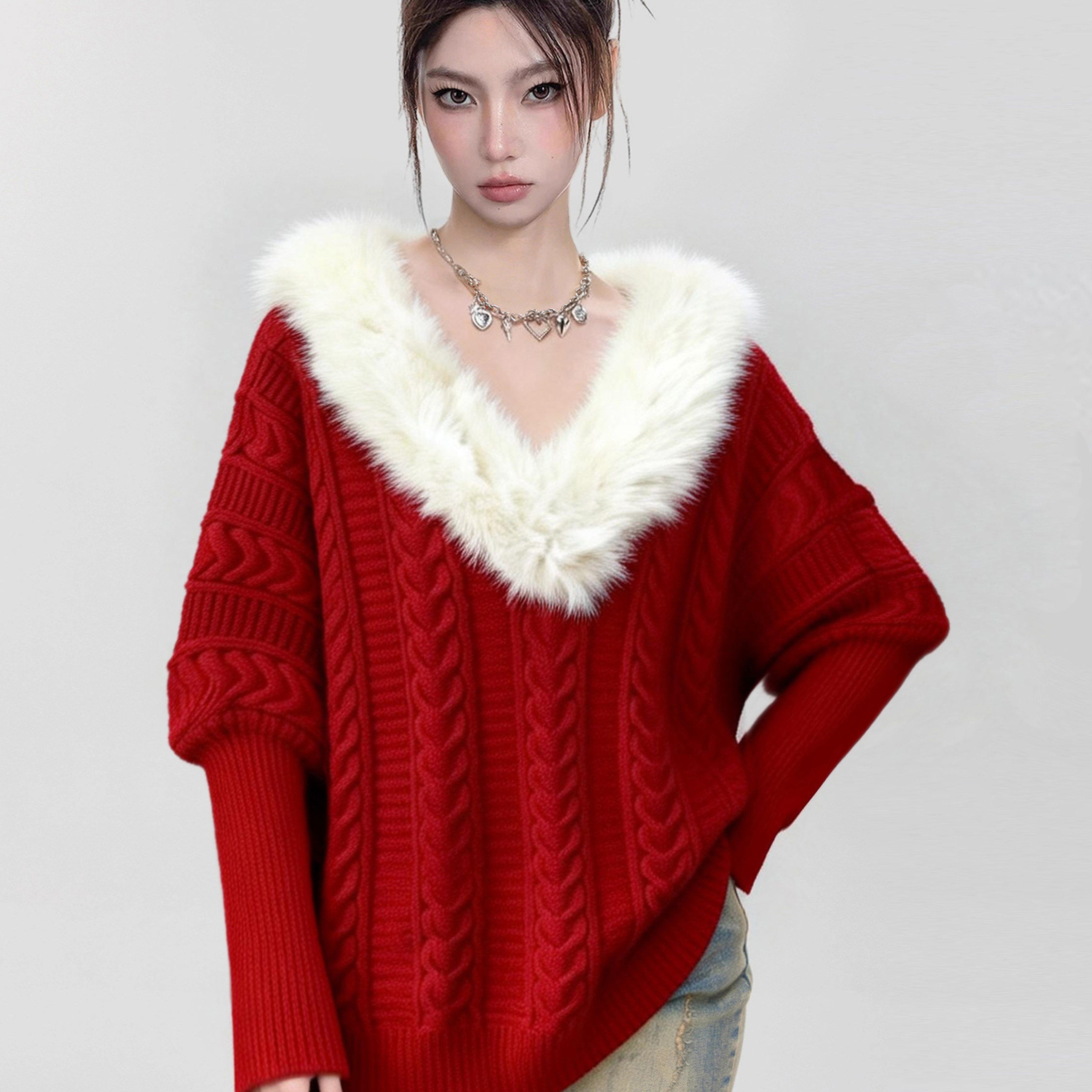 圣诞红色毛领V领麻花针织毛衣女秋冬季加厚高级感套头蝙蝠袖上衣