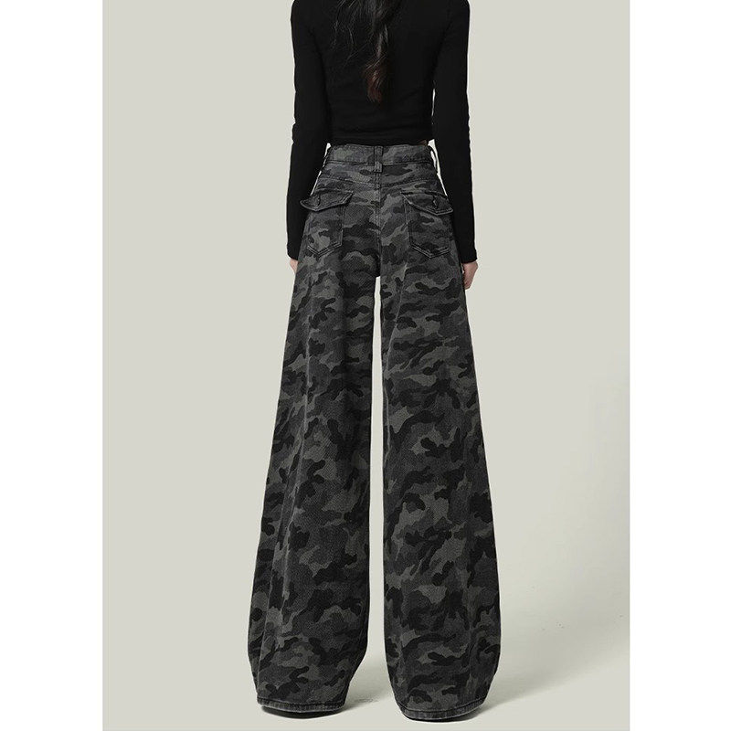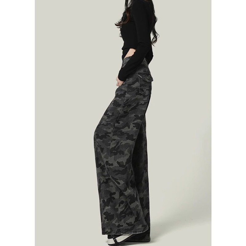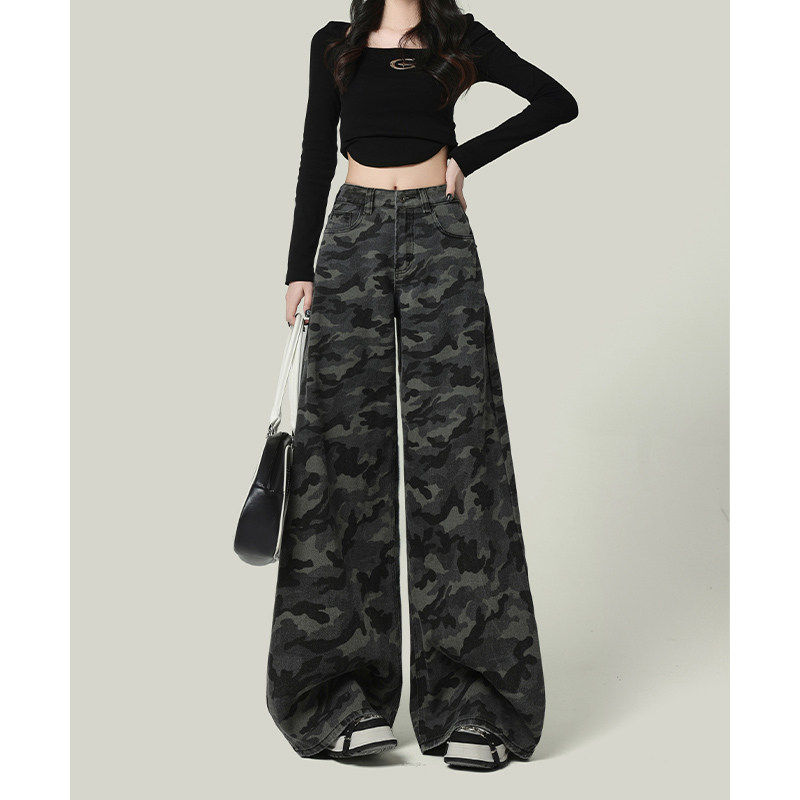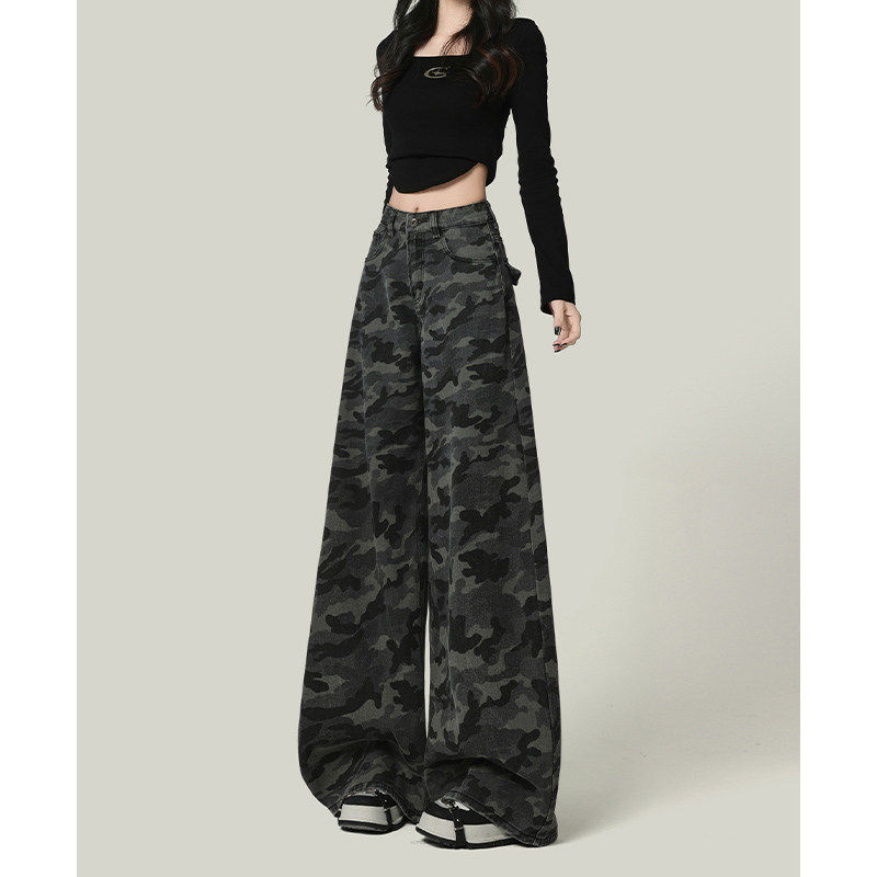 MZVZ美式覆古迷彩阔腿牛仔裤女夏季2025新款宽松直筒高腰工装裤子