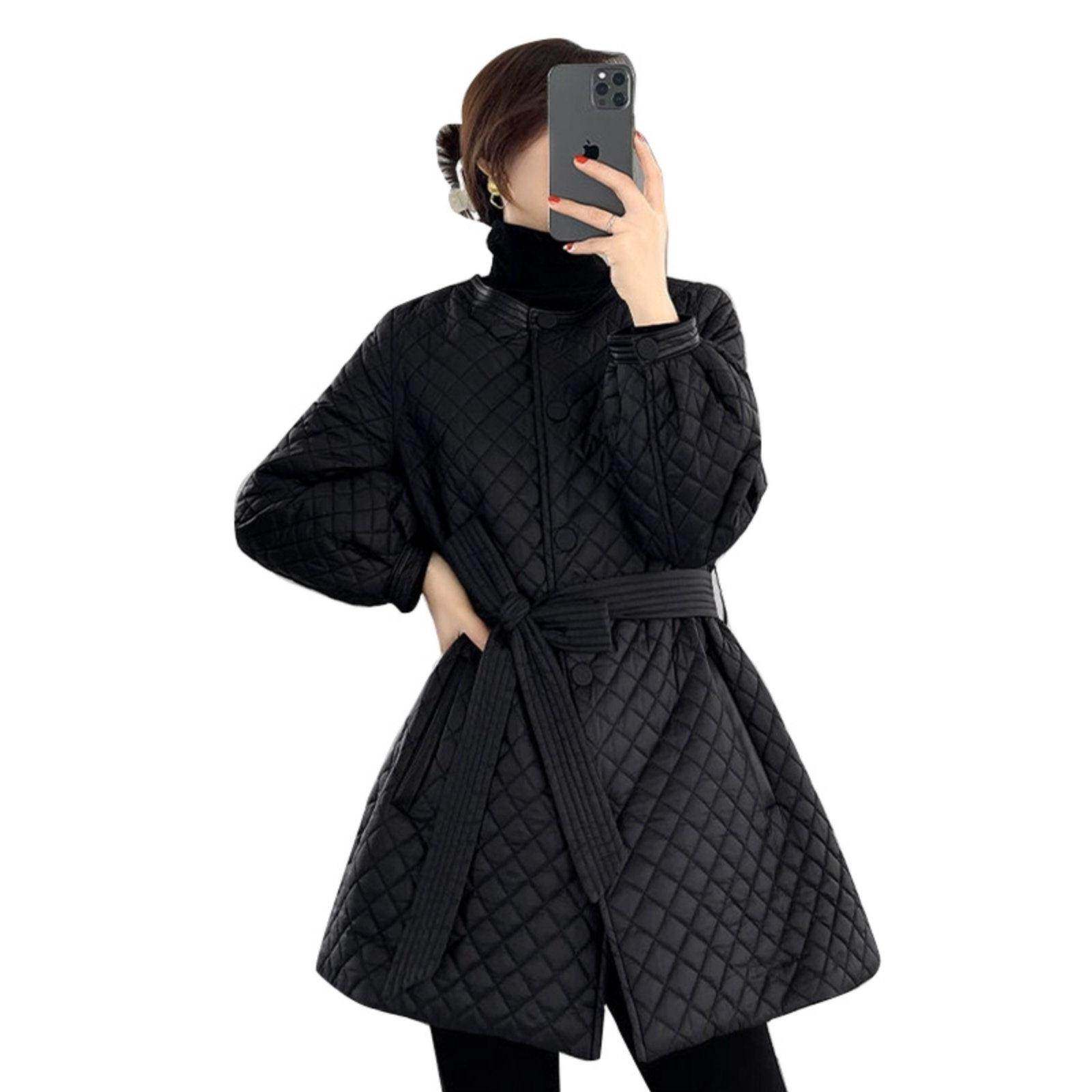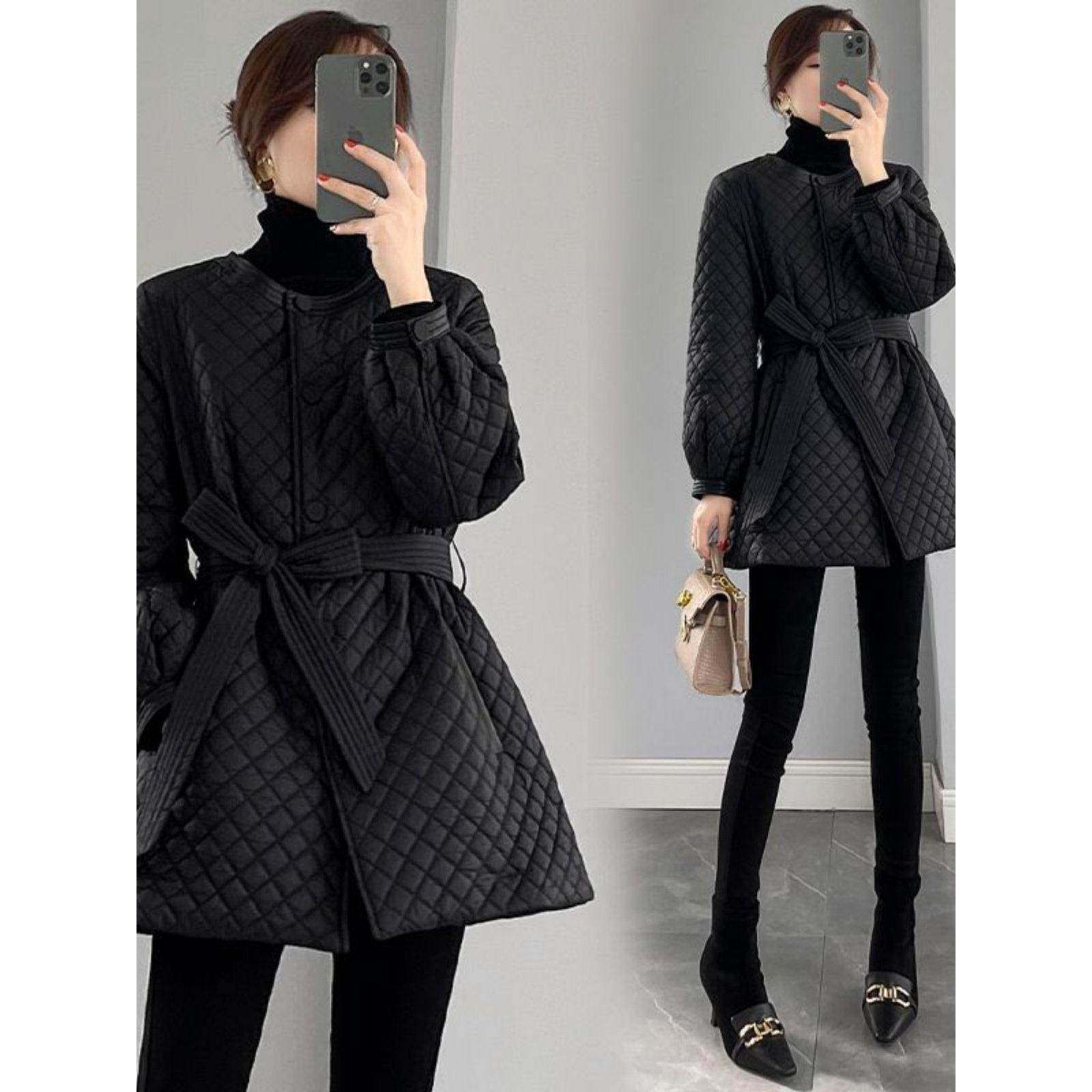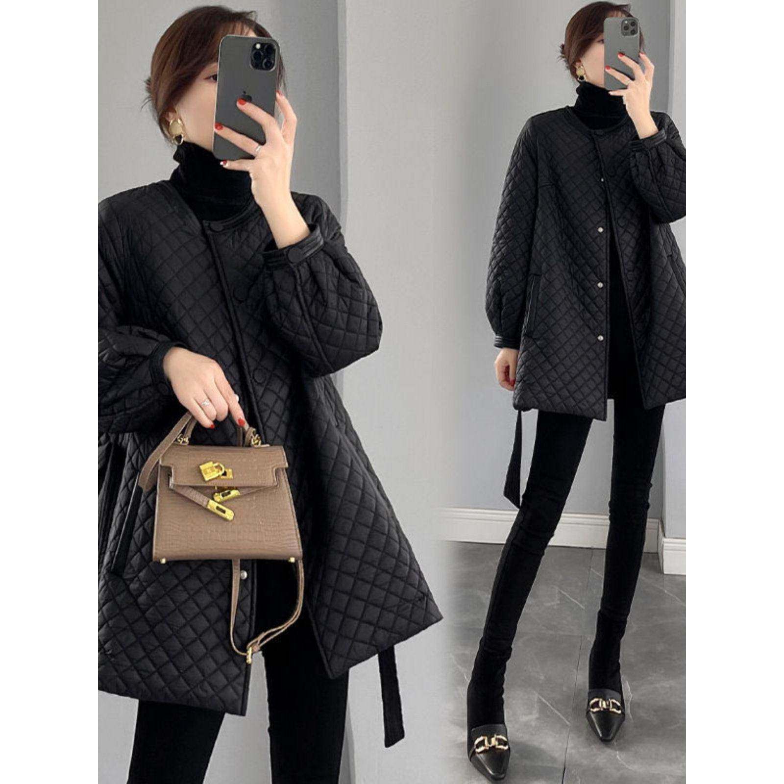 冬季加厚羽绒棉服外套女2025新款高端大码中长款收腰黑色菱格棉衣