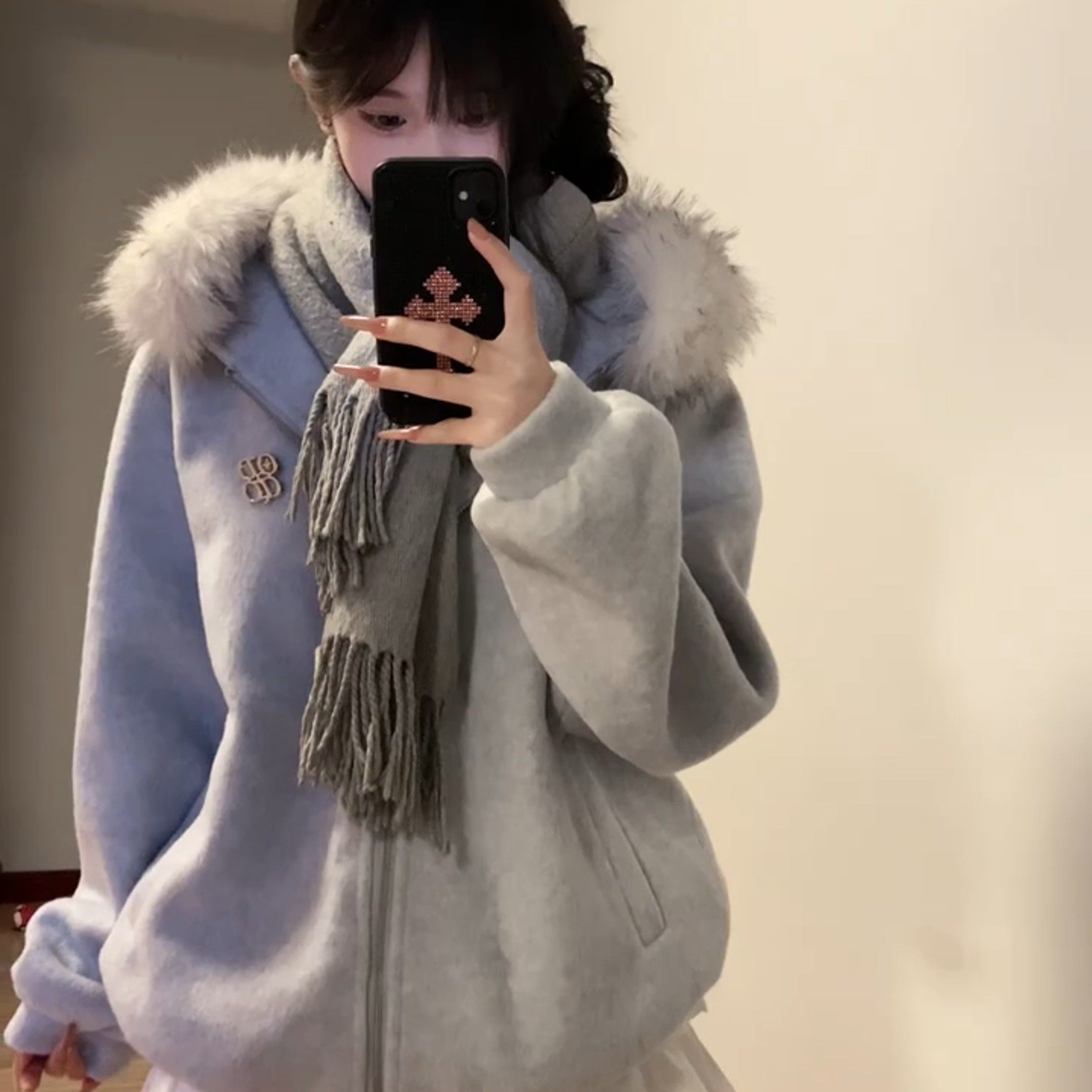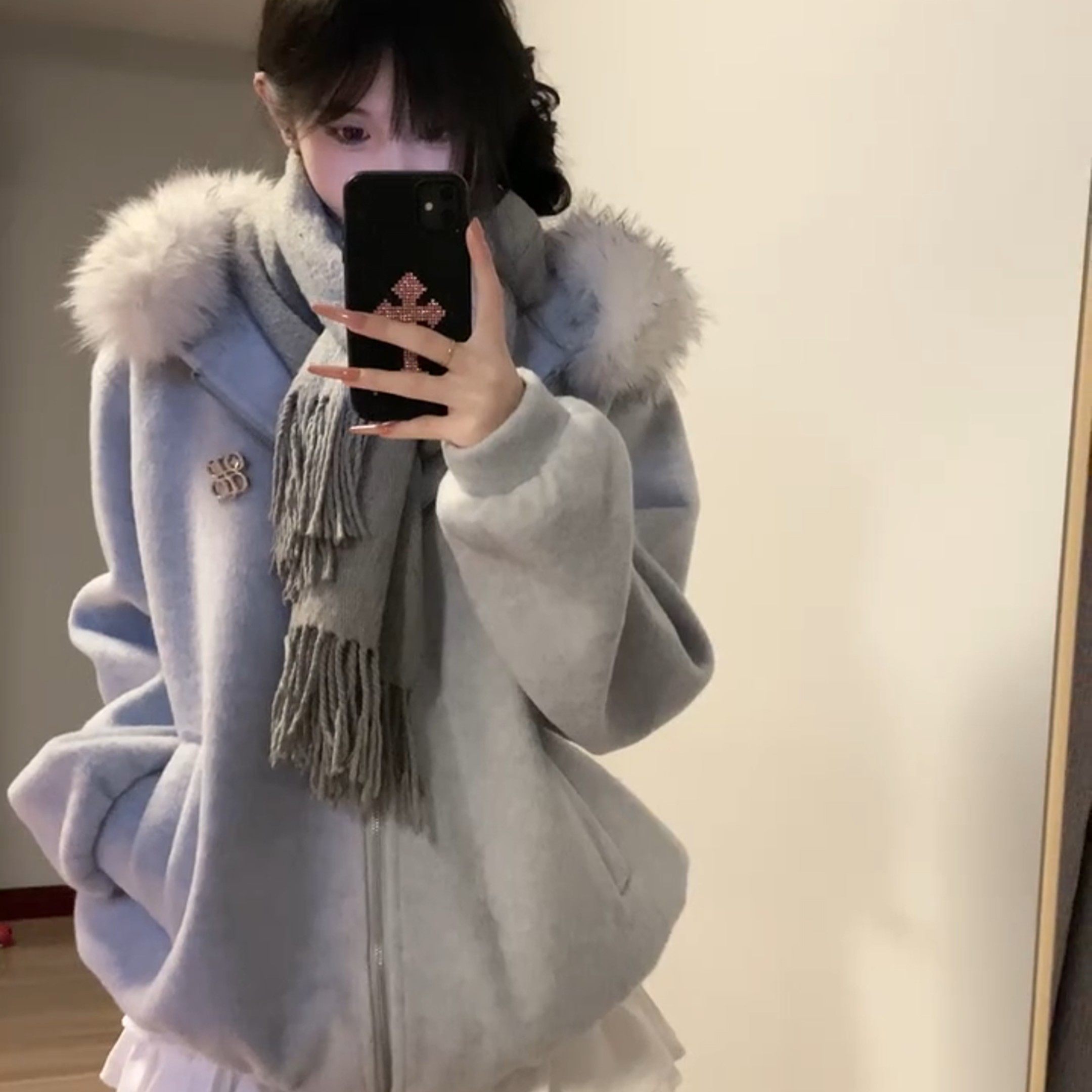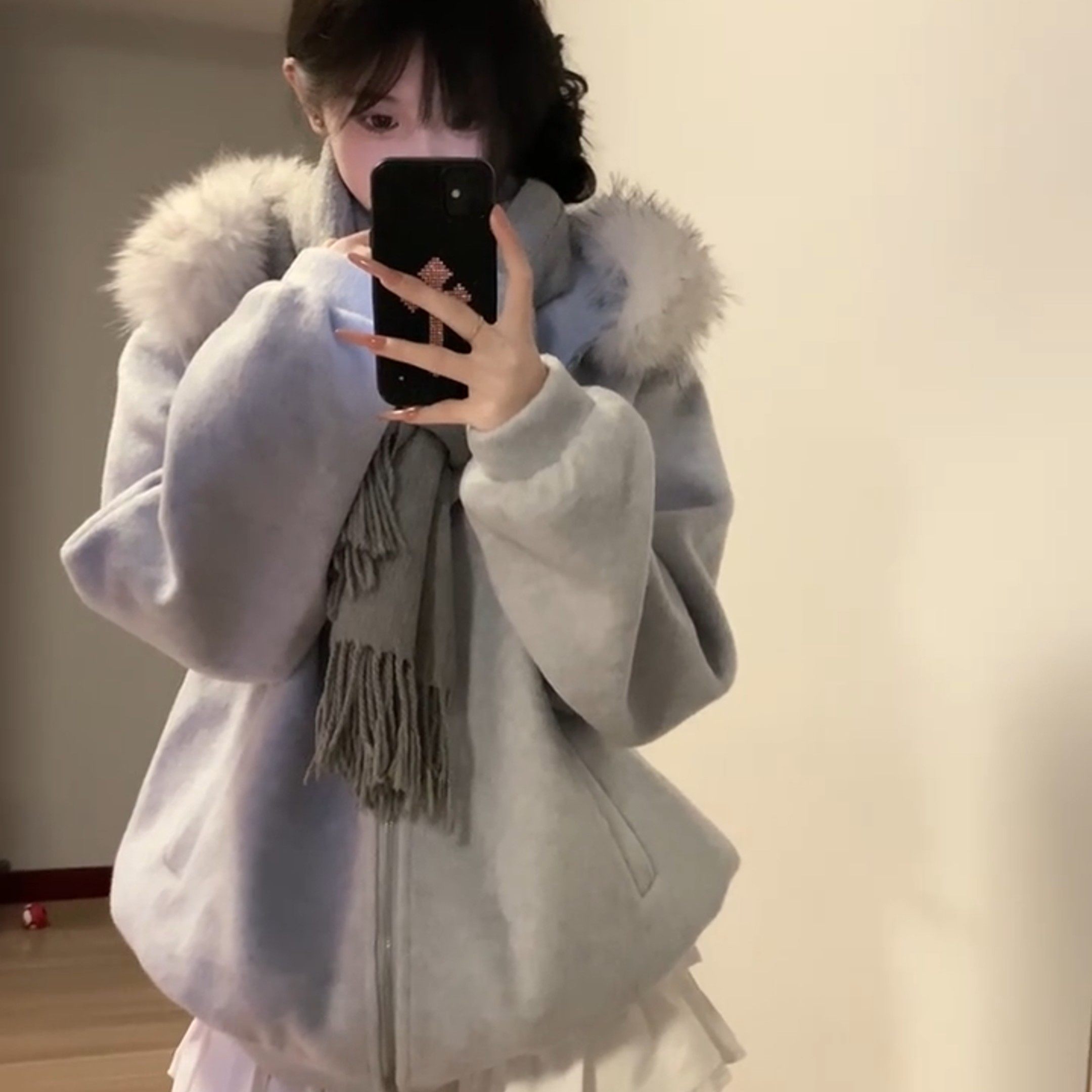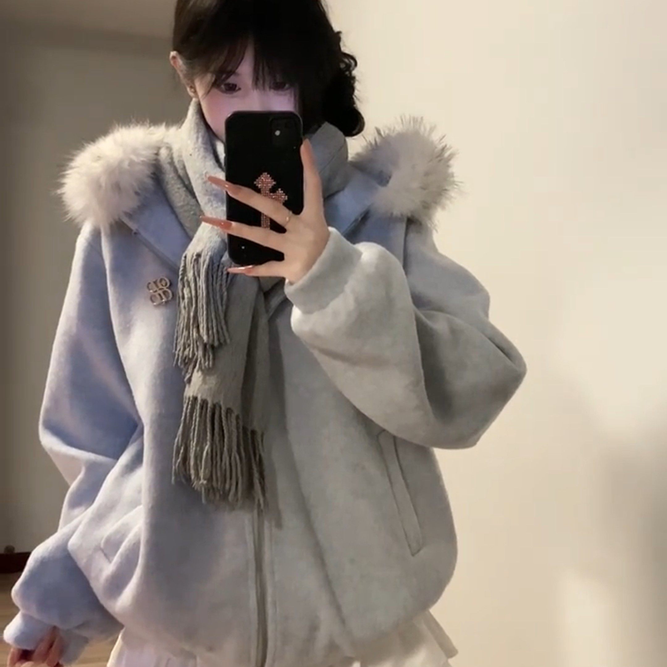 甜美毛领连帽毛呢卫衣外套女装秋冬季新款高级感夹棉加厚呢子大衣
