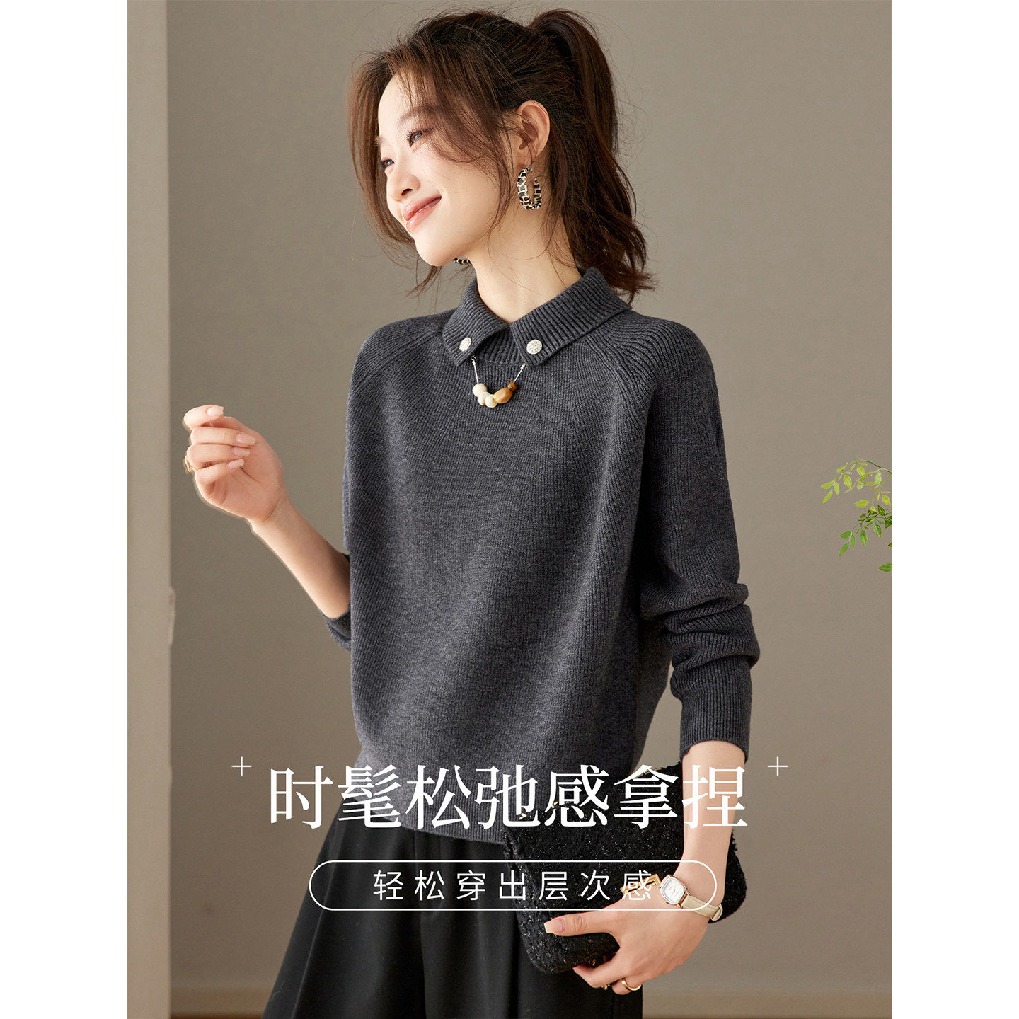 2025新款秋冬季高级感气质翻领针织衫上衣女小个子宽松毛衣打底衫