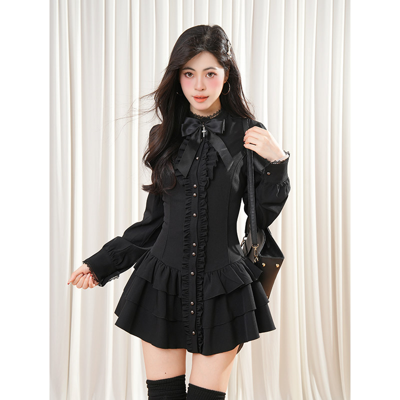 黑巧 暗黑系哥特风蝴蝶结长袖收腰连衣裙拼接木耳边蓬蓬蛋糕短裙