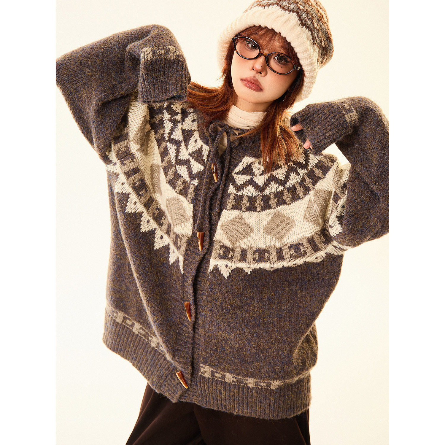 MAIKAO 费尔岛古著牛角扣开衫毛衣女秋冬情侣宽松连帽针织衫外套