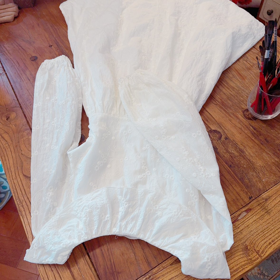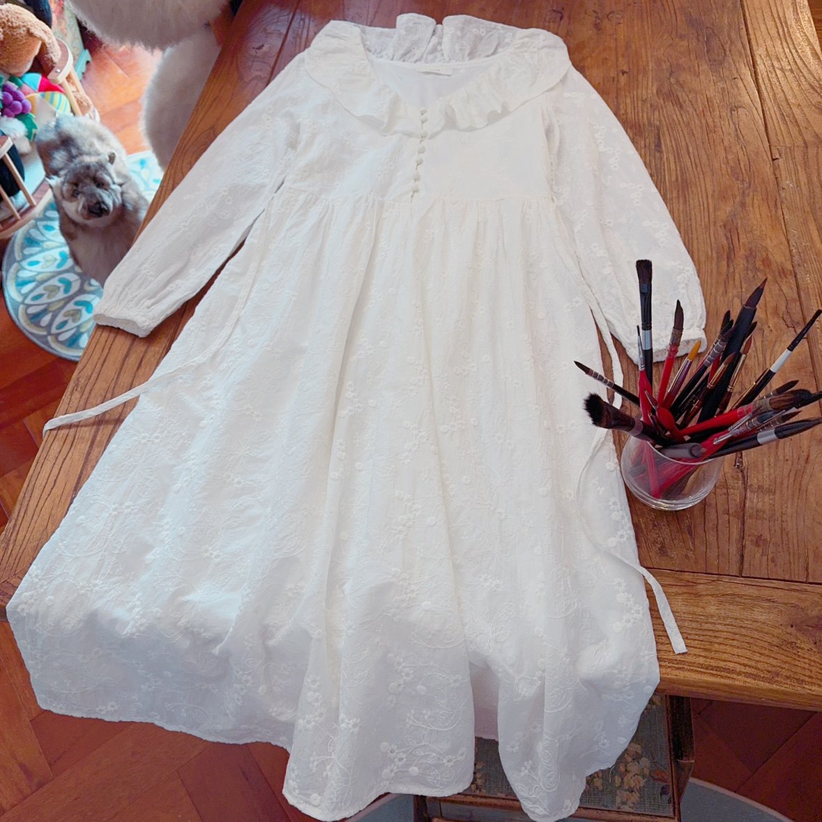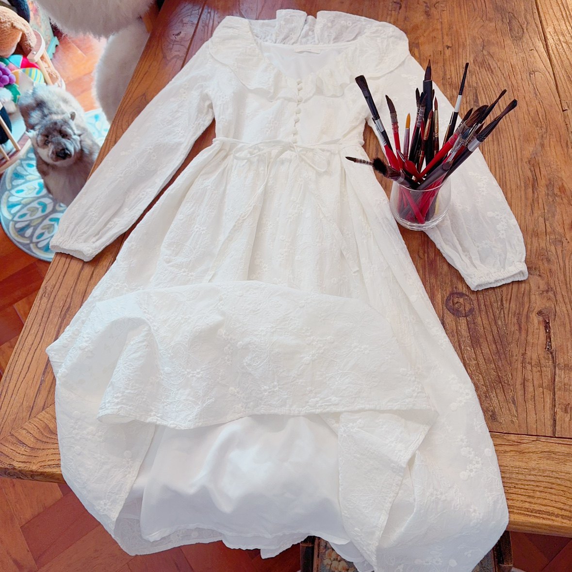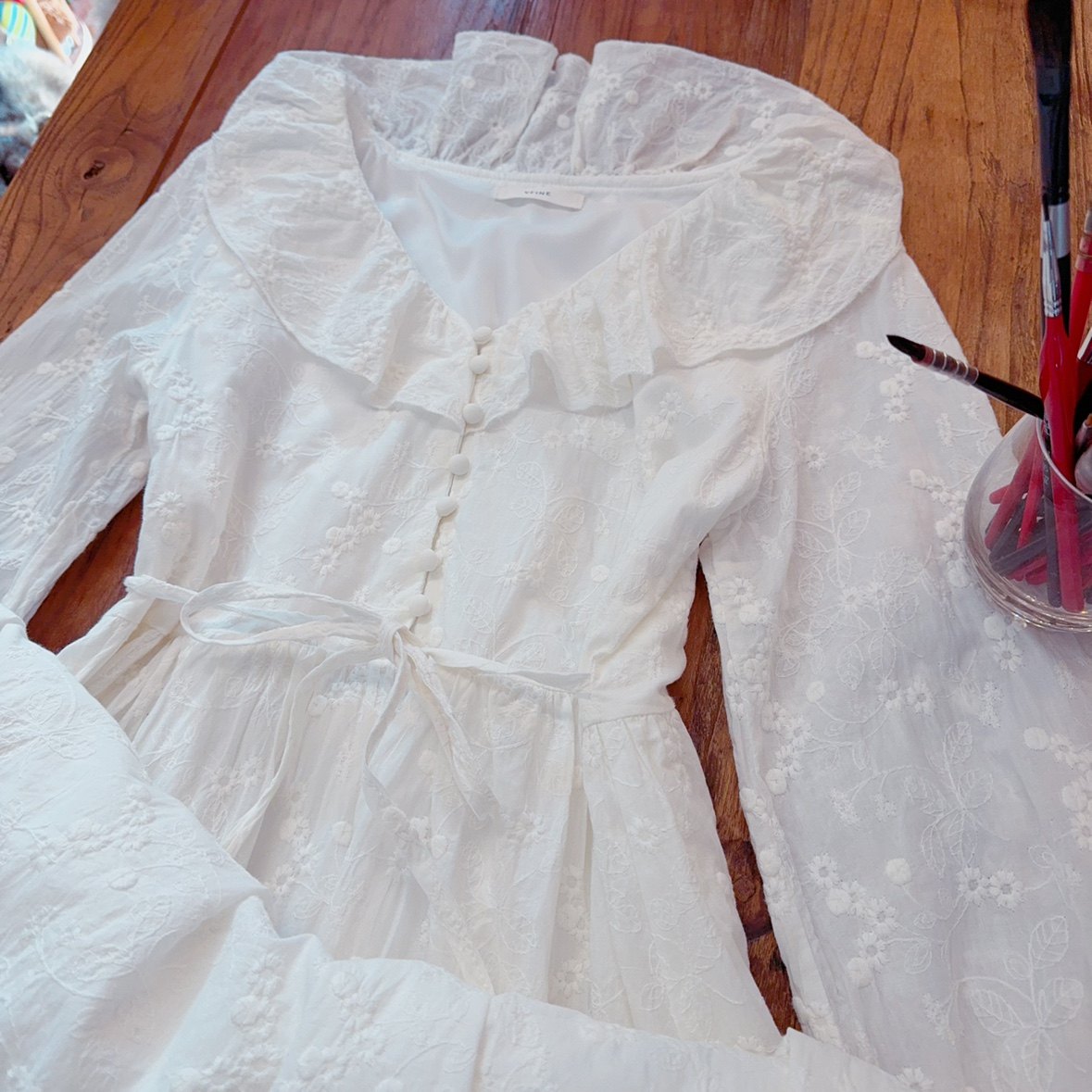 高品质 有内衬 腰部绑带 法式刺绣提花荷叶边 中长款白色连衣裙