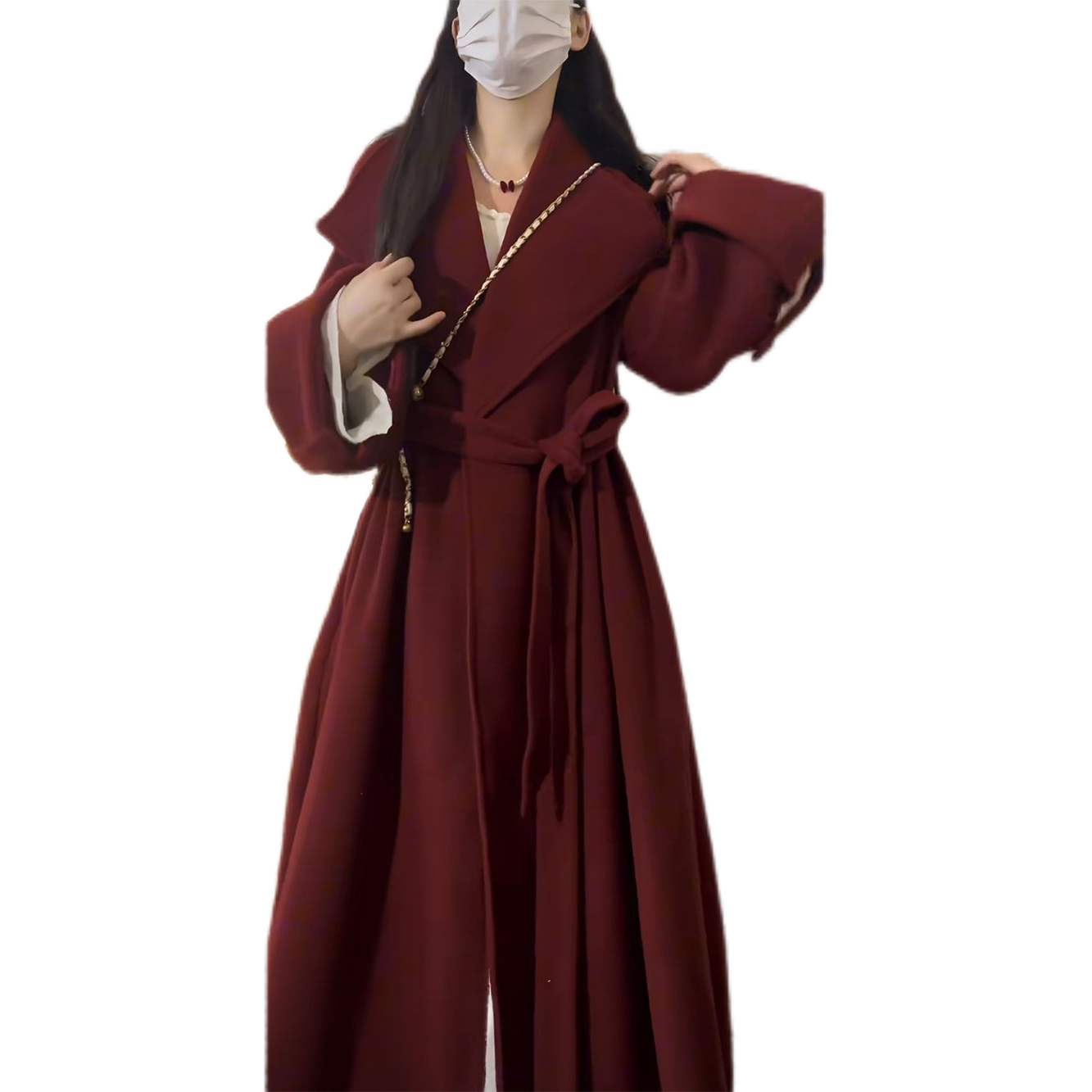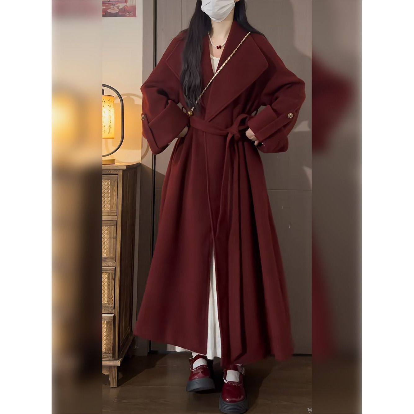 新年战袍赫本风中古毛呢大衣女秋冬季新款气质高级感红色长款外套