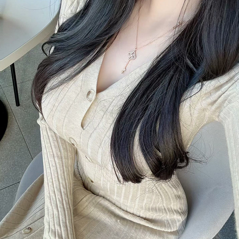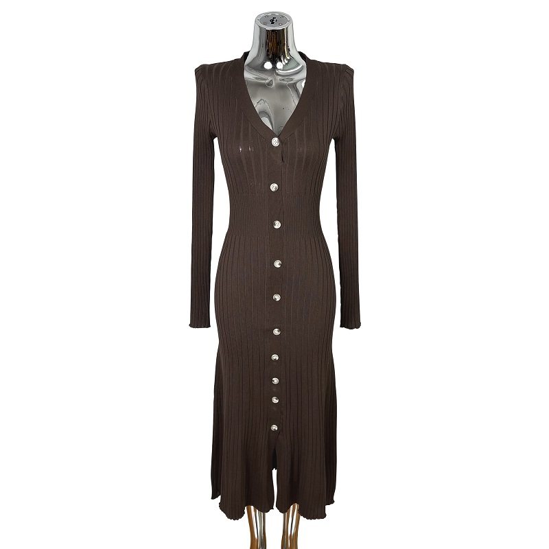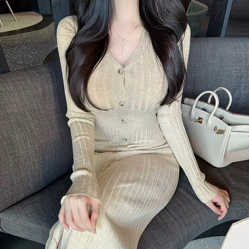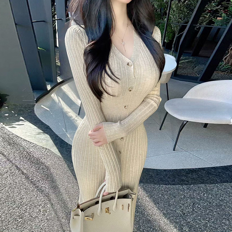 韩国东大门新款优雅高级感~性感小女人味单排扣长款针织连衣裙女