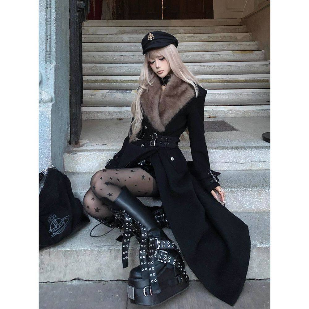 涩谷辣妹 冬季毛毛收腰修身朋克甜酷亚文化暗黑系中长款大衣套装