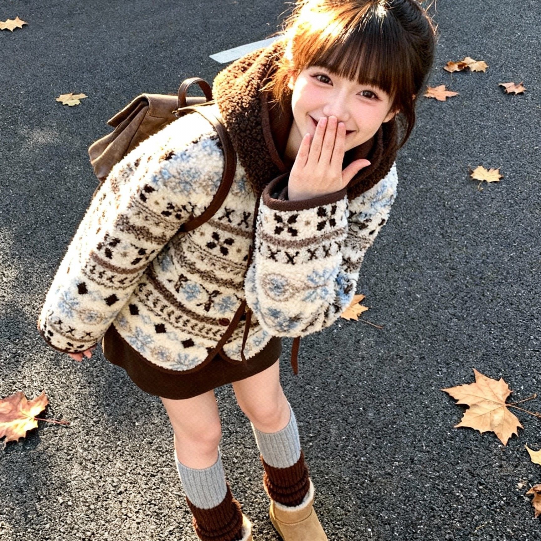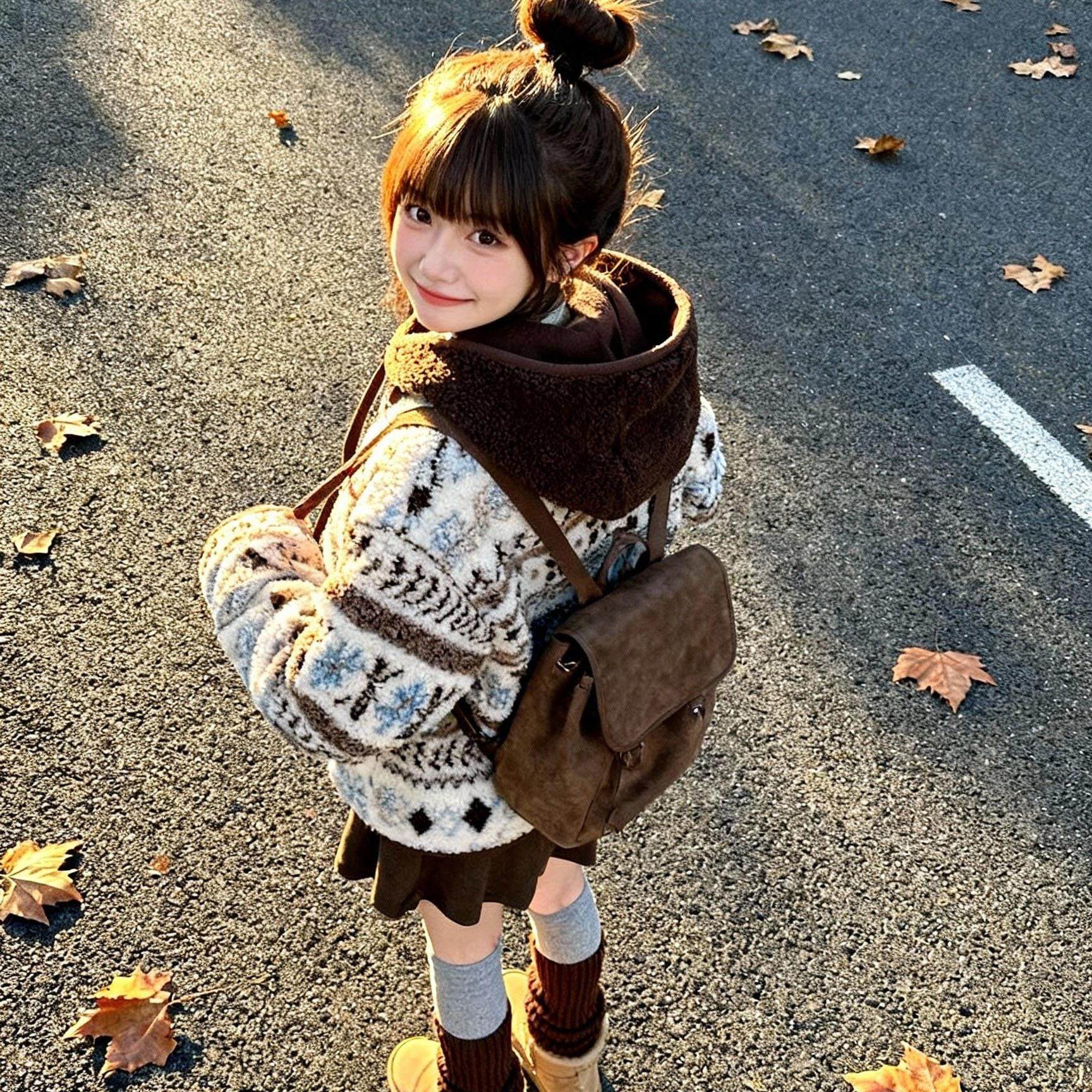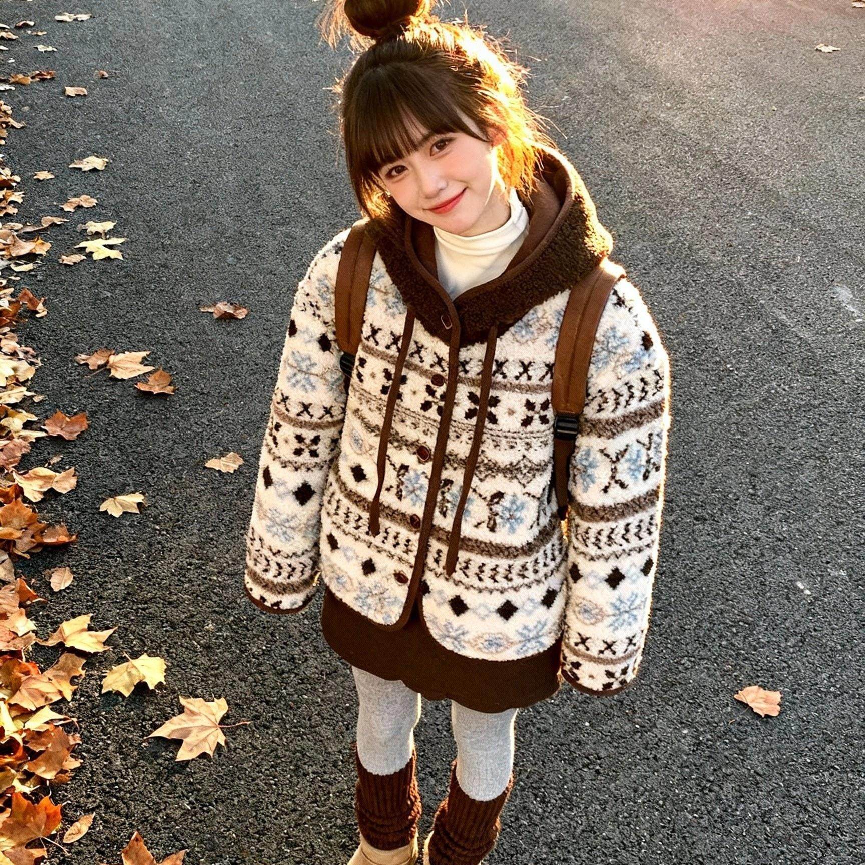 巨好看费尔岛羊羔毛连帽外套女2025深冬复古加厚摇粒绒小个子棉服