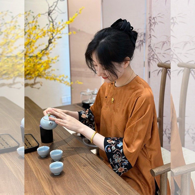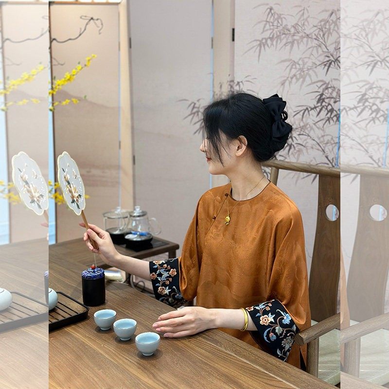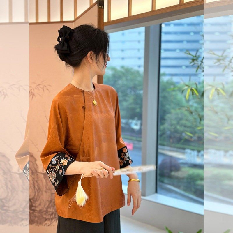 首页> 女装> 新中式国风宽松气质七分袖唐装上衣2026春季巨好看橙色提花衬衫女