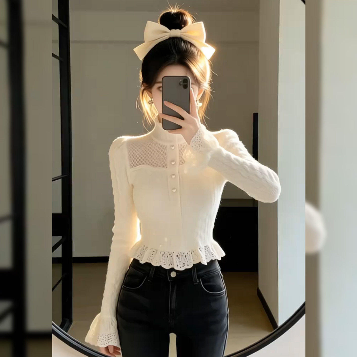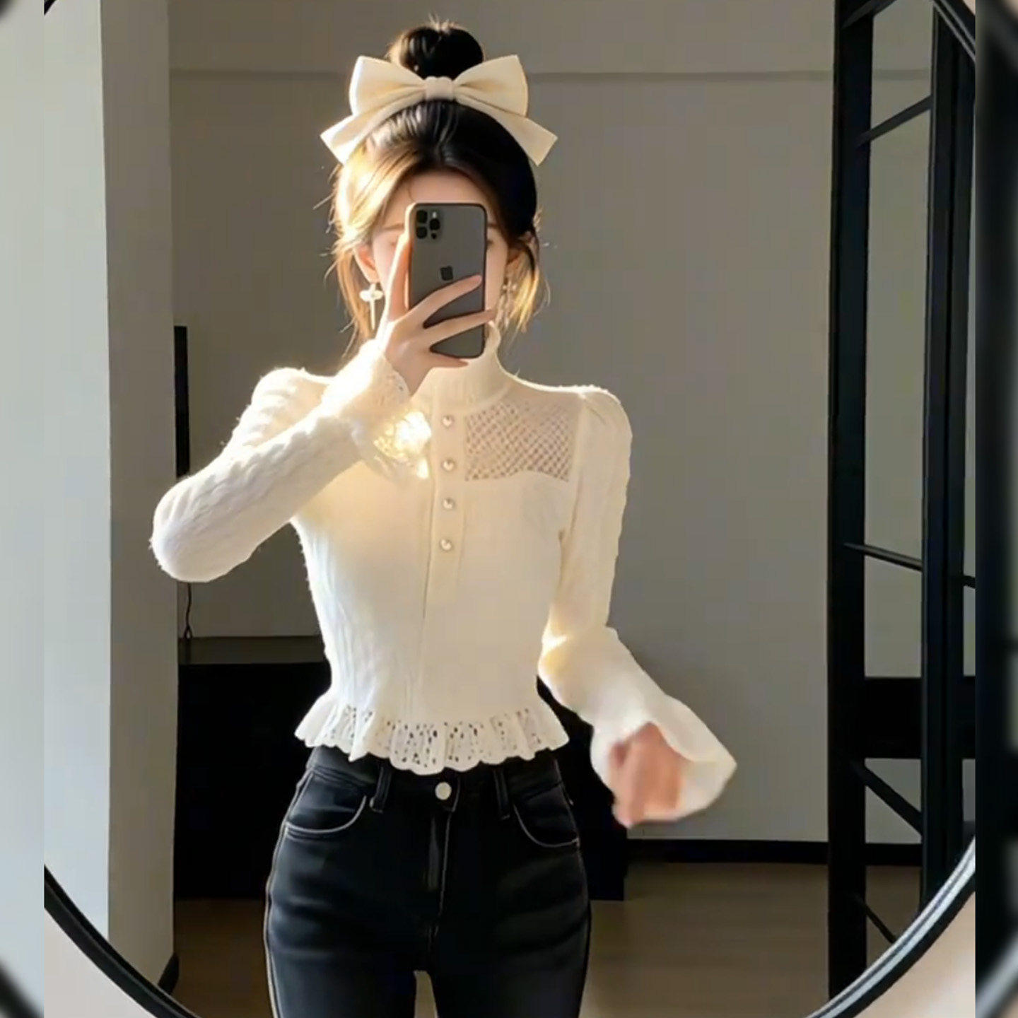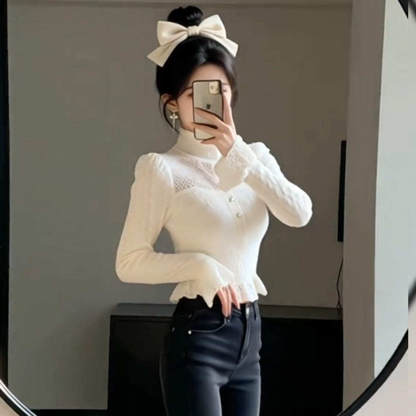 今年流行漂亮白色蕾丝上衣女装2026春季新款百搭高领绝美掐腰小衫