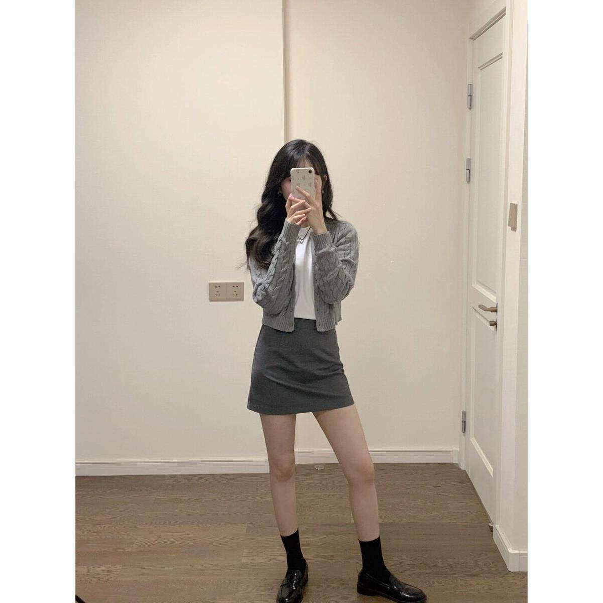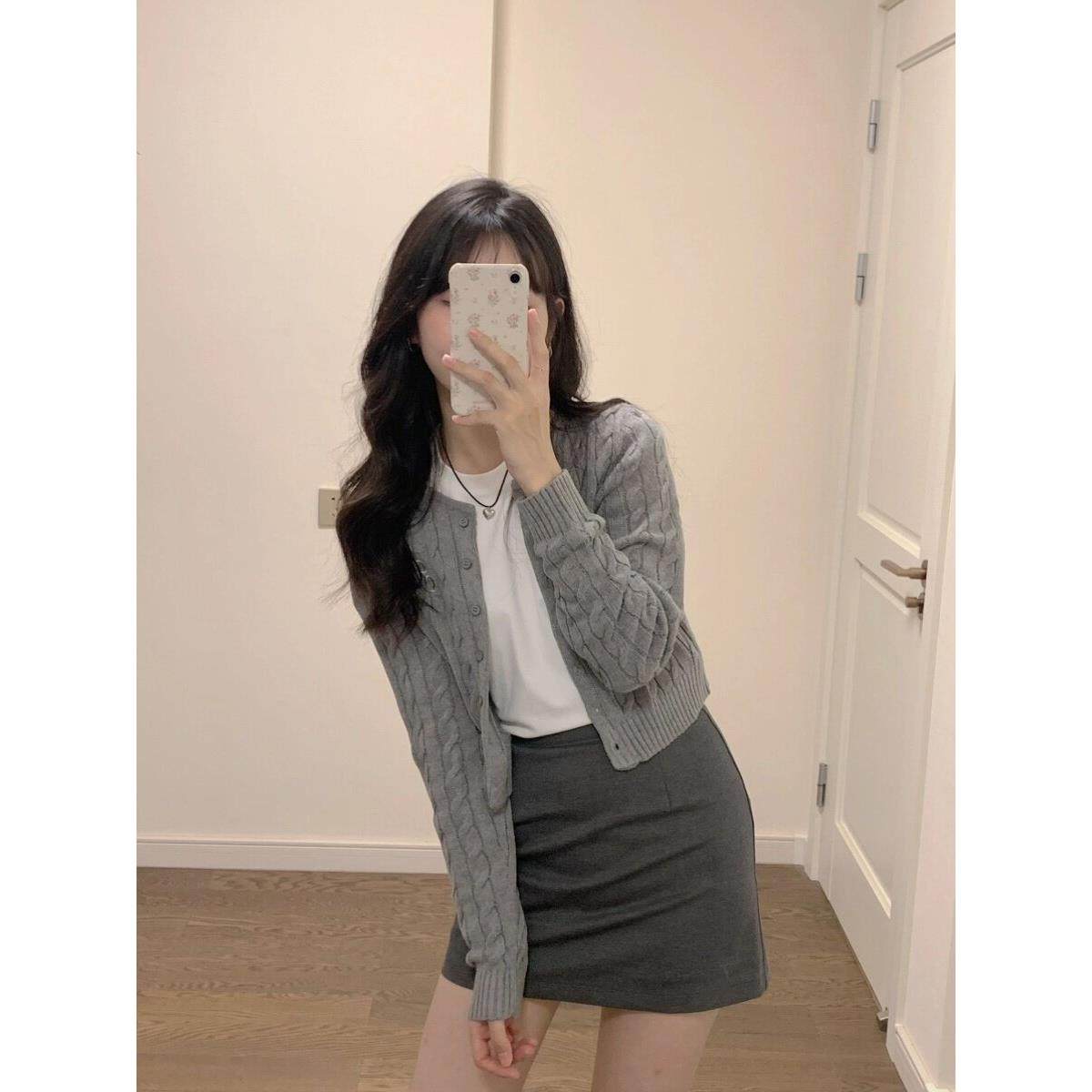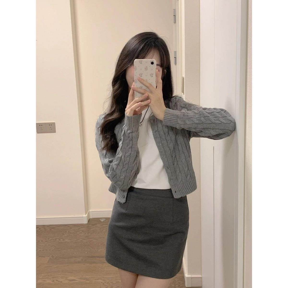 法国Rouje tusse灰色麻花羊绒毛衣针织开衫女修身羊毛短款外套潮