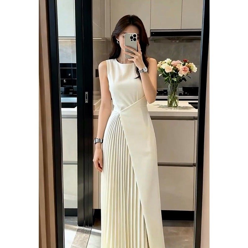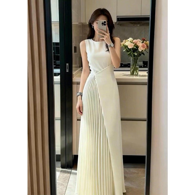重要场合漂亮晚礼服女2025新款高级感收腰白色百褶拼接无袖连衣裙