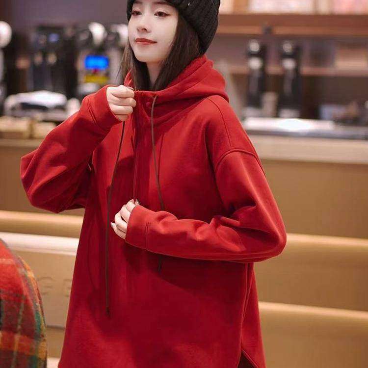 加绒红色连帽卫衣女内搭秋冬新款2025爆款时尚洋气韩系小个子外套