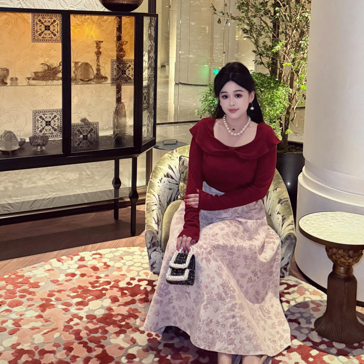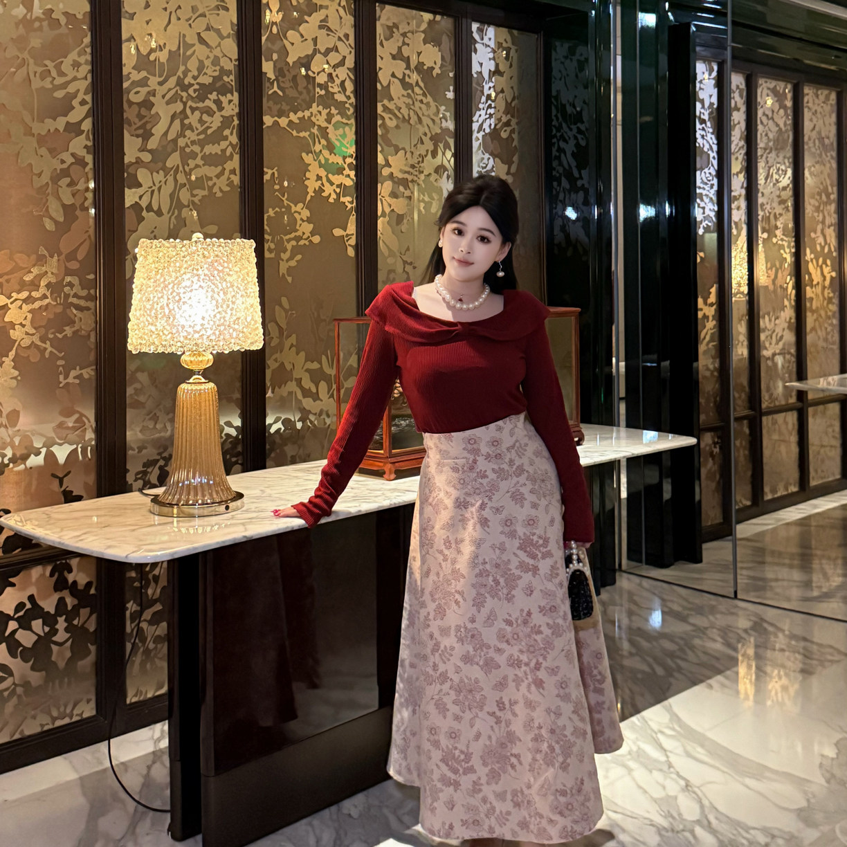 DATOO【红芭蕾】微胖大码法式气质红色上衣高腰A字半身裙套装