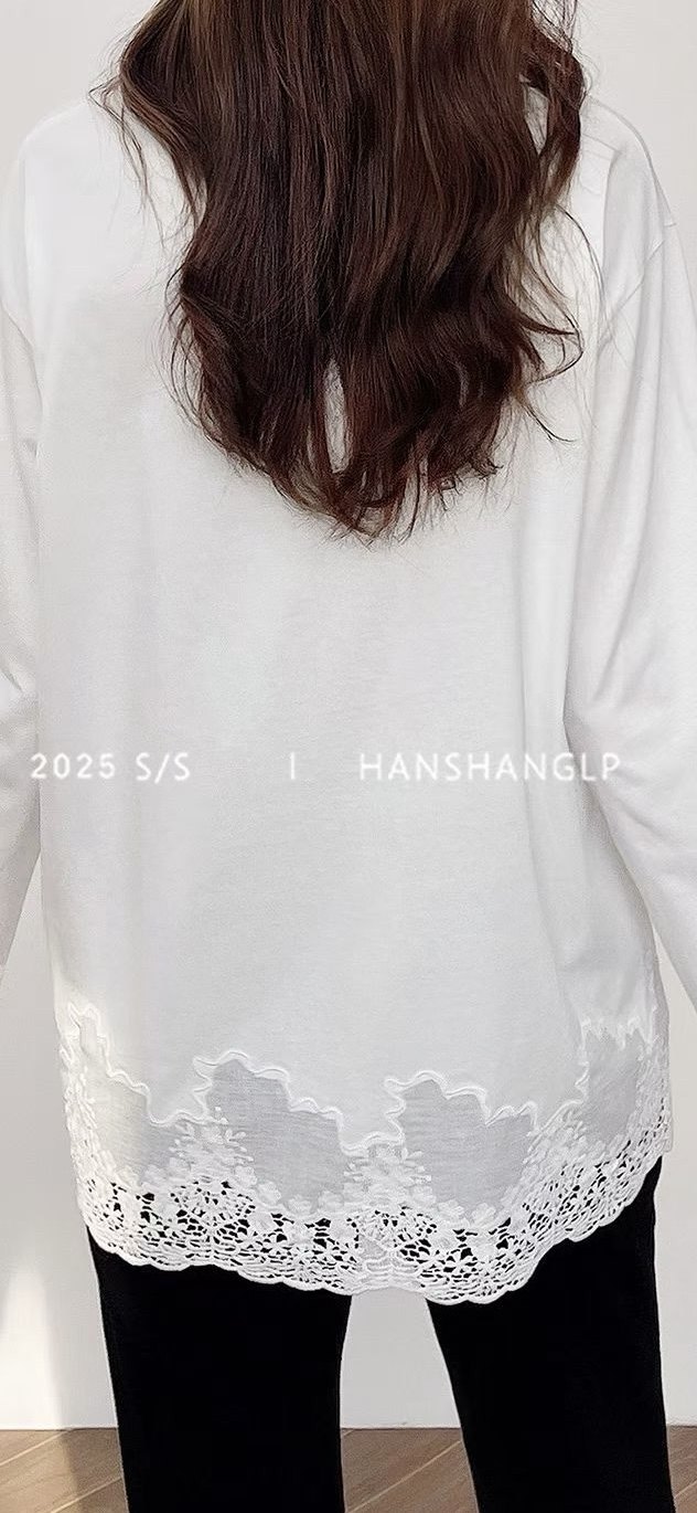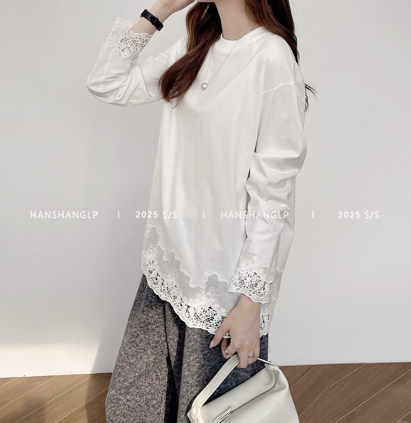 2026早春新款时尚百搭圆领长袖拼接蕾丝设计感女款宽松T恤上衣