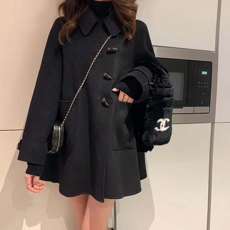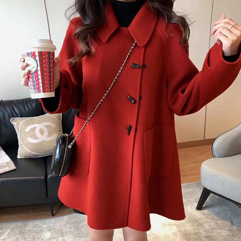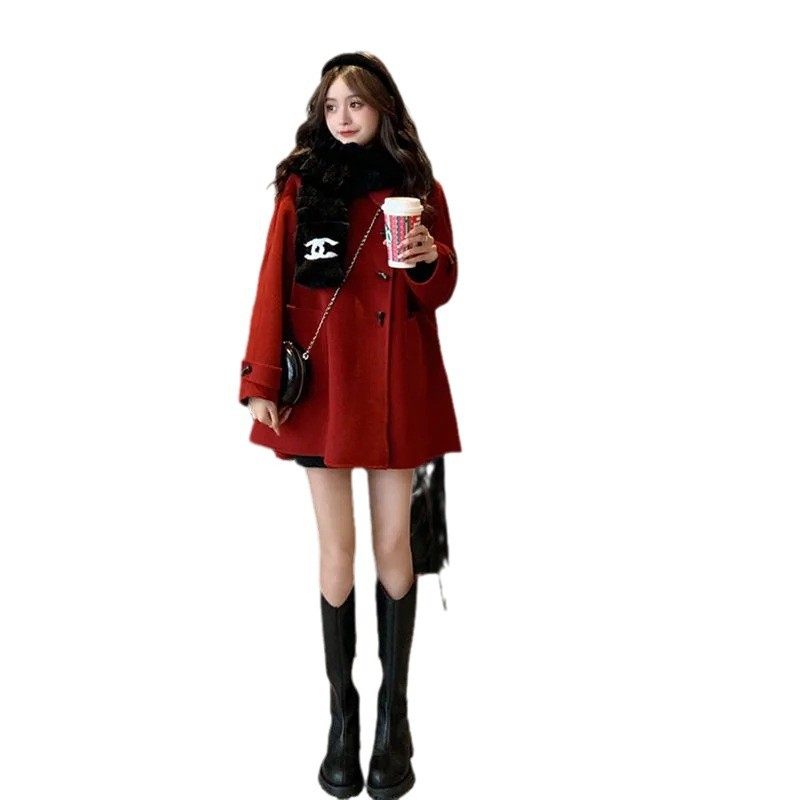 斗篷牛角扣呢子大衣2025年新款战袍红色小个子中长款毛呢外套女装