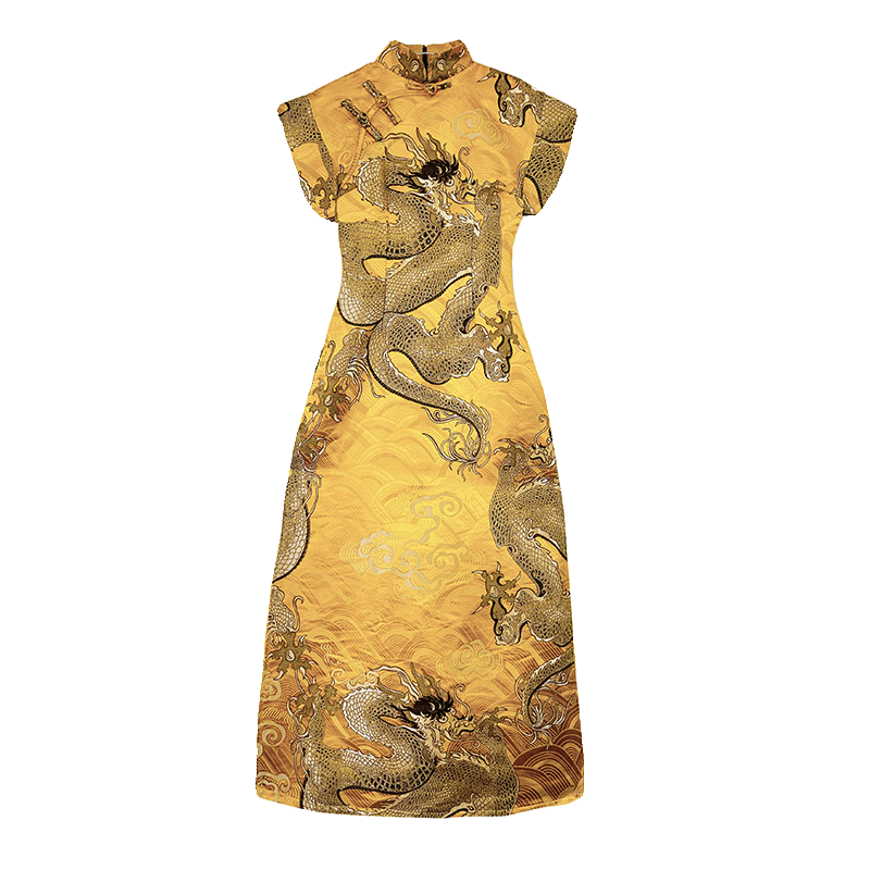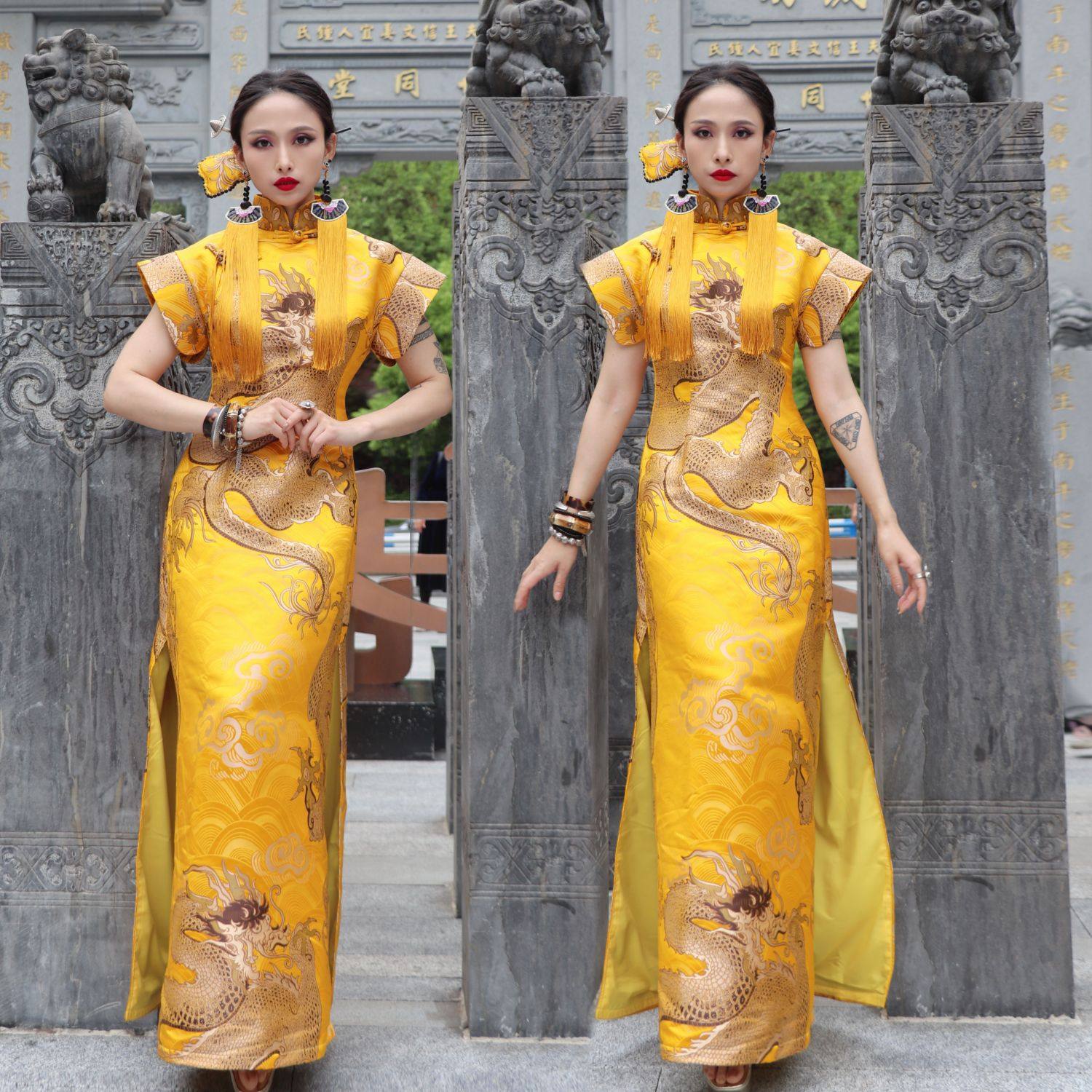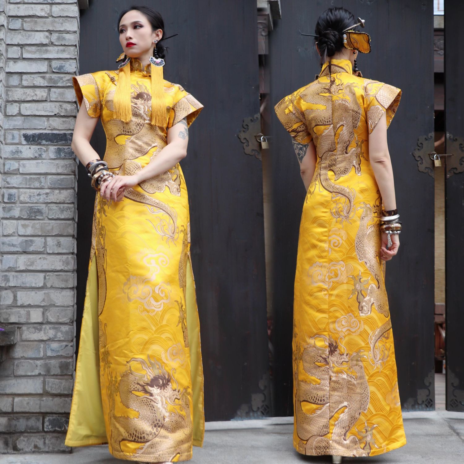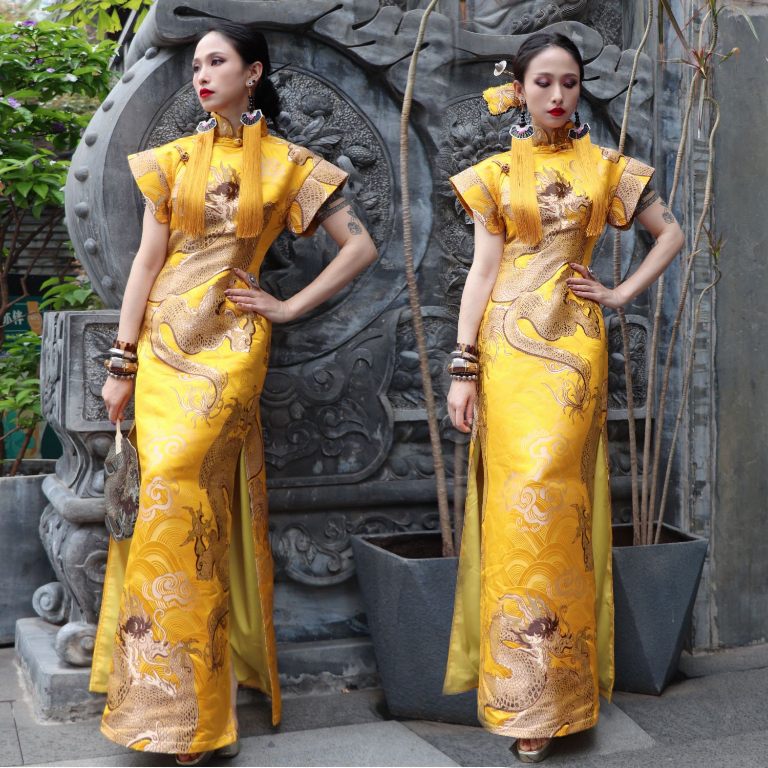 锦秀儿原创金黄色龙纹织锦立领飞袖国潮新中式走秀民族风改良旗袍