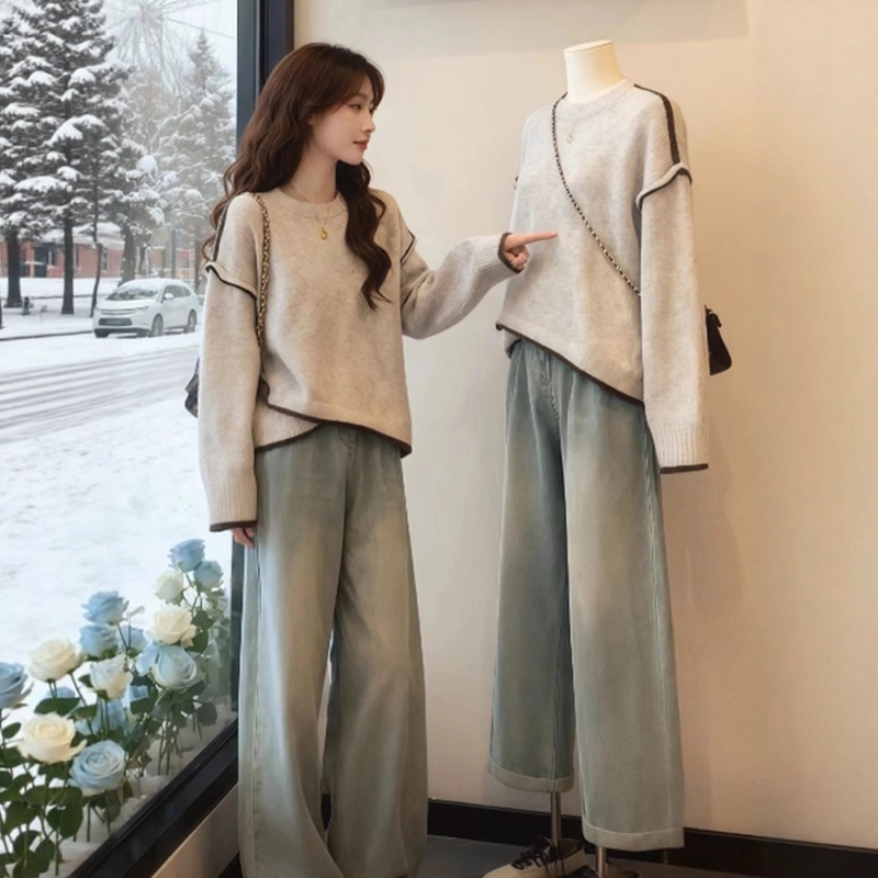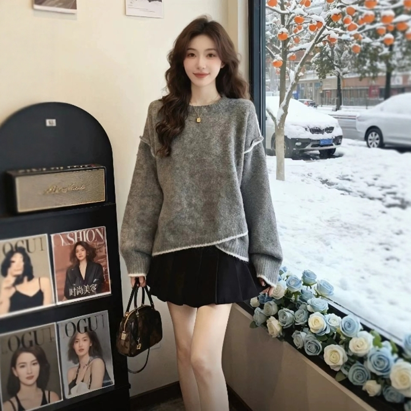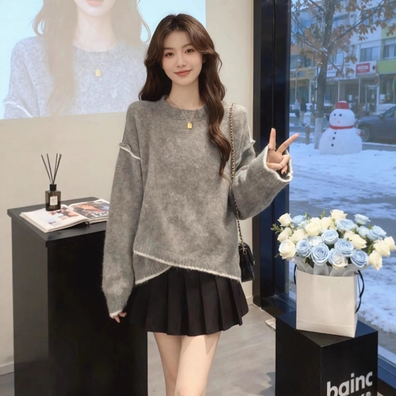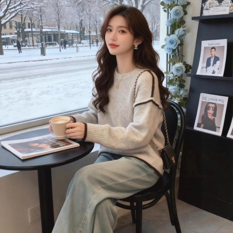 燕麦色奶呼呼软糯针织衫女秋冬新款大码胖MM圆领套头毛衣宽松上衣