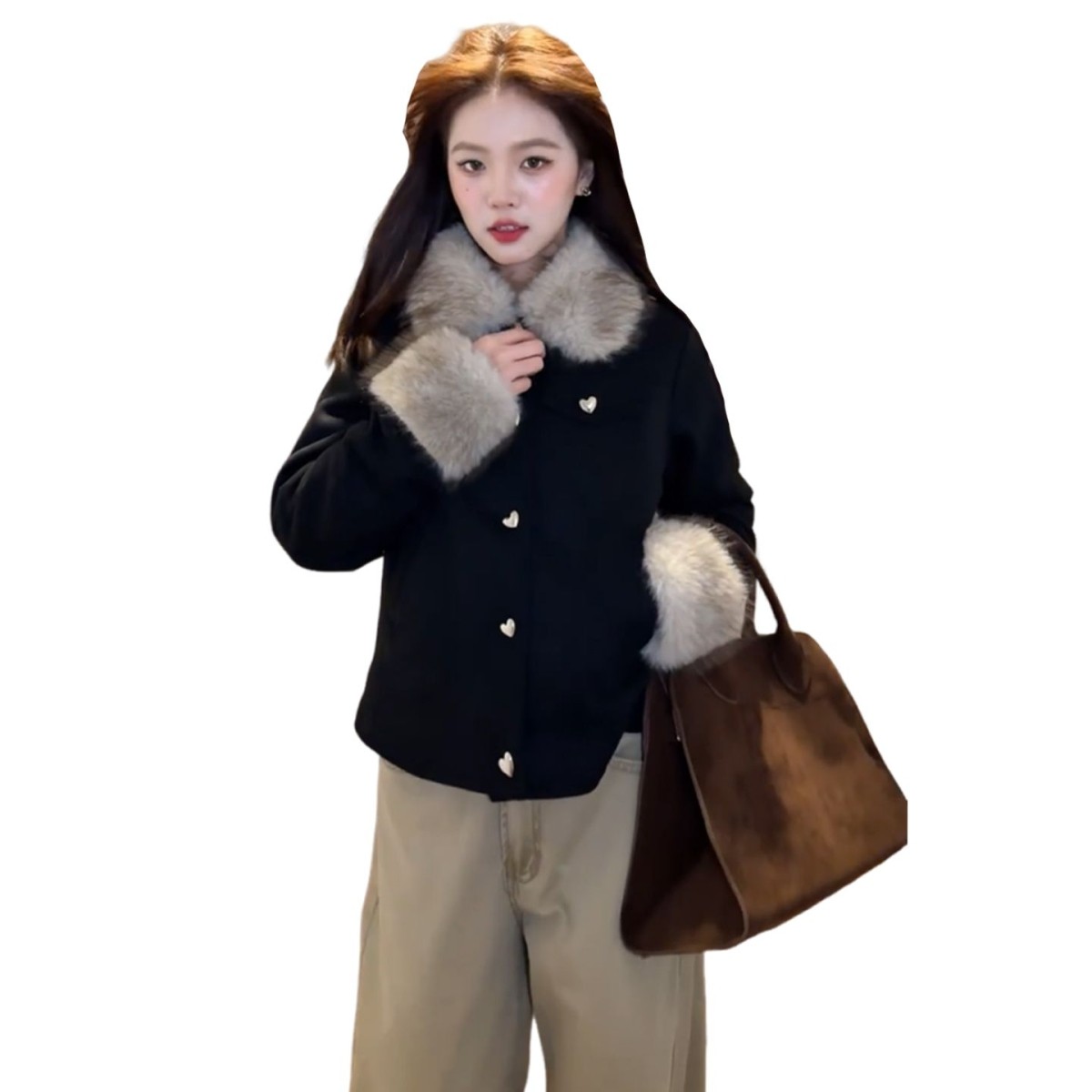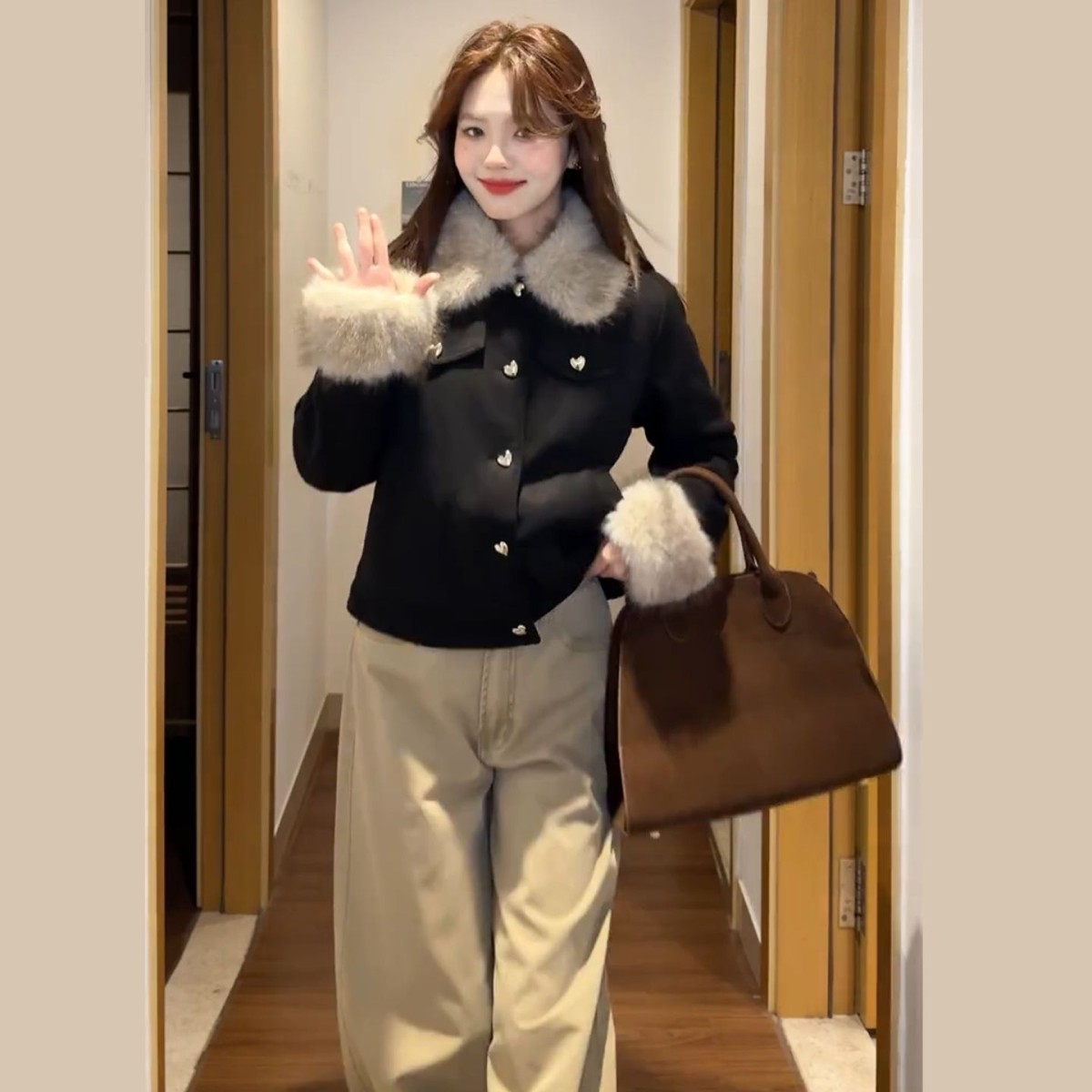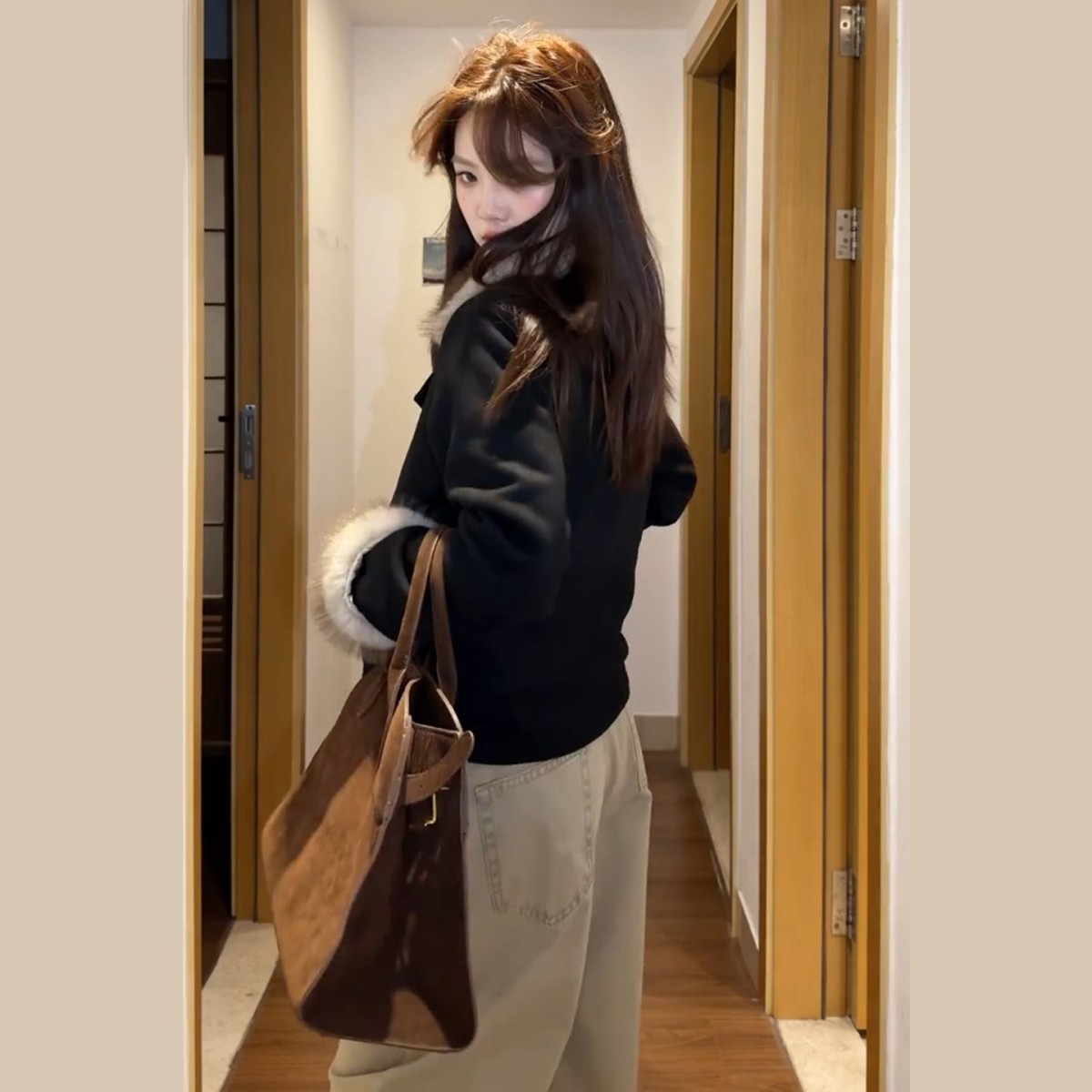 小香风黑色短款外套女冬季2025新款流行羊羔毛摇粒绒拼接加厚